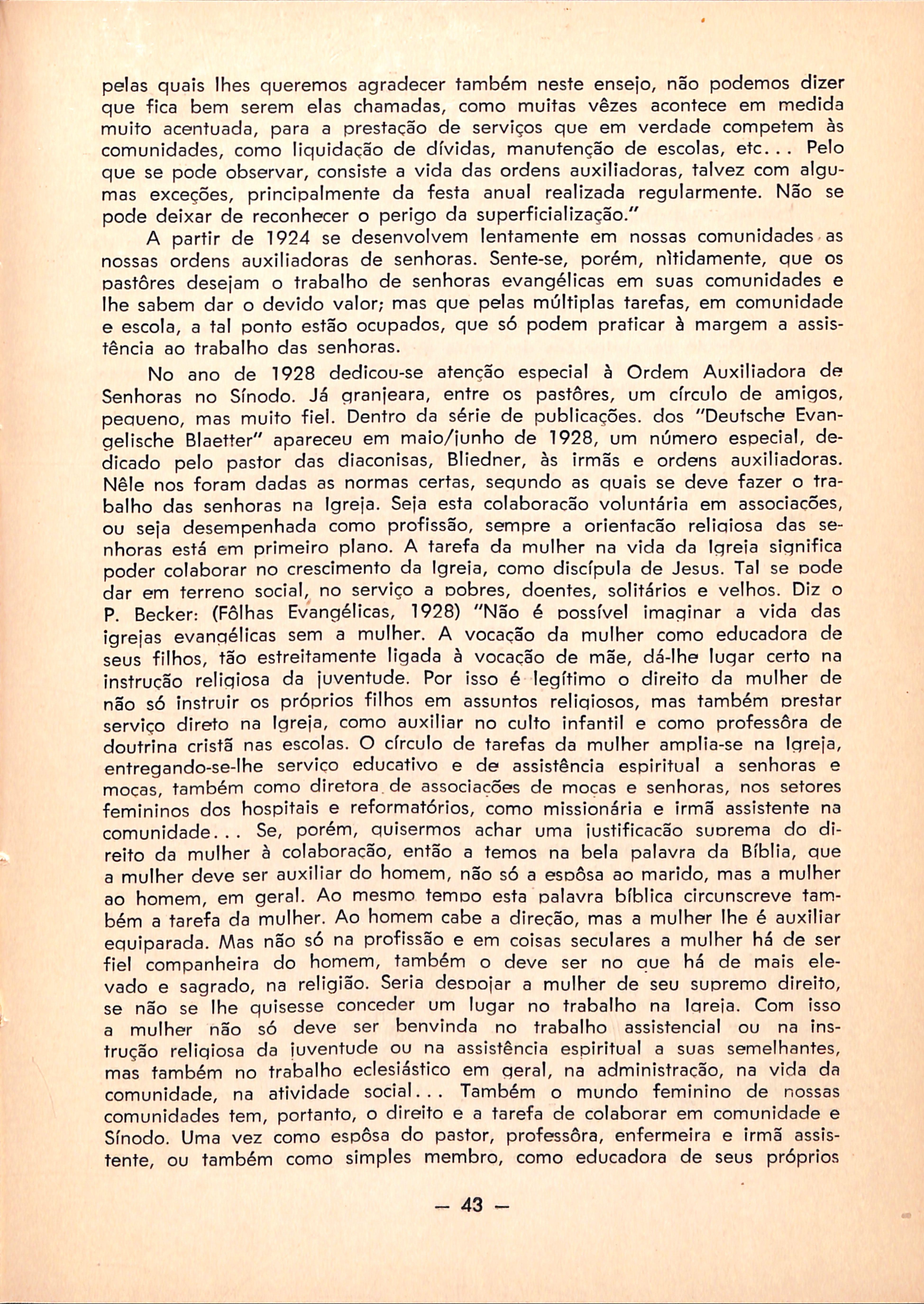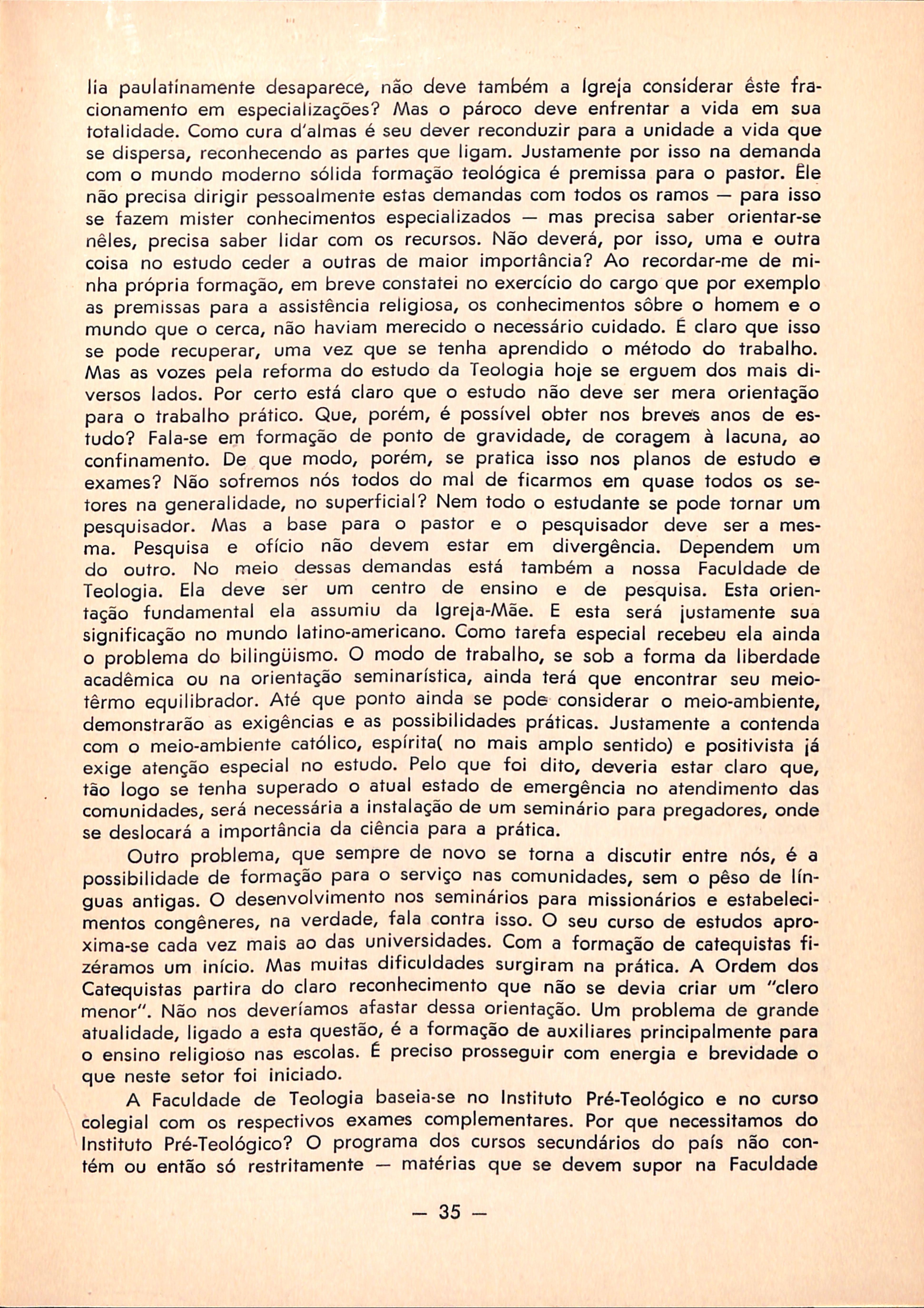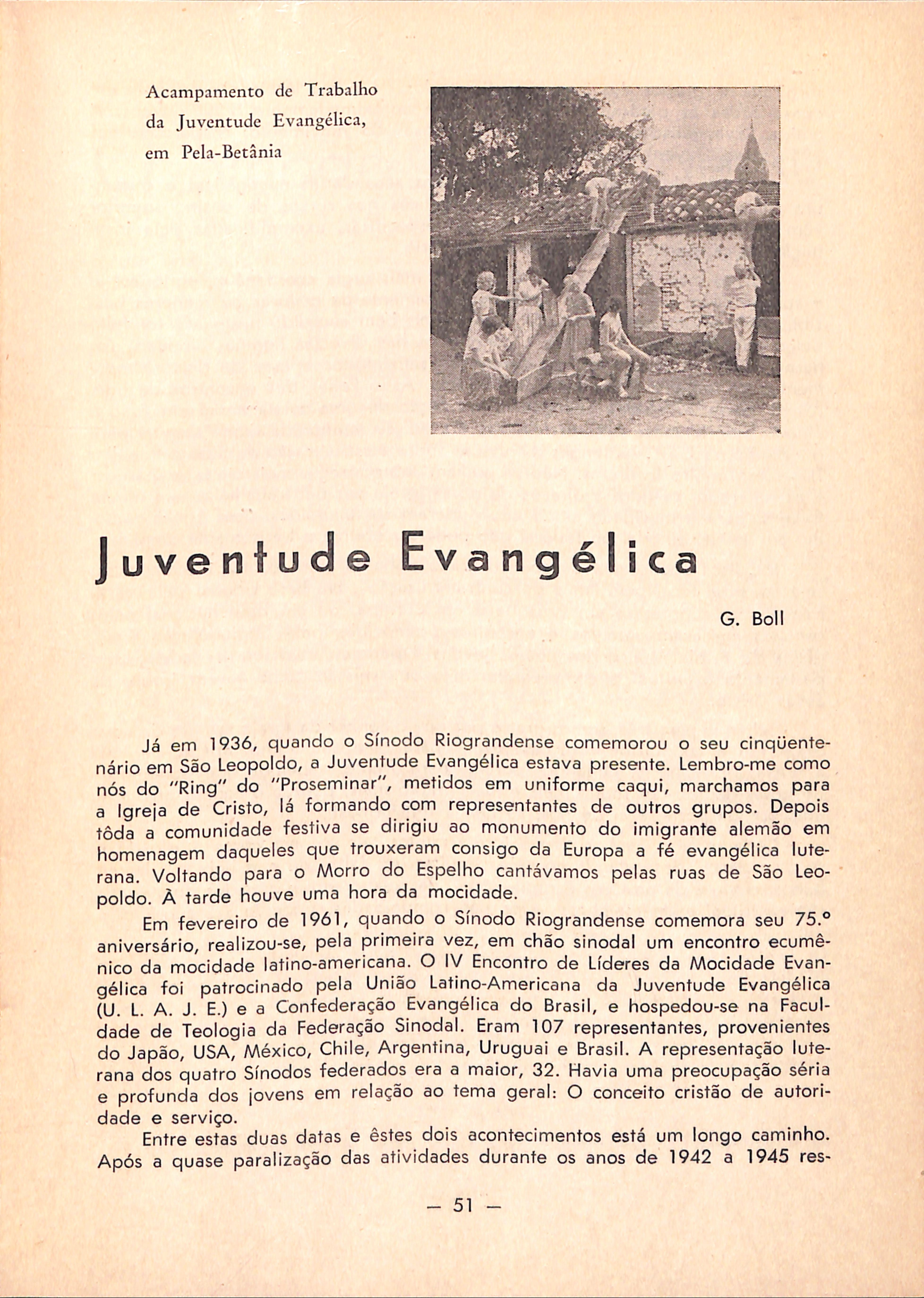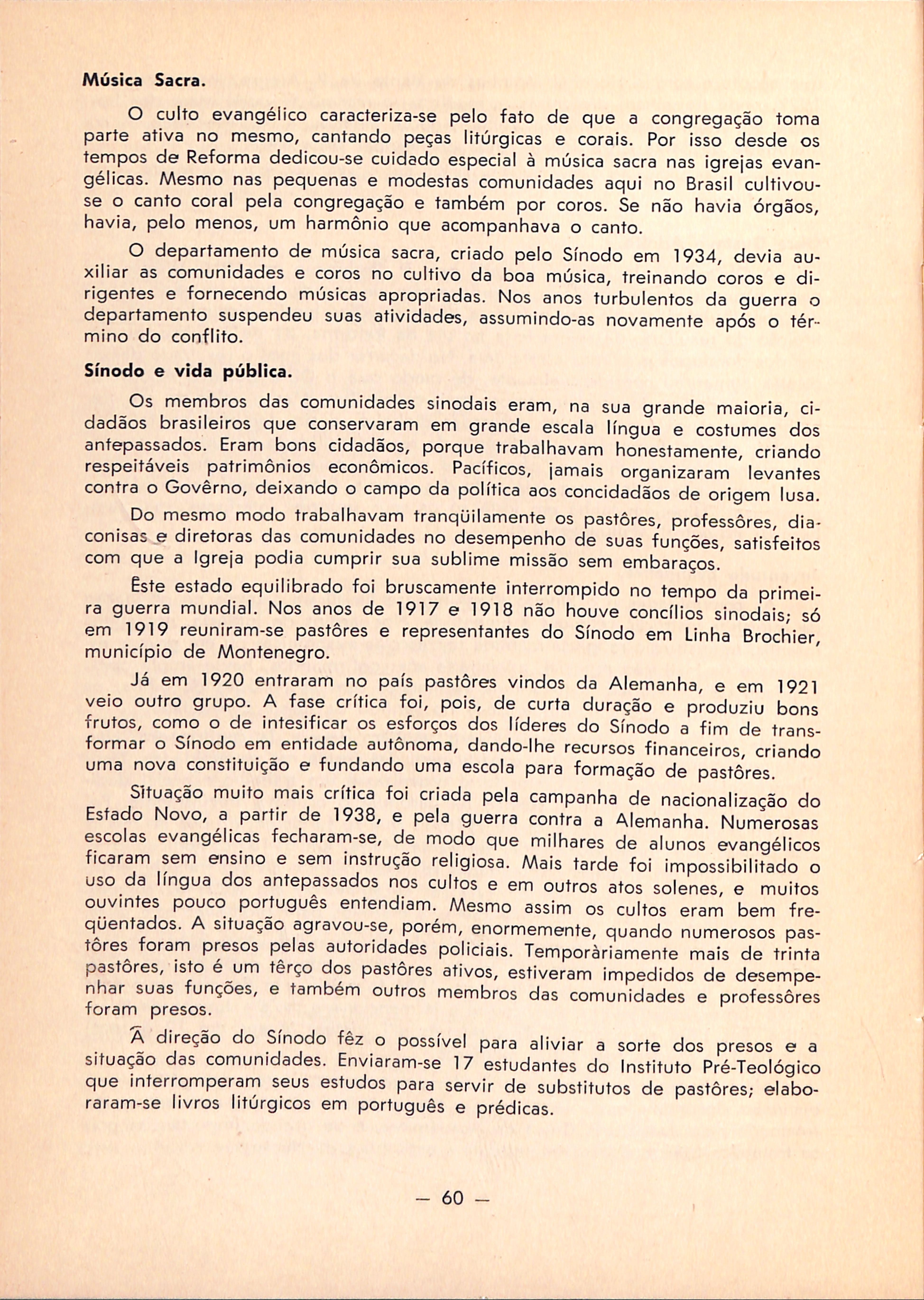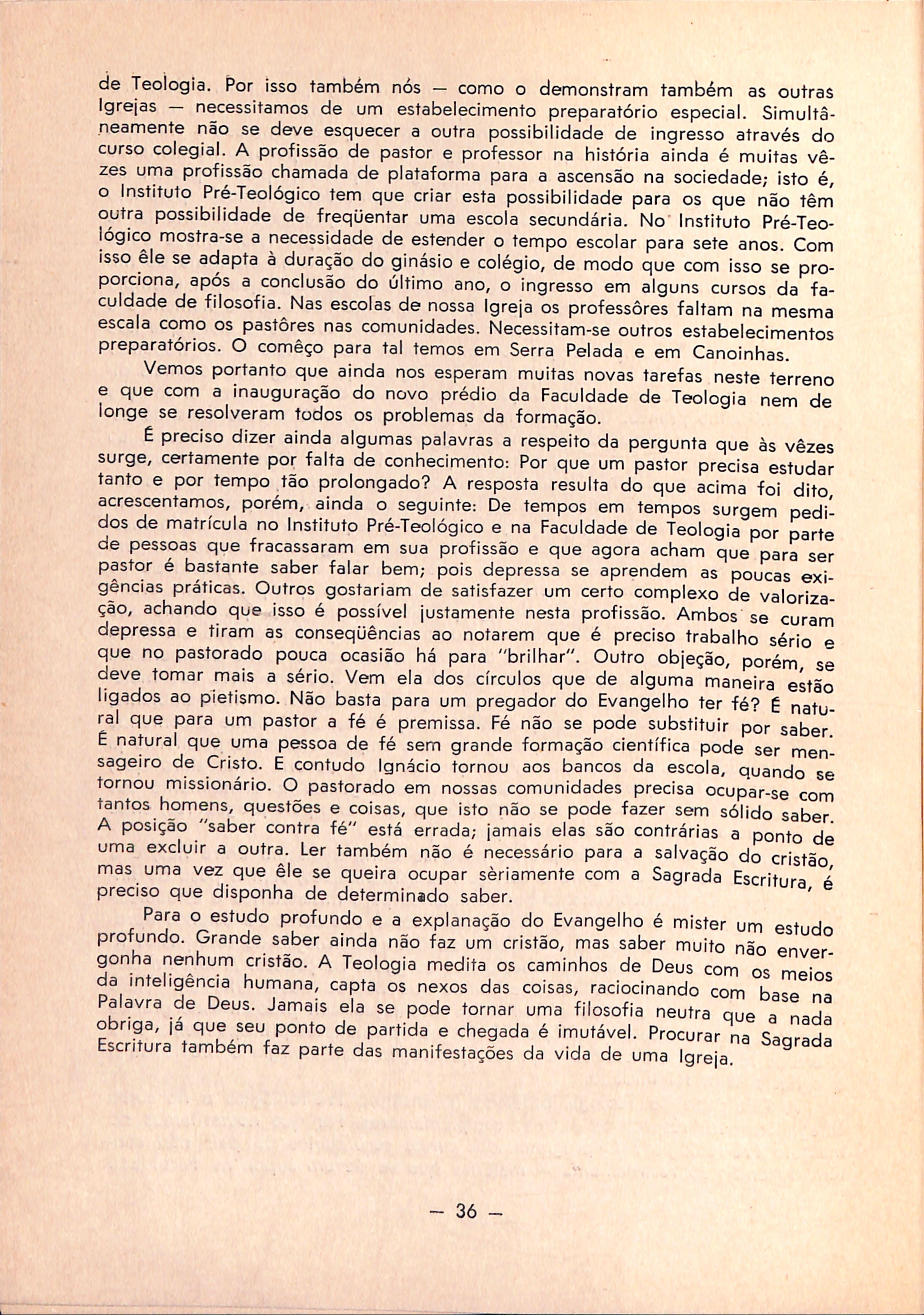 maioria de nossas crianças freqüenta escolas públicas e nós também temos a possibilidade de ministrar ensino religioso nas escolas públicas, temos dado, nos últimos tempos, maior valor à formação de professores e professôras evangélicos. Quanto à questão das línguas na vida das* comunidades, nos cultos e nos ofícios religiosos, é claro que não se pode adotar, pelo Sínodo, uma regularização uni forme, dependendo a solução desta questão da situação lingüística nas respecti vas comunidades.