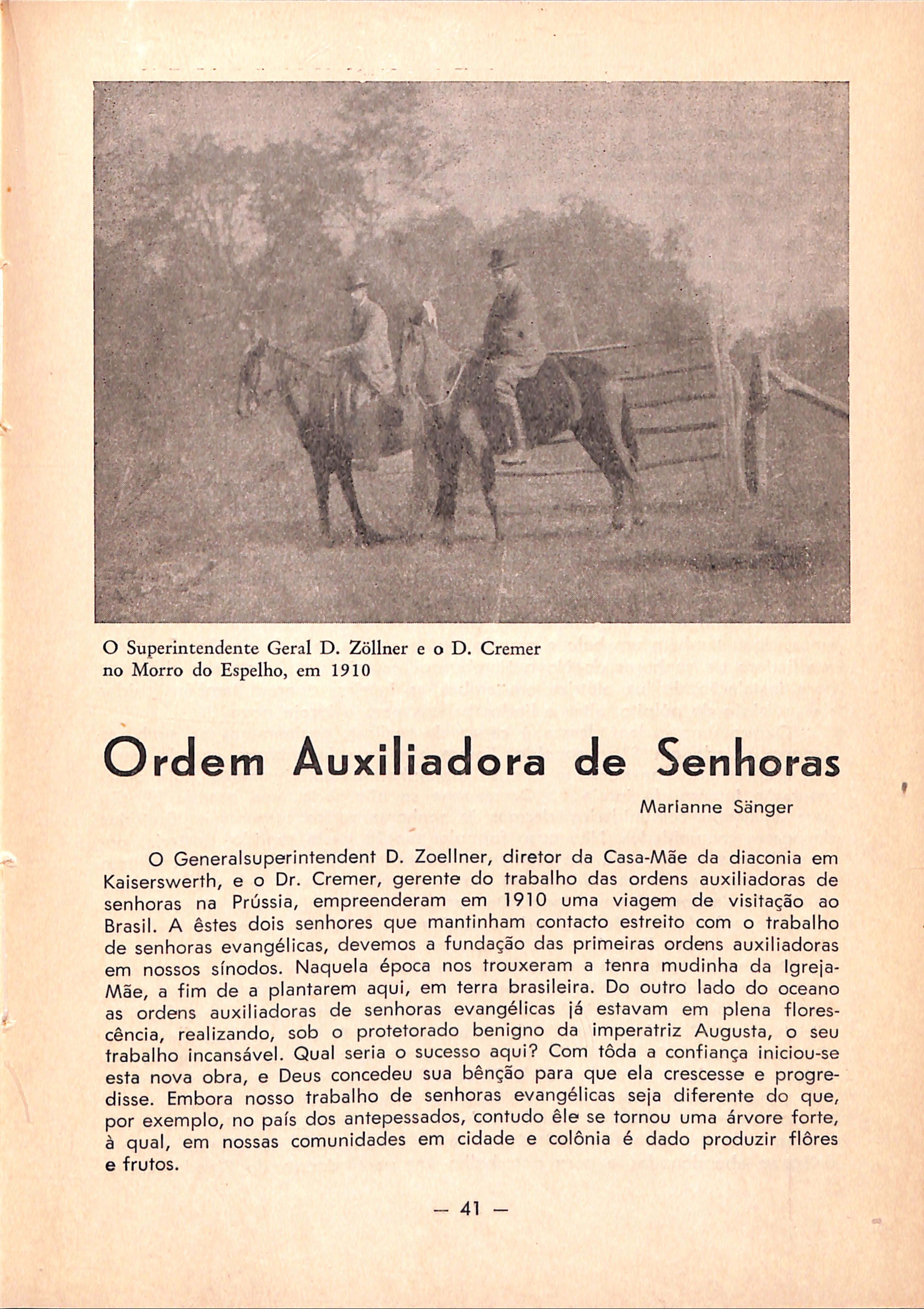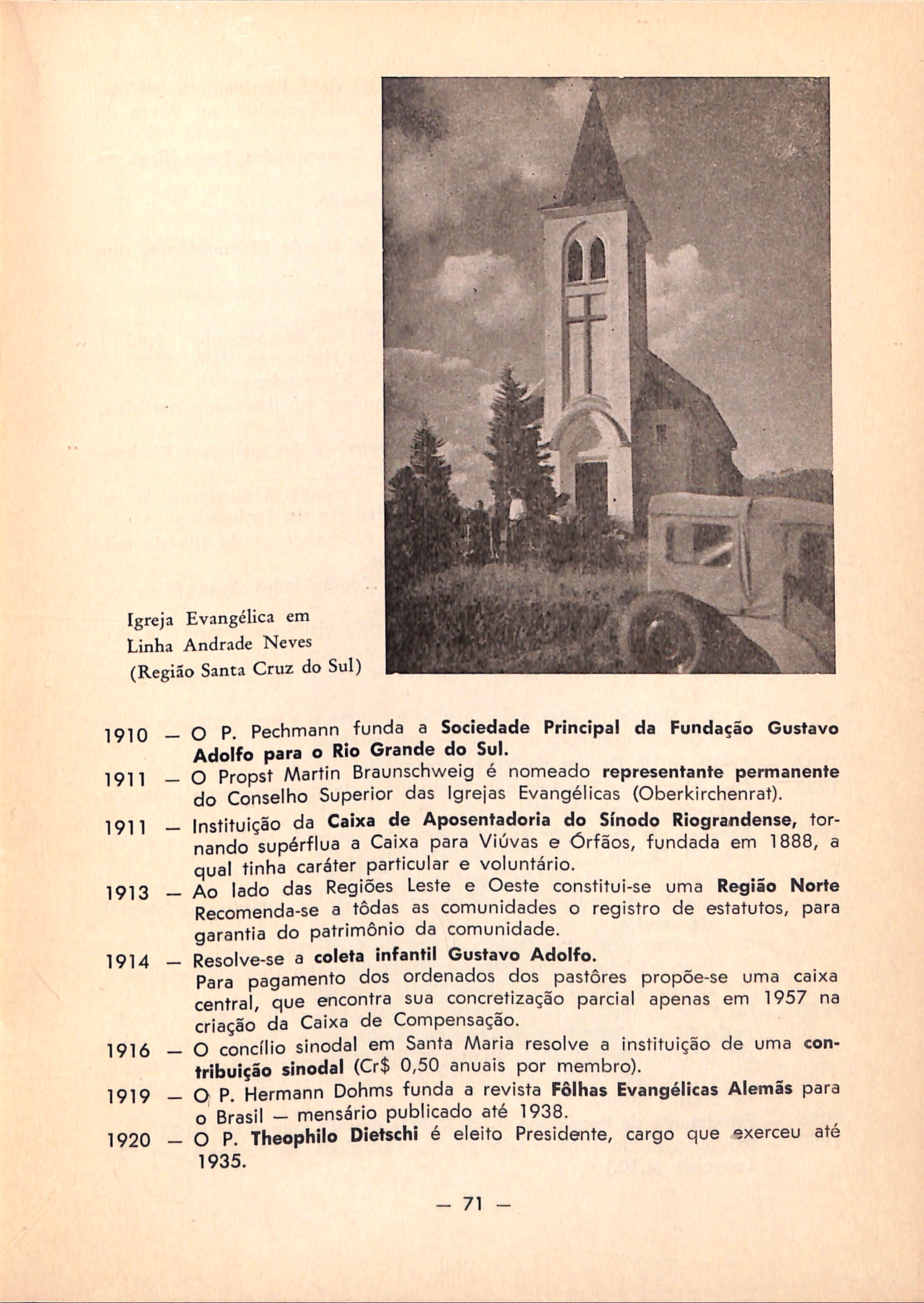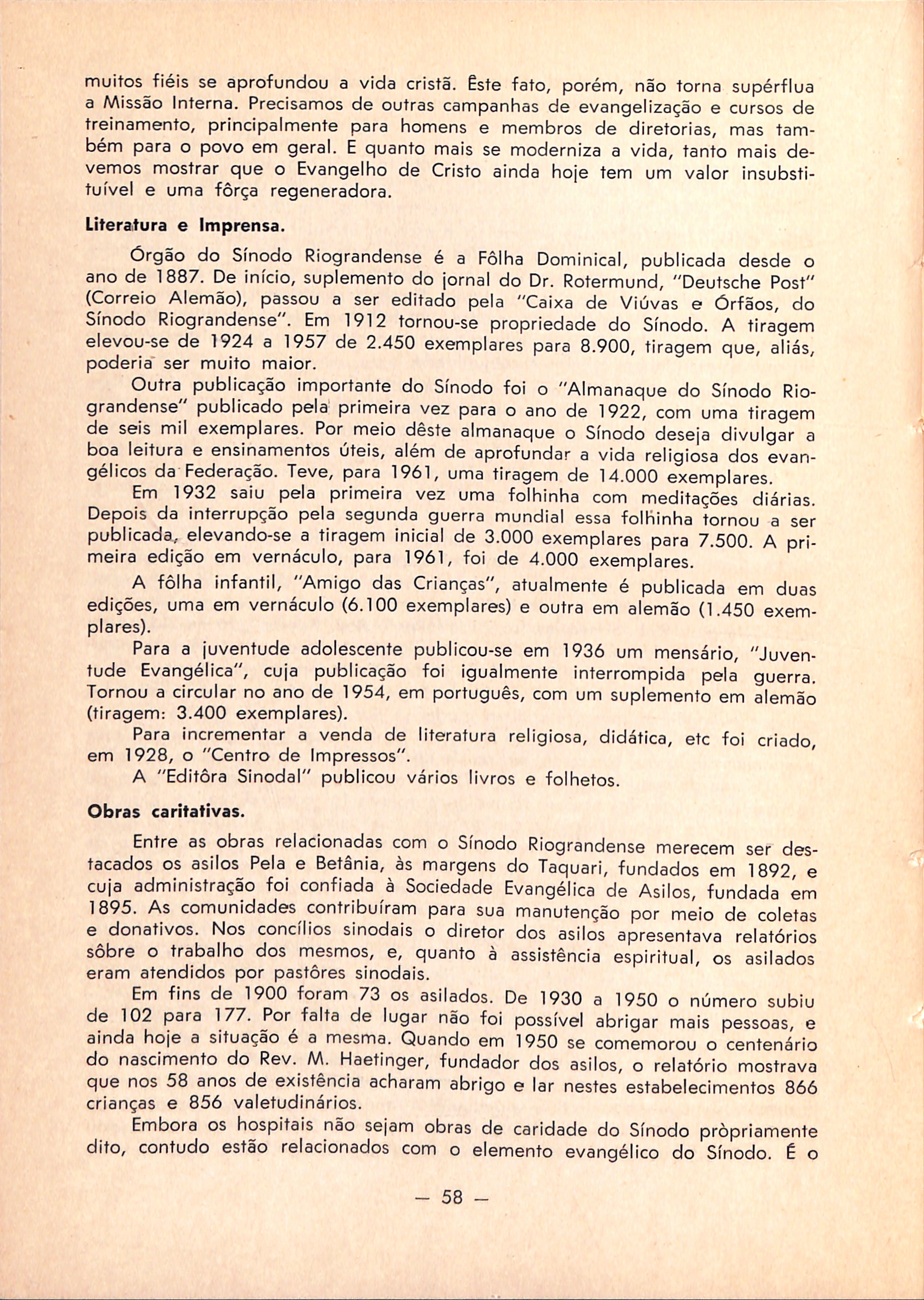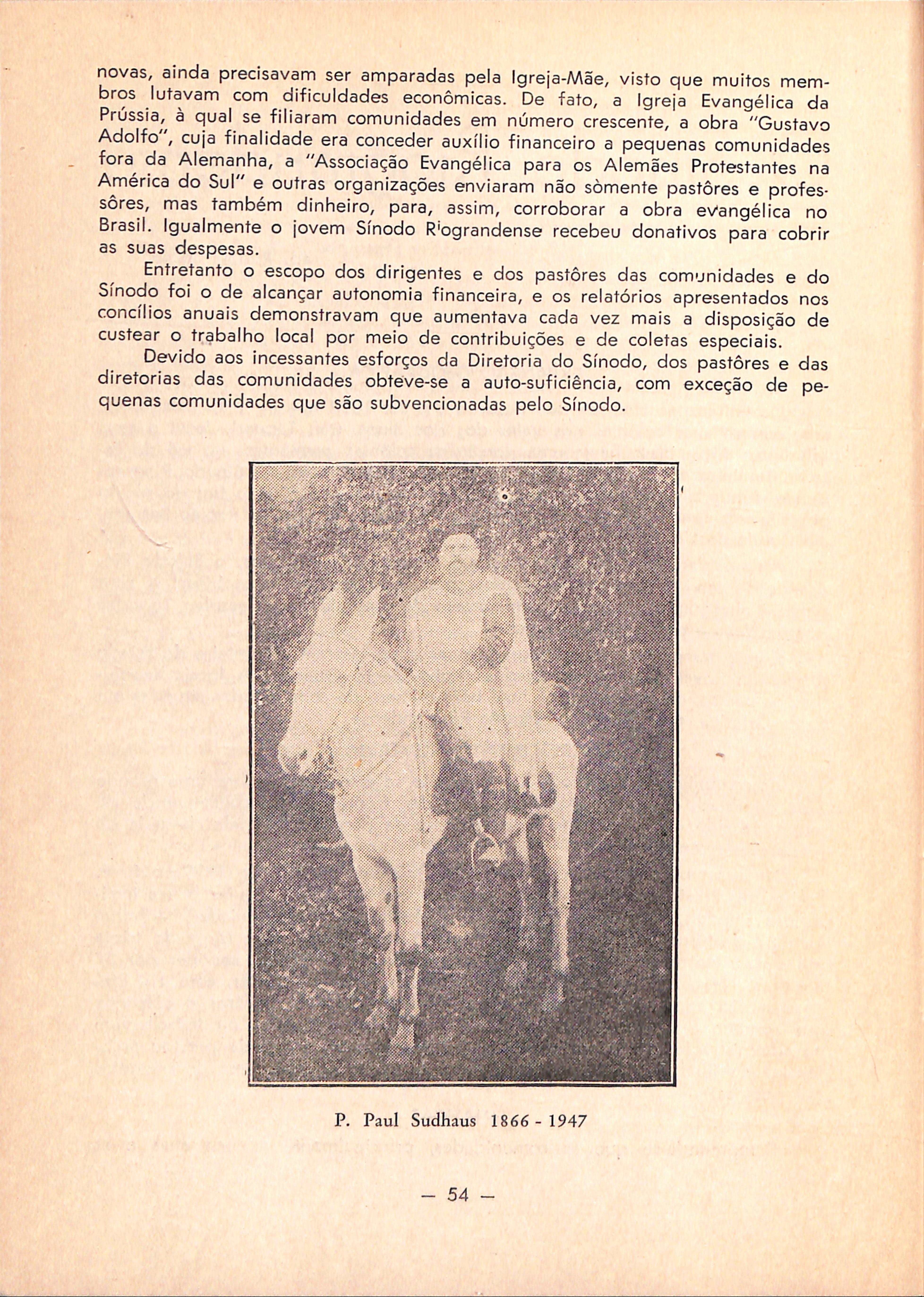 A fundação de um centro de publicações próprio a Íde^ eclesiástica, a fundação de uma caixa de aposentadorií empenho em prol dos ordenados dos pastôres mediantír pastores, o base s a suplemen.ação dire.a e indirS de o,dt,dl e"‘e°J' “"I zaçao mais rígida das finanças do Sínodo, tudo isso são'frutoq rt ^ que o Sínodo - sem auxílio de fora - dependia excTus vam ® 7
