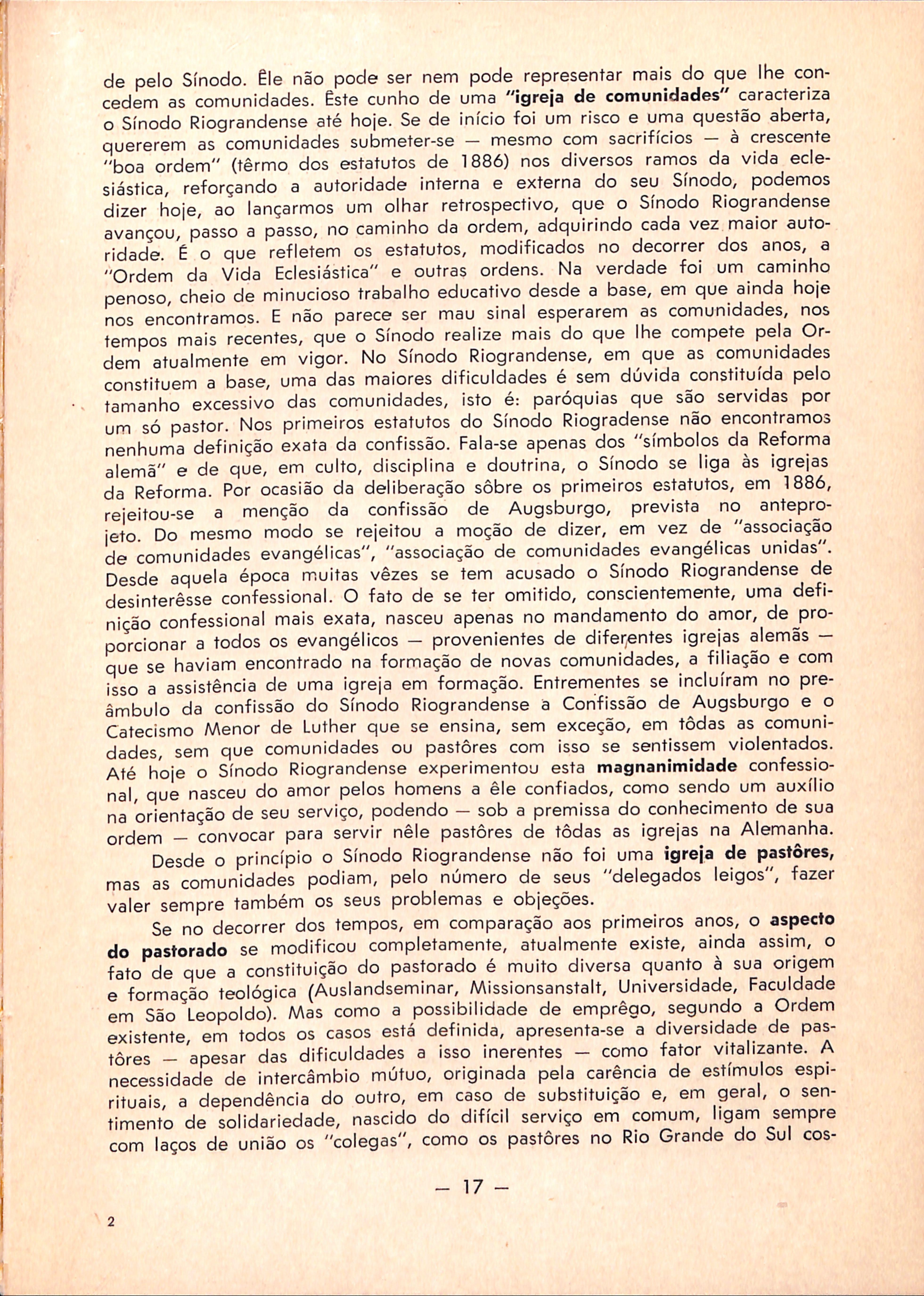 penoso nos constituem a base, uma tamanho excessivo das comunidades, isto é: paróquias que sao servidas por um só pastor. Nos primeiros estatutos do Sínodo Riogradense não encontramos huma definição exata da confissão. Fala-se apenas dos "símbolos da Reforma alemã" e de que, em culto, disciplina e doutrina, o Sínodo se liga às igrejas da Reforma. Por ocasião da deliberação sôbre os primeiros estatutos, em 1886, da confissão de Augsburgo, prevista no antepro2