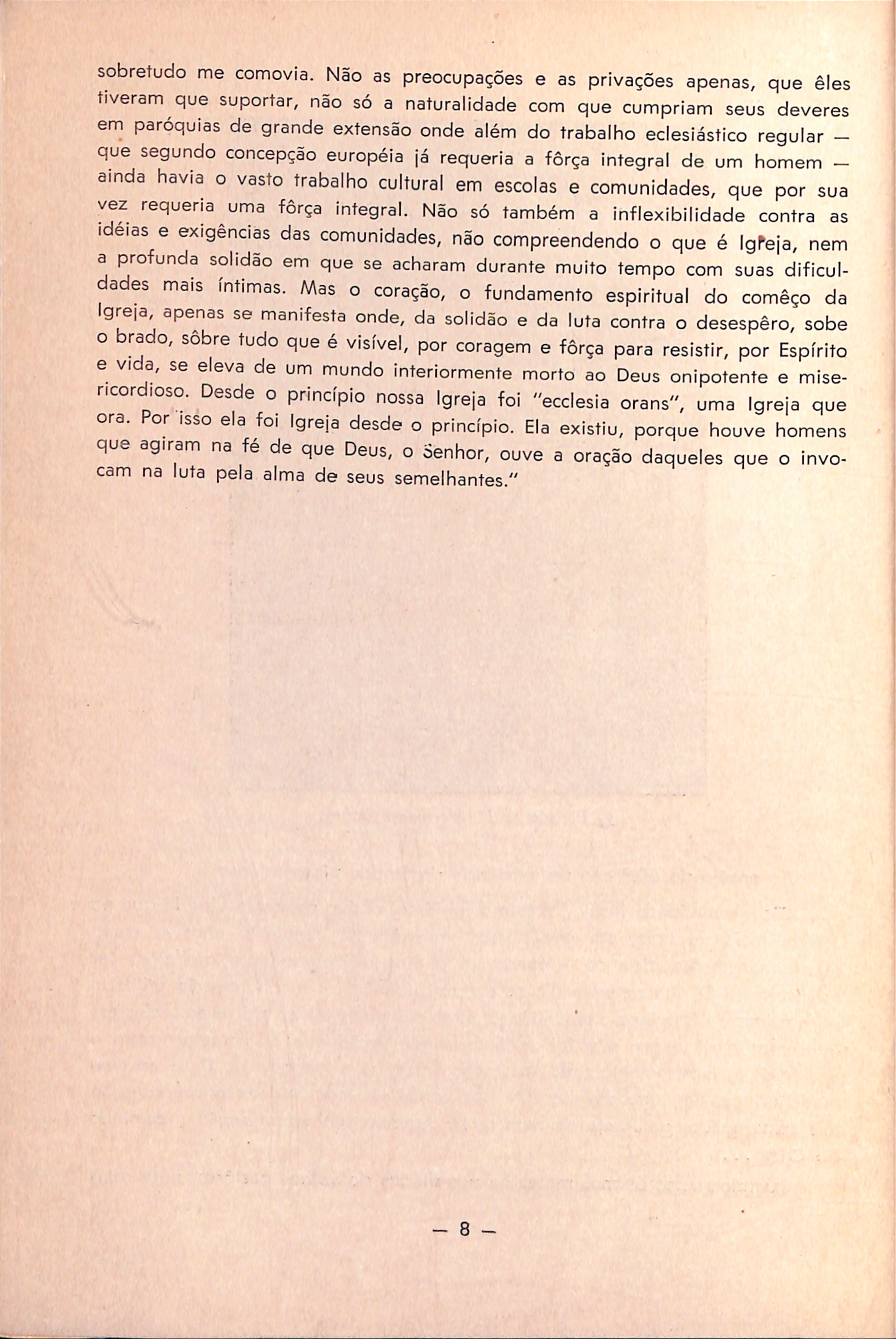 sobretudo me comovia. Não as preocupações e as privações apenas, que êles tiveram que suportar, não só a naturalidade com que cumpriam seus deveres paróquias de grande extensão onde além do trabalho eclesiástico regui que segundo concepção européia já requeria a fôrça integral de ainda havia o vasto trabalho cultural em escolas e comunidades.