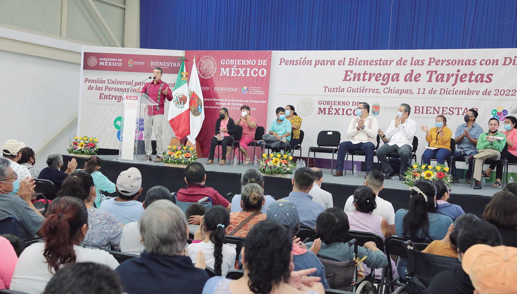 HERMES GARCÍA / PORTAVOZDurante la entrega de más de 17 mil Tarjetas de Bienestar por la universalidad de la Pensión para el Bienestar de las Personas con Discapacidad Permanente, en Tuxtla Gutiérrez, con inversión conjunta a partes iguales entre el estado y la Federación, el gobernador Rutilio Escandón Cadenas externó su satisfacción al constatar que, cada día, la construcción y consolidación de un gobierno humanista y cercano a la gente esté rindiendo avances sustantivos y responda a las necesidades más urgentes de los sectores en condiciones de mayor vulnerabilidad.