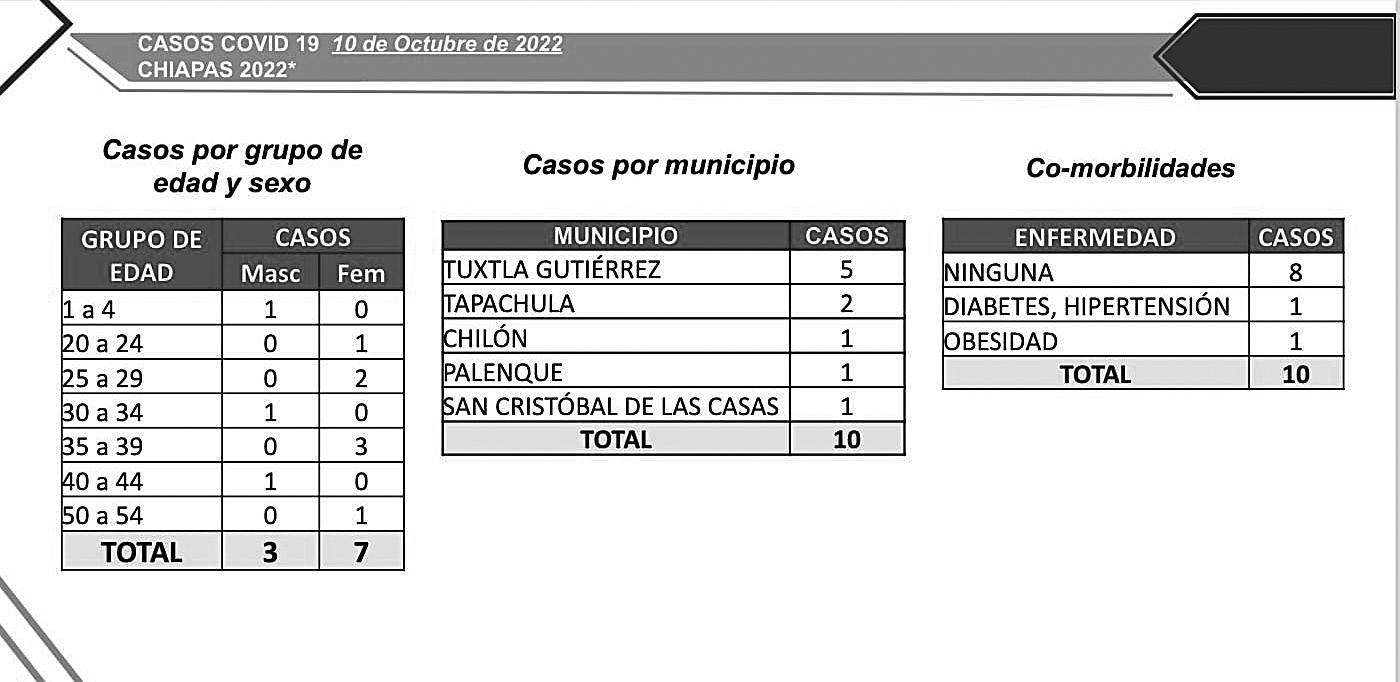De acuerdo con el último corte del panorama epidemiológico de Covid-19, Chiapas presentó 10 casos nuevos en cinco municipios de la entidad, donde sólo dos pacientes padecen diabetes, hipertensión y obesidad, y el resto no cuenta con comorbilidades; además de sumar un día más sin registro de defun ciones por esta enfermedad.