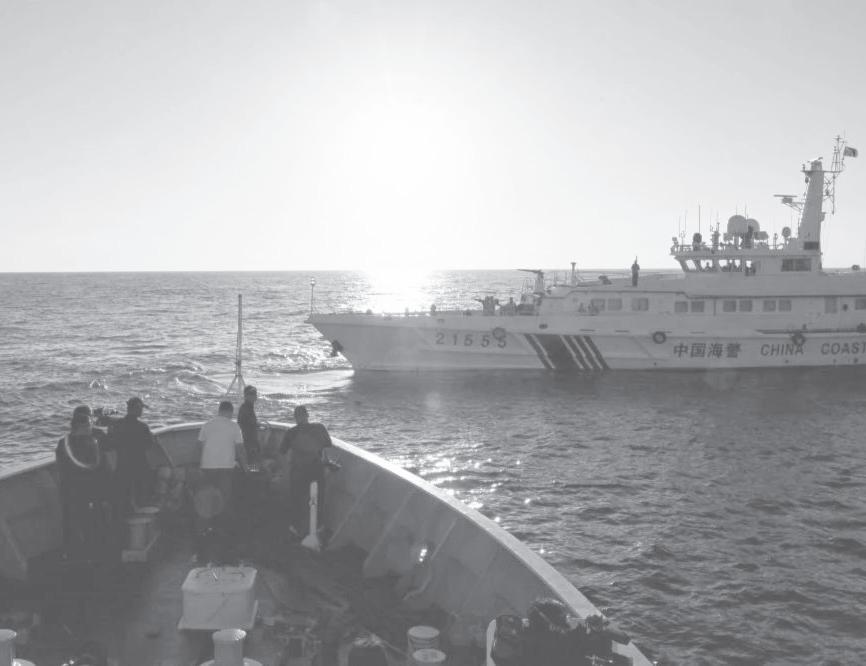cubierta del barco filipino Cape Engaño mientras navegaba a unas 23 millas náuticas al sureste del Atolón Sabina (que Filipinas llama Escoda; y China, Xianbin Jiao), ubicado en las Islas Spratly.