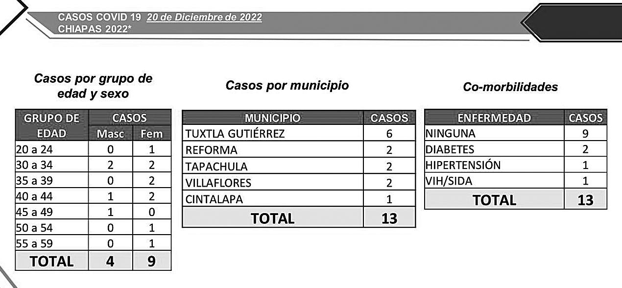 De acuerdo al último panorama del Covid-19, Chiapas registró 13 casos nuevos, seis de ellos en Tuxtla Gutiérrez, dos en Reforma, Tapachula y Villaflores, además de un caso en Cintalapa; no se reportan muertes por esta enfermedad respiratoria.