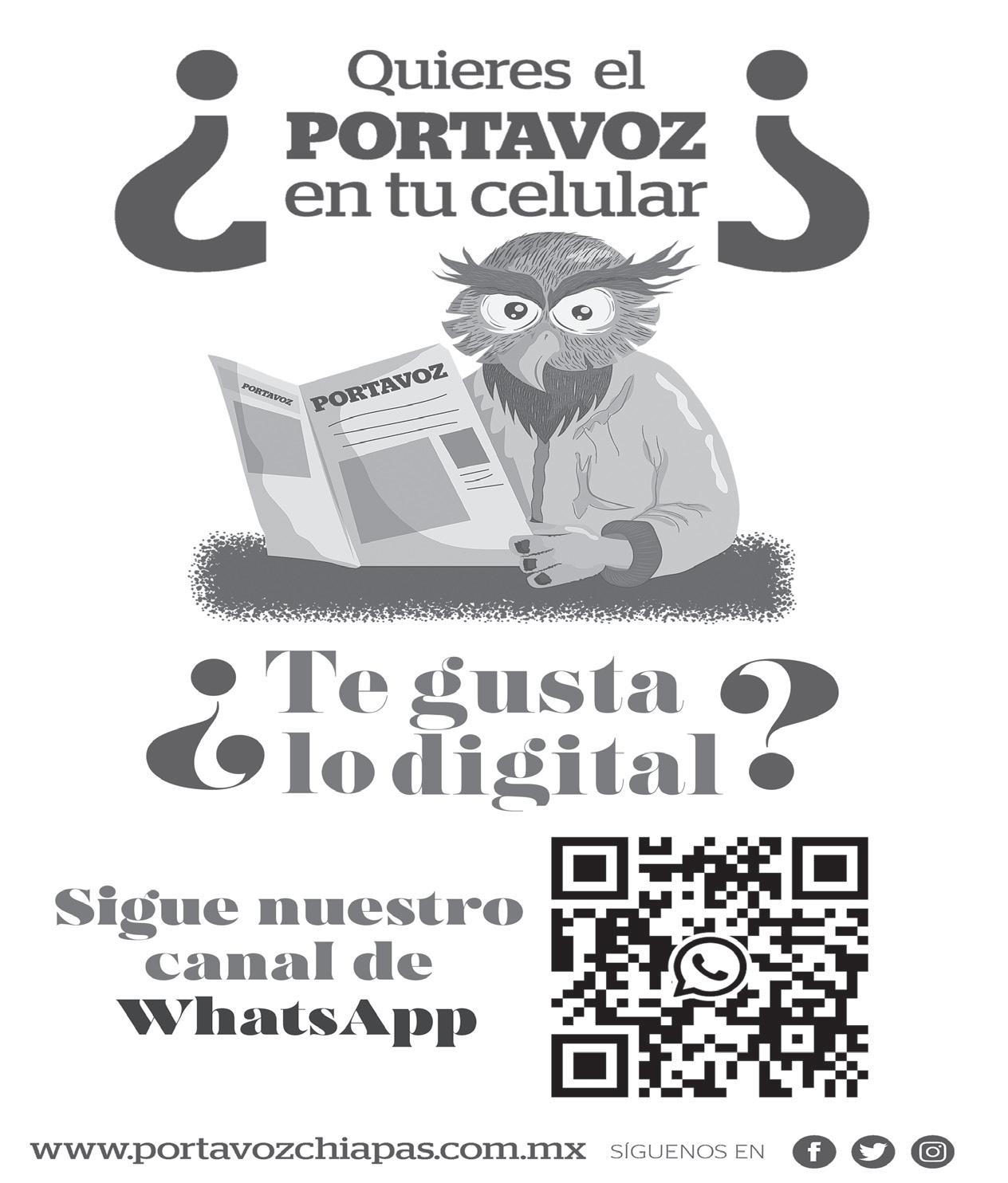 PORTAVOZ: El diario de todas las voces. Periódico de lunes a viernes. Editor responsable: José Juan Balcázar Moreno. Número de Certificado de Reserva de Derechos al Uso Exclusivo, otorgado por el Instituto Nacional del Derecho de Autor: 042024-022612121300-101. Número de Certificado de Licitud de Título y Contenido: 17346. Domicilio de la Publicación, Imprenta y Distribuidor: Primera Norte Oriente 1445, Centro, C.P. 29000. Tel: 961 102 2460, @portavozchiapas, Tuxtla Gutiérrez, Chiapas.