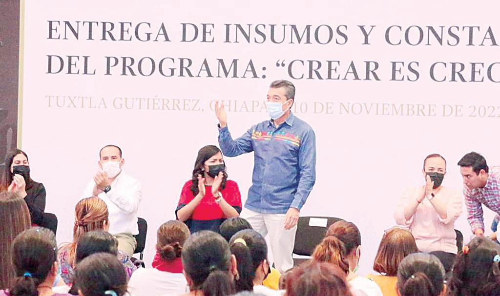 HERMES GARCÍA / PORTAVOZAl entregar insumos y cons tancias de capacitación para el empleo a mujeres de diferentes colonias de Tuxtla Gutiérrez, como parte del Progra ma “Crear es crecer, juntos de la mano”, el gobernador Rutilio Es candón Cadenas sostuvo que se guirá impulsando este tipo de ac ciones sensibles y de alto impacto social, con el objetivo de fortalecer los conocimientos, las capacida des y habilidades de las personas, y contribuir al autoempleo, la eco nomía, la igualdad y al crecimiento del índice de desarrollo humano.