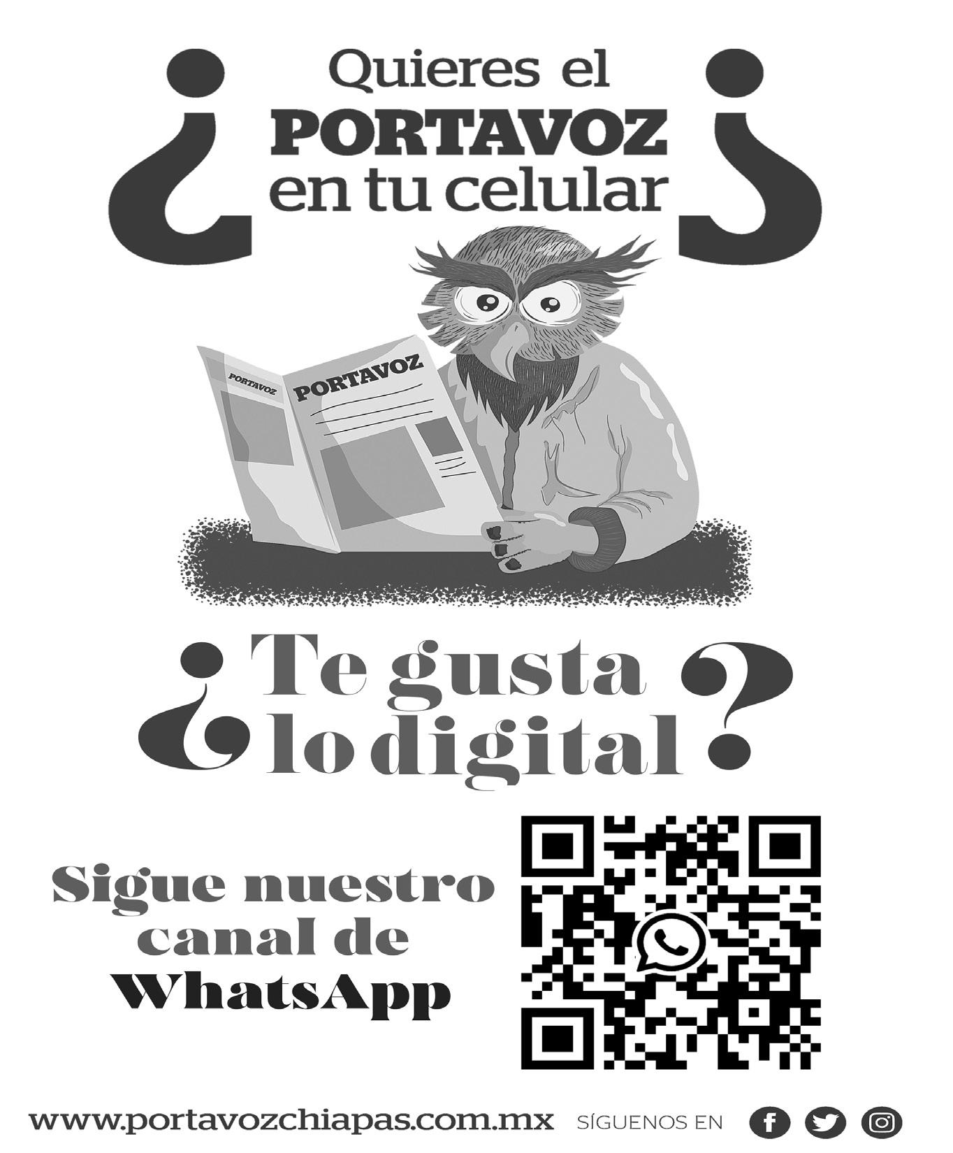 PORTAVOZ: El diario de todas las voces. Periódico de lunes a viernes. Editor responsable: José Juan Balcázar Moreno. Número de Certificado de Reserva de Derechos al Uso Exclusivo, otorgado por el Instituto Nacional del Derecho de Autor: 042024-022612121300-101. Número de Certificado de Licitud de Título y Contenido: 17346. Domicilio de la Publicación, Imprenta y Distribuidor: Primera Norte Oriente 1445, Centro, C.P. 29000. Tel: 961 102 2460, @portavozchiapas, Tuxtla Gutiérrez, Chiapas.