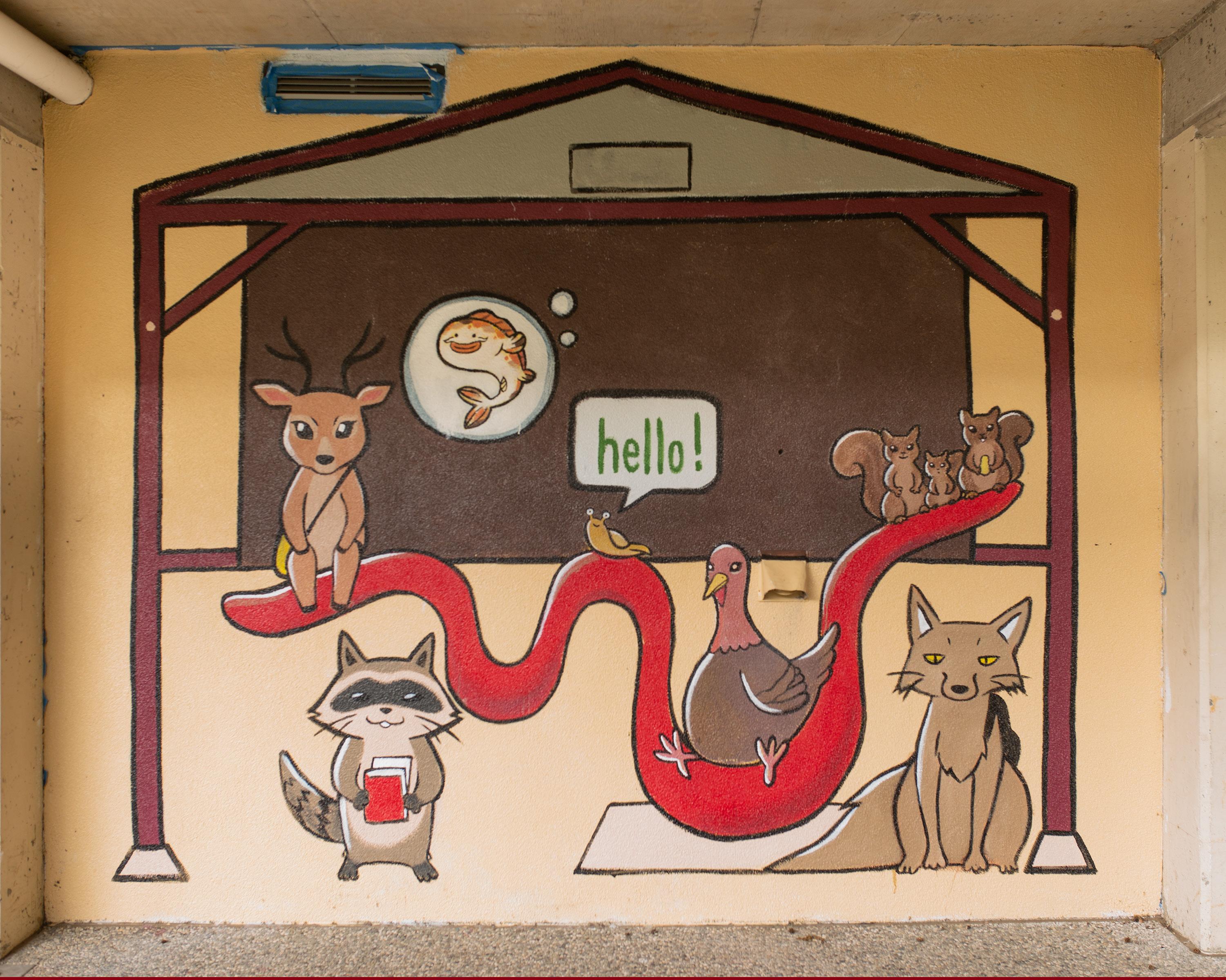 We have chosen to represent some common plant and animal species that share the local Porter and larger UCSC community with us. In the same way that it is important that we know each other’s names, this mural teaches us the names of some of these species.