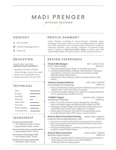 Voluntarily co-authored a thesis on color’s neurological impact on children with PTSD, supported by local city governments. Experience in healthcare, residential, hospitality, retail, education, workplace, & transitional design projects. Seeking an Entry-level Interior Design occupation with goals toward NCIDQ, LEED, & RA dual licensure in interior design/architecture