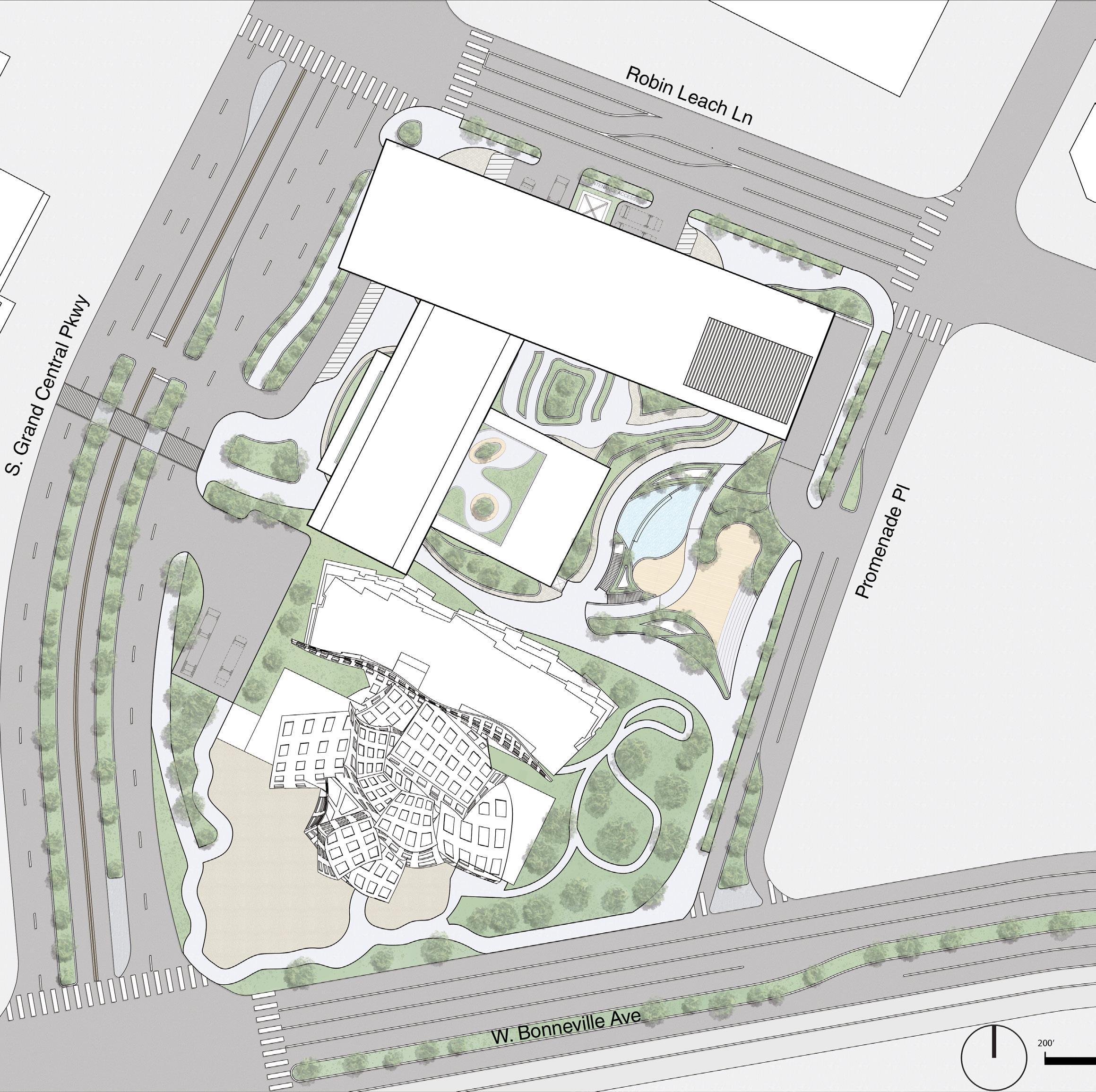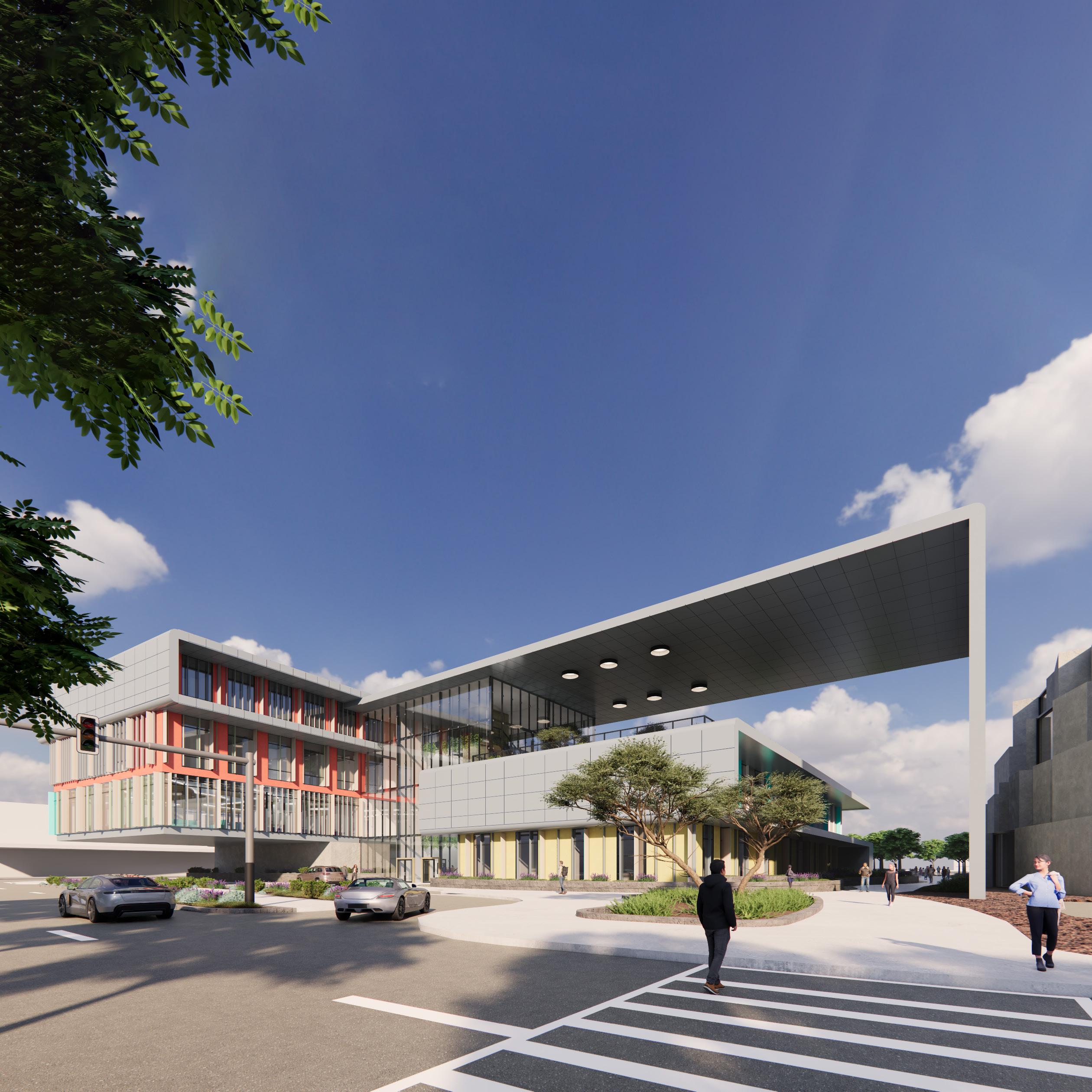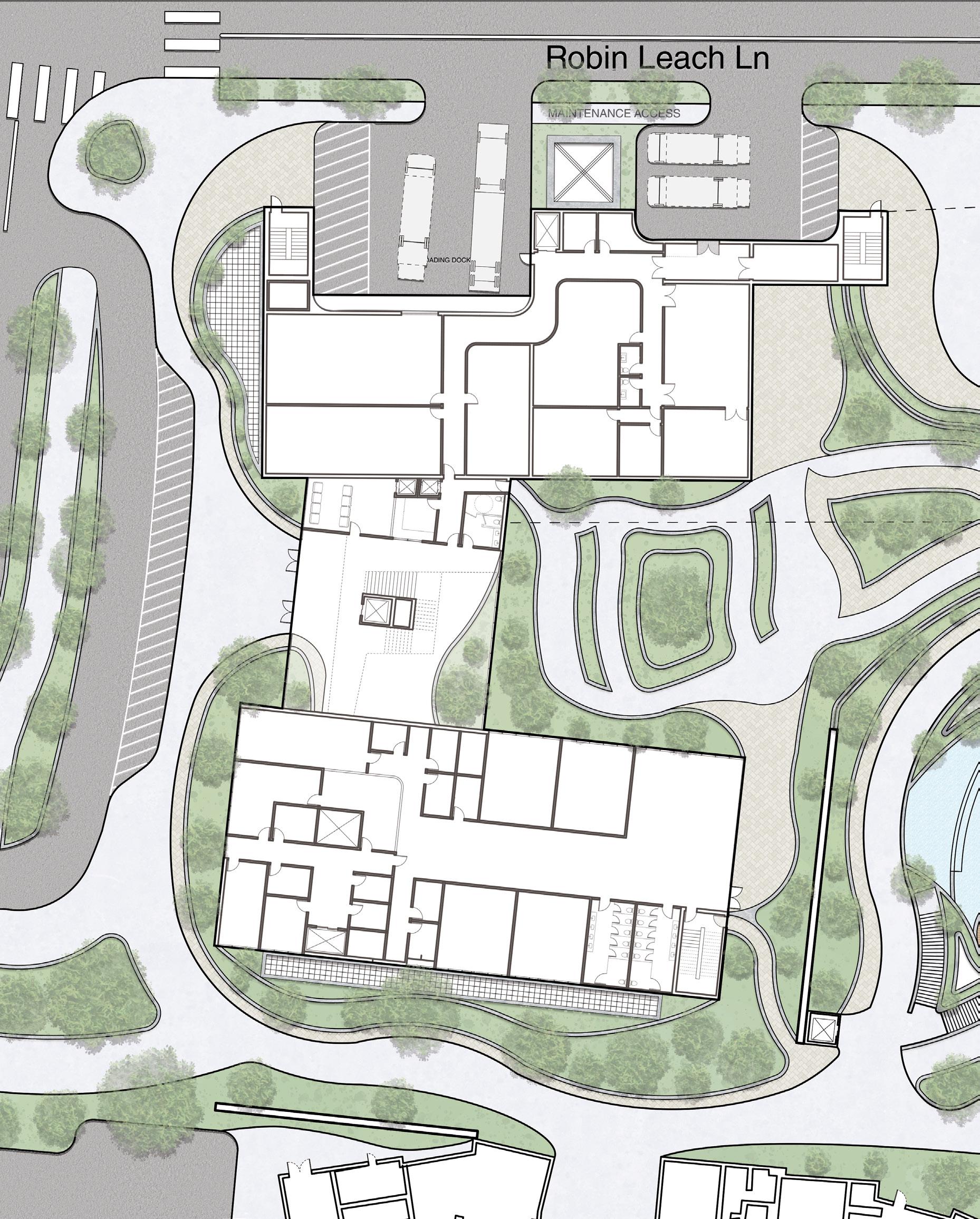 The site sits between an industrial zone and a transit hub. To bridge this divide, the concept of the “Synapse” was introduced, referring to the connection between two forms. Diagonal paths were placed within the master plan to guide circulation between the industrial side along Poinsettia Street and the public transit area on N Santiago Street.