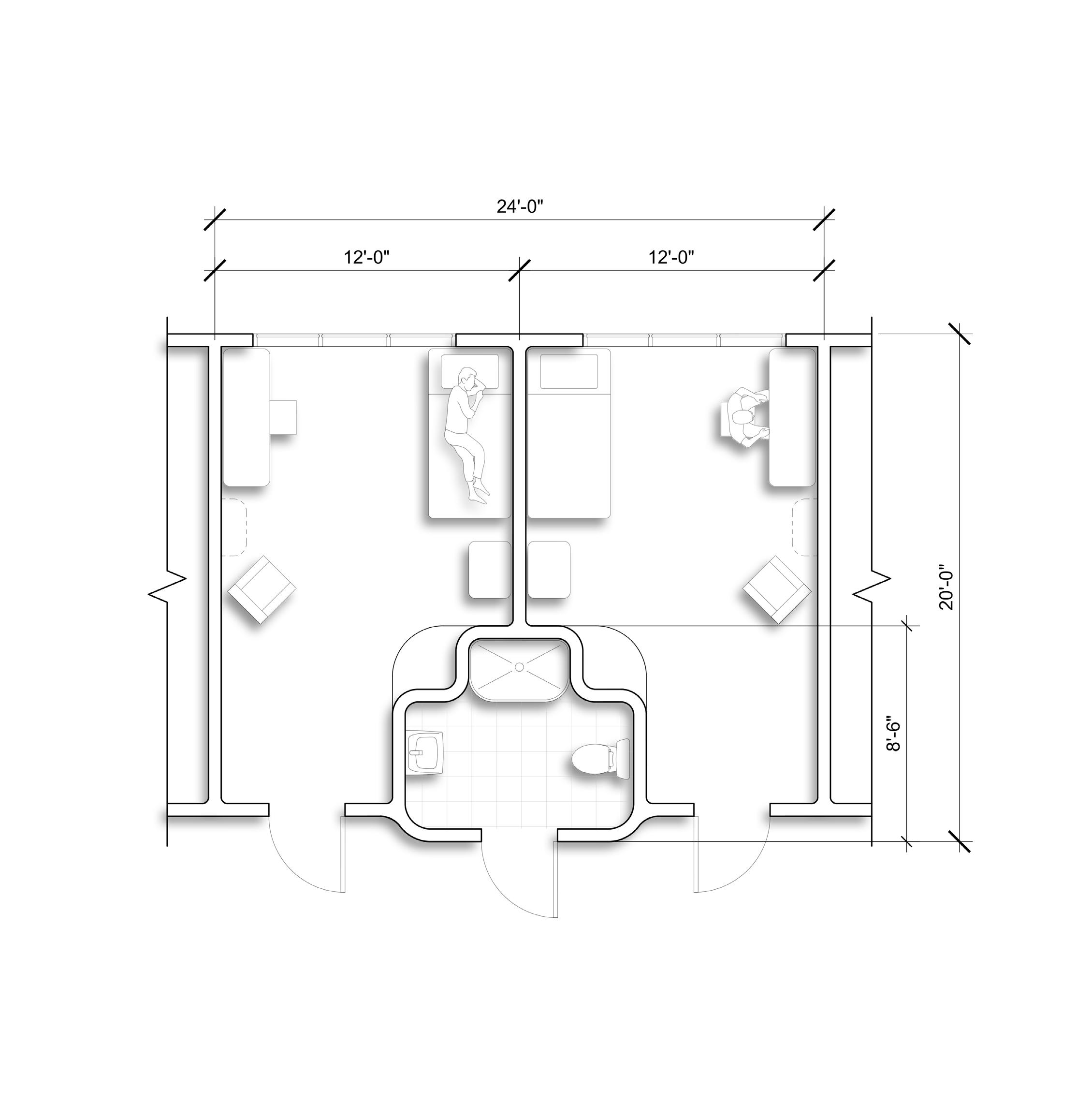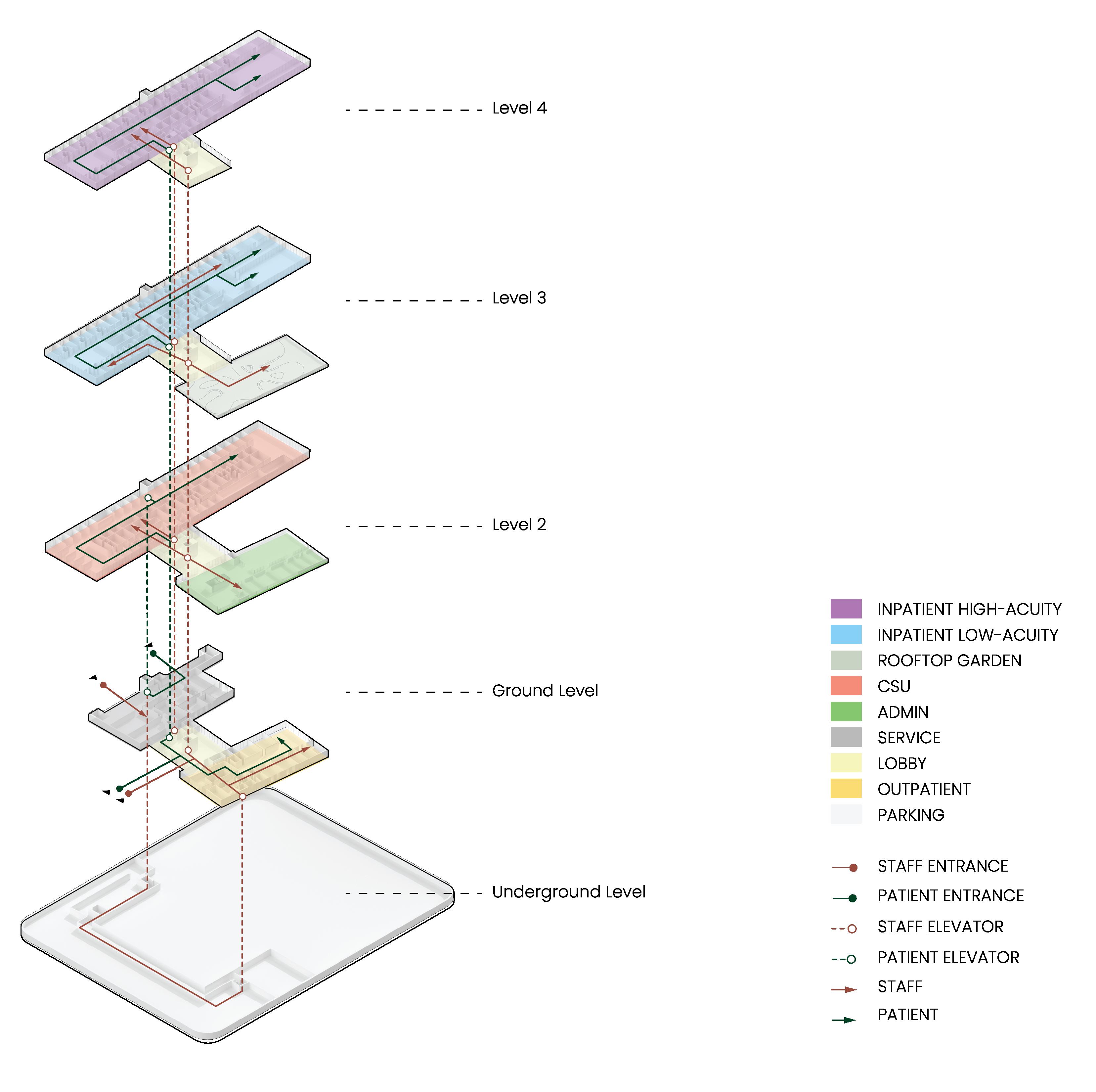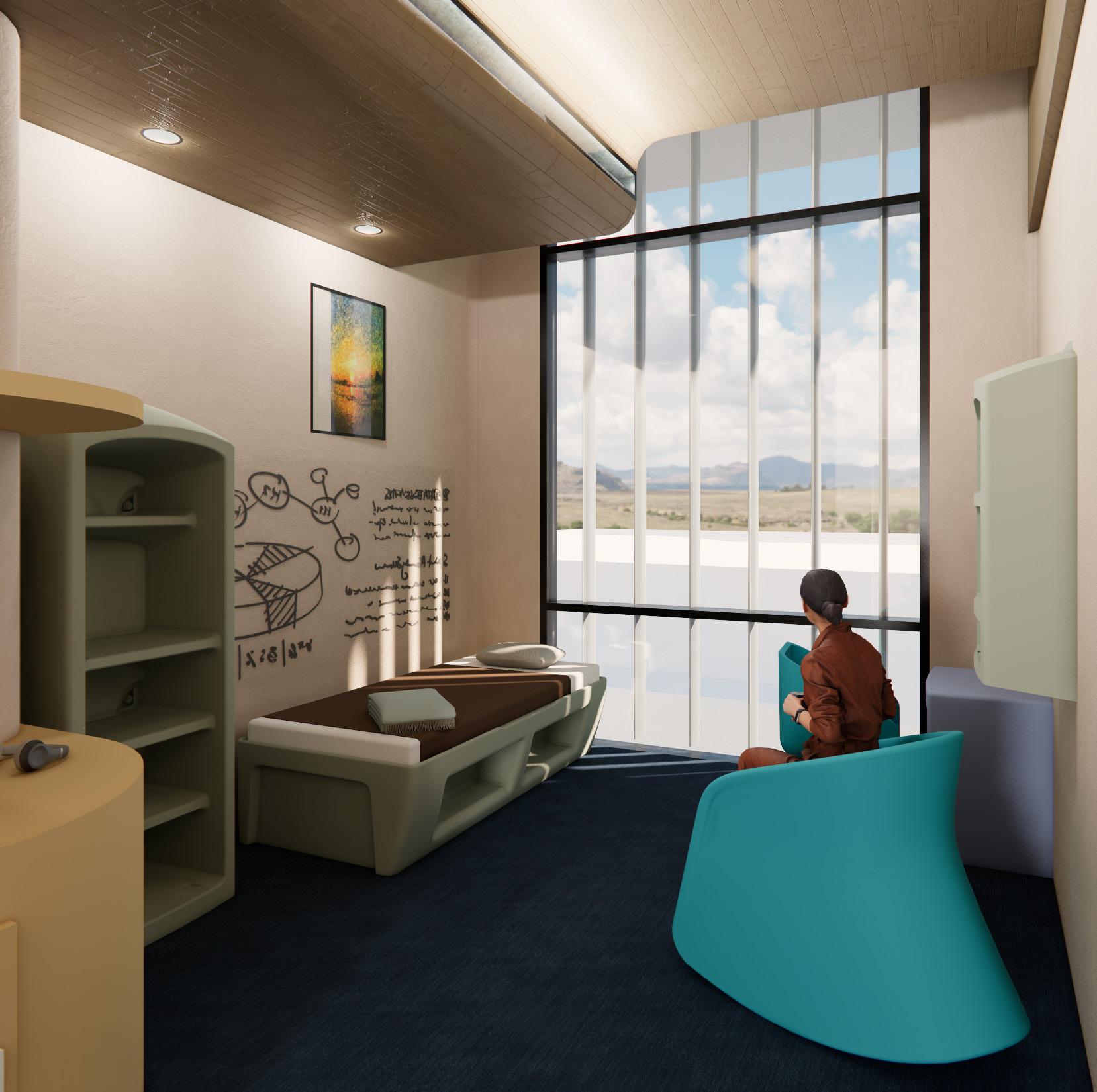 Climate studies played a big role in shaping the building. Solar and wind analysis helped position yards, windows, and shading in the most comfortable locations throughout the year. Clear circulation paths separate patient, staff, and public movement to support safety and easy navigation. Overall, the goal of the project was to create a space that focuses on healing, connection, and long term adaptability within a challenging desert environment.