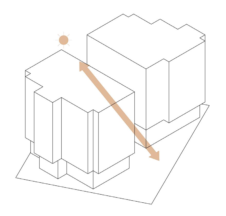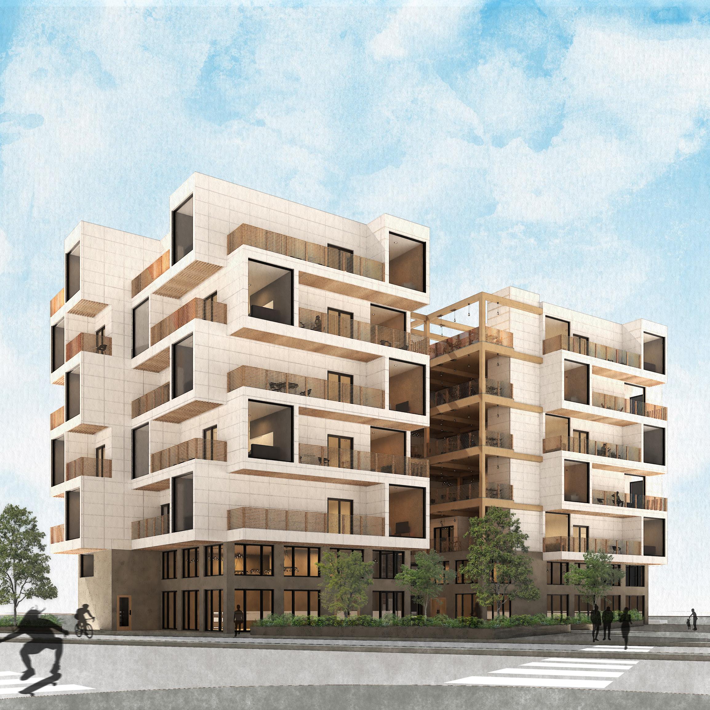 The massing was shaped to respond to the site’s challenges, especially its landlocked condition and lack of green space. To bring in natural light, the building was oriented to face true north, then rotated to open up views and create a more welcoming entry. This allowed balconies to offer semi-private spaces and connect residents to the surrounding neighborhood.