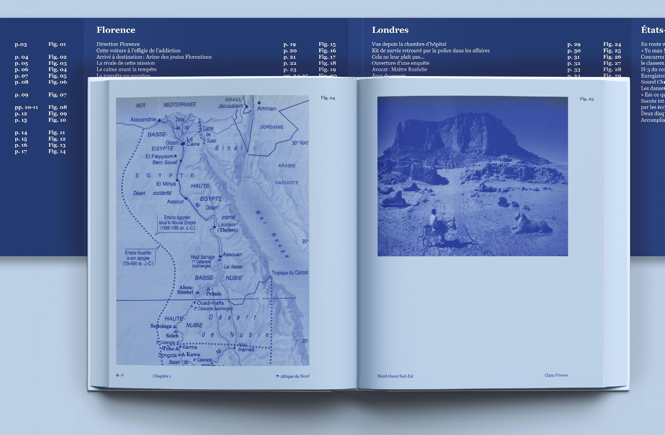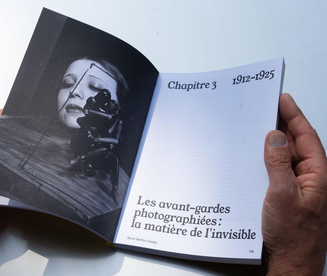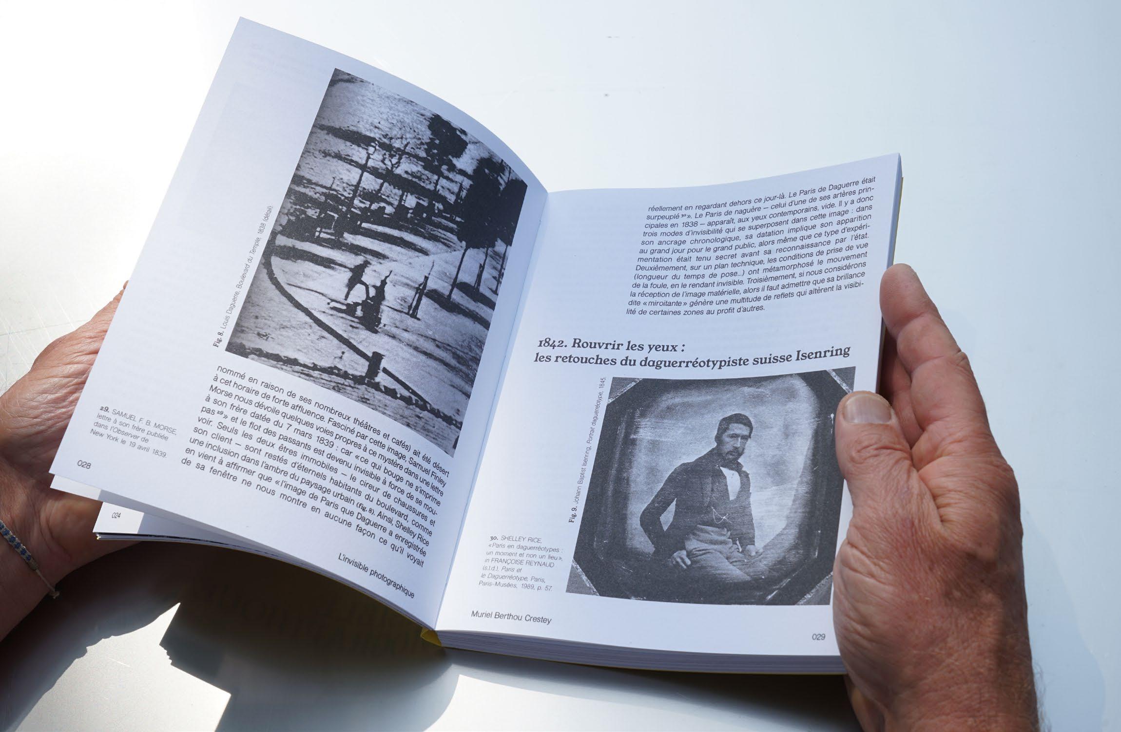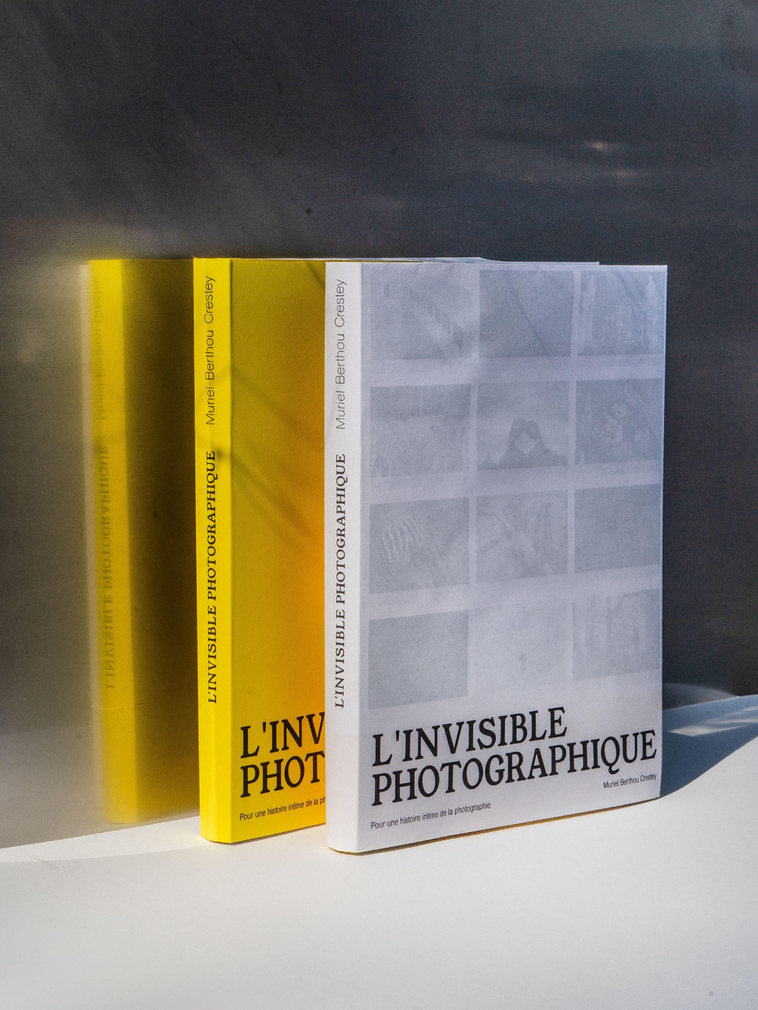 L’essai intitulé « L’invisible photographique » est un ouvrage écrit par Muriel Berthou Crestey. Le livre est enveloppé par une jaquette qui dévoile par transparence les photos de l’édition. Lorsqu’on la déplie, on y retrouve toutes ces images composées dans une grille qui fait référence aux planches contacts de la photographie argentique.
