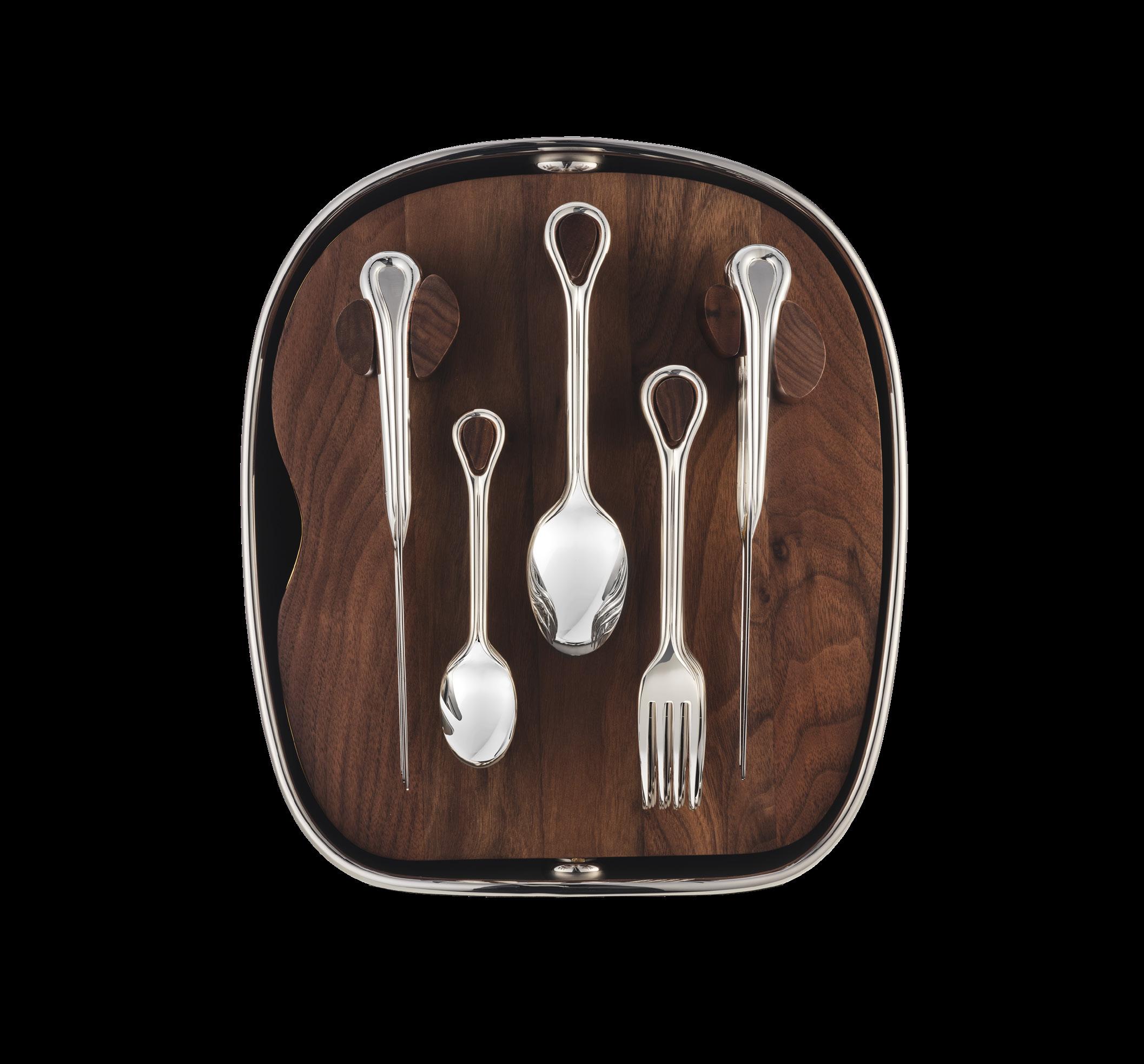 A perfect alignment of two identities in metalsmithing: jewellery and tableware. The open, teardrop shape at the base of the forks and spoons brings a jewellery aspect to the cutlery while respecting both form and function. To begin, Carrousel will comprise 24 essential pieces: