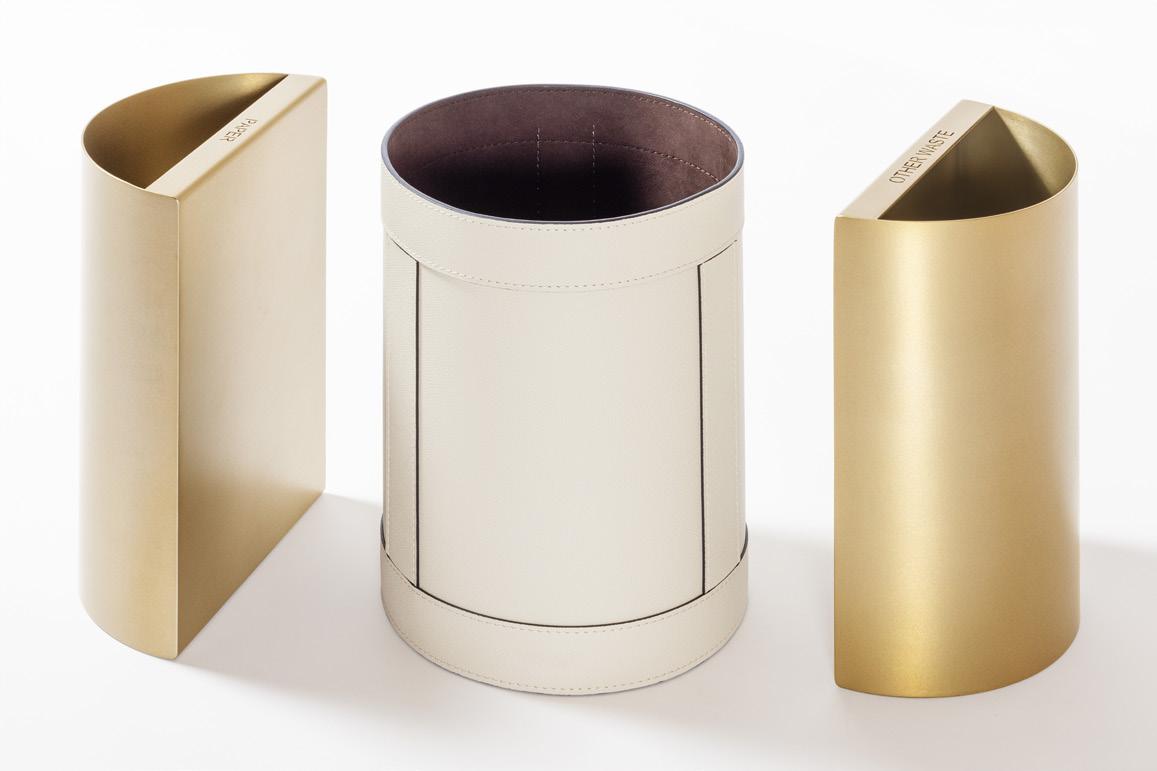 Luna, available in a double- or triplecompartment design, is a leathercovered waste bin. Each space features removable black plastic containers for easy cleaning and separation of waste or recycling.
