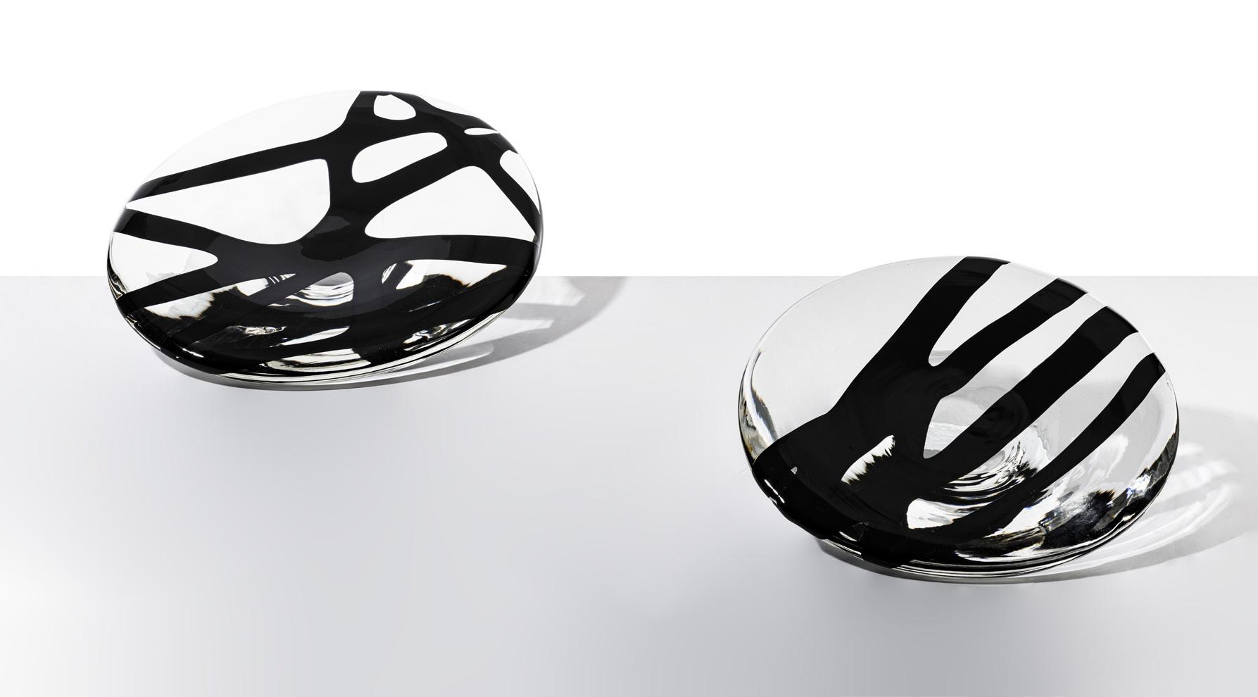The crystal glass comes to life under the skilled mastery of the artisans, decorated with hot-applied stripes of black glass, which delicately embrace each centerpiece, creating an intersecting pattern that is a tribute to the unique design of the renowned American designer.