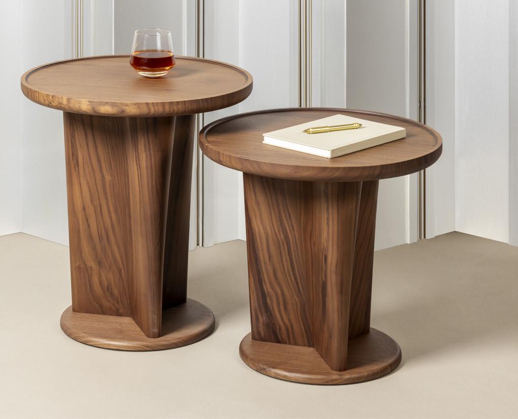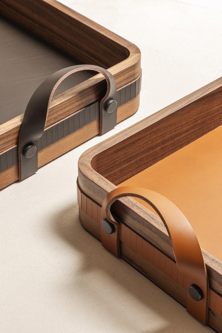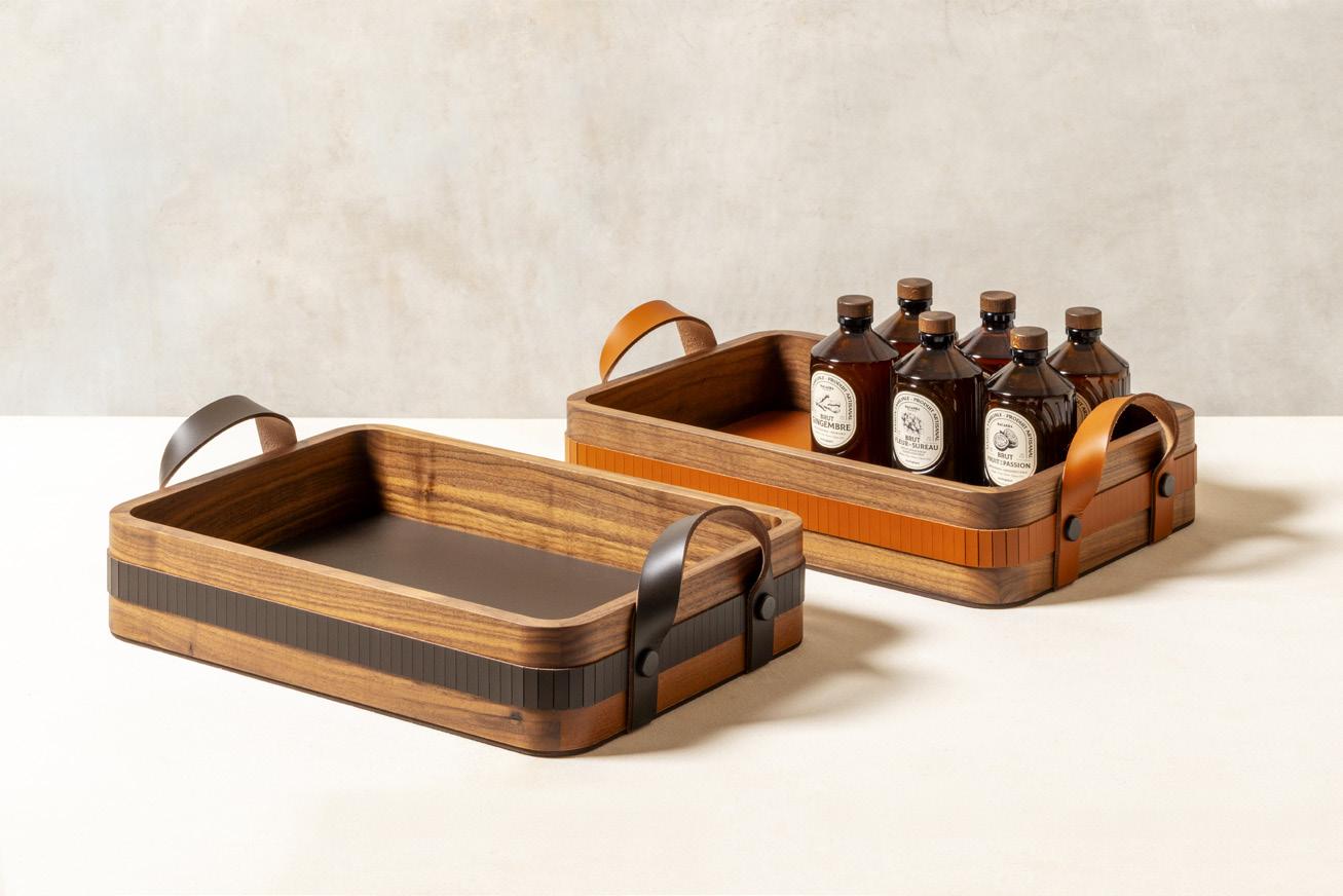 The Toiles de Noyer collection showcases impeccable geometry and craftsmanship. Its solid walnut volumes highlight the richness of the material, exuding a sense of stability and refinement. Fine saddle leather inserts add a touch of sleek texture, enhancing the collection's pieces with understated sophistication.