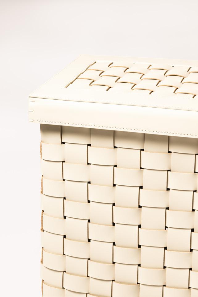 Woven leather laundry baskets, available with or without lid, and provided with a removable transparent plexiglass inner for easy cleaning.