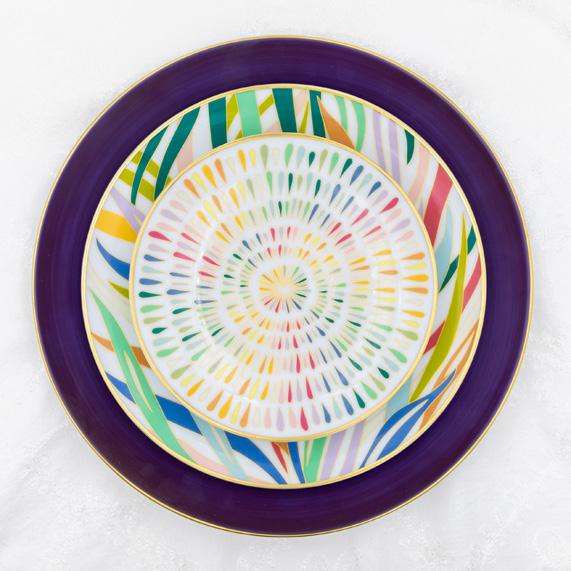 A reinvented heritage: the hand-painted, represented by a palette of vibrant colours, the DNA of the house, and highlighted on the dinner plate.