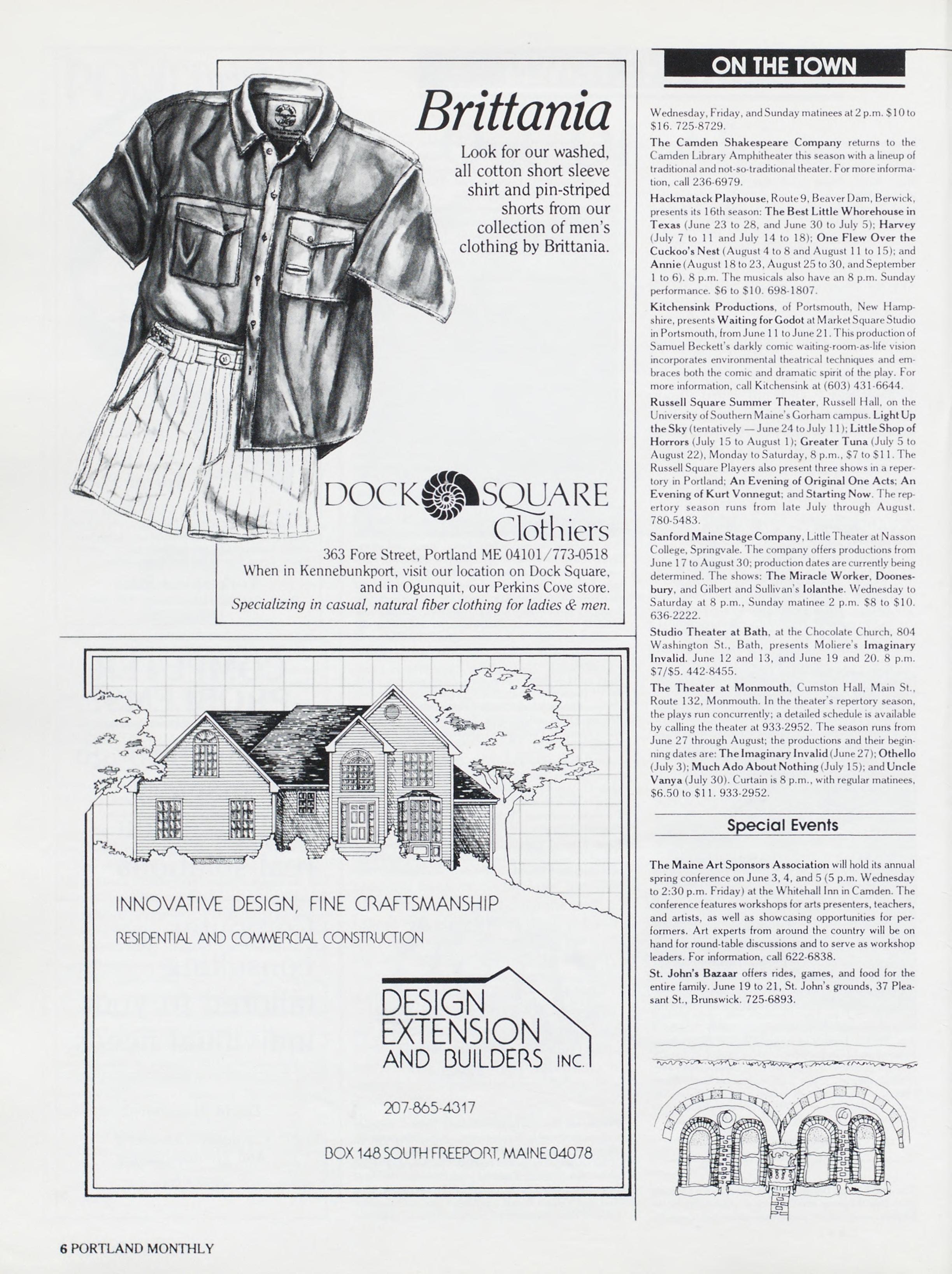 ON THE TOWN Deadlineforlistingsissixweeksinadvanceofpublication date.PleasesendmaterialstoMichaelHughes,Listings Editor,PortlandMonthly,154MiddleStreet,Portland, Mame04101.Pleaseincludedate,time,place,contact person,telephonenumber,costandadescriptionofyour event.Ifyouhaveanyquestions,pleasecallPortland Monthlyat775-4339.