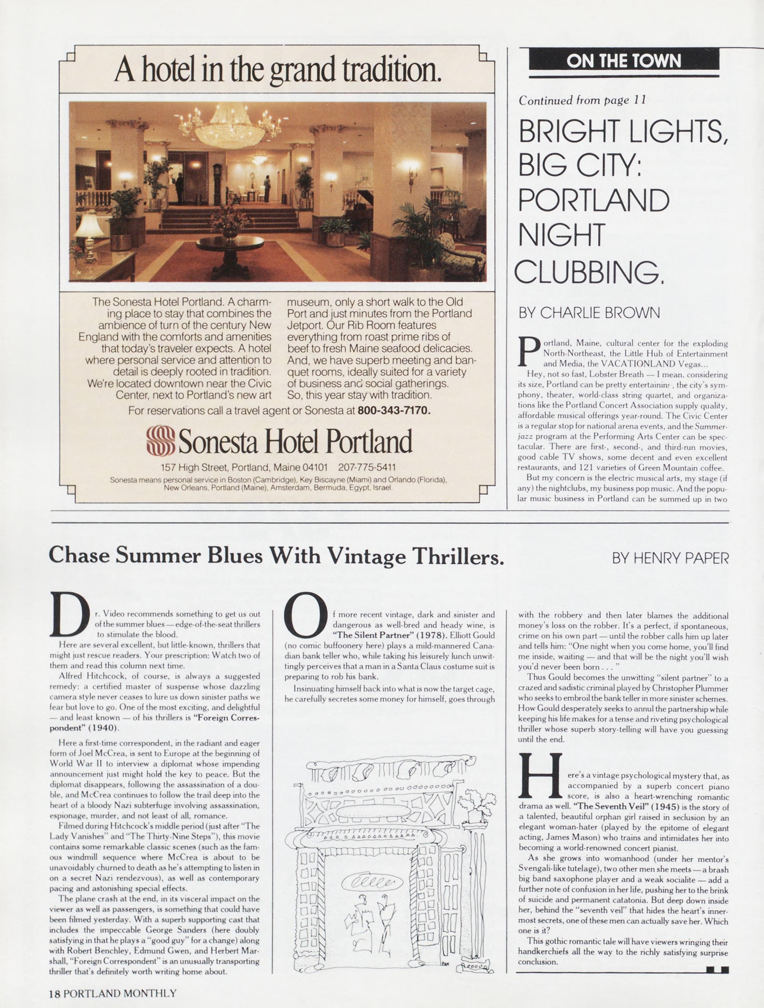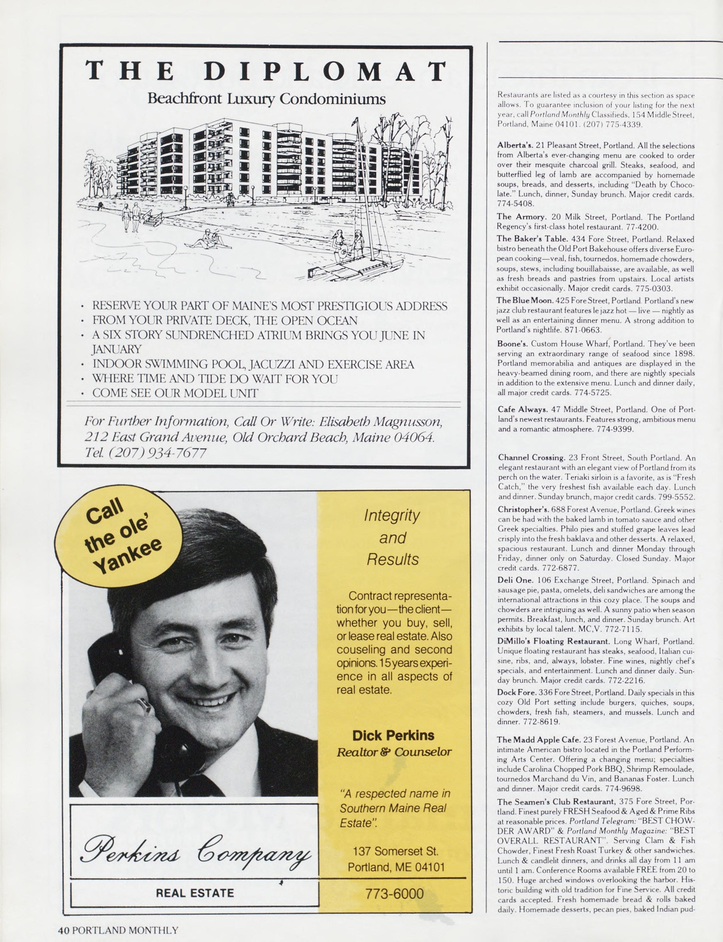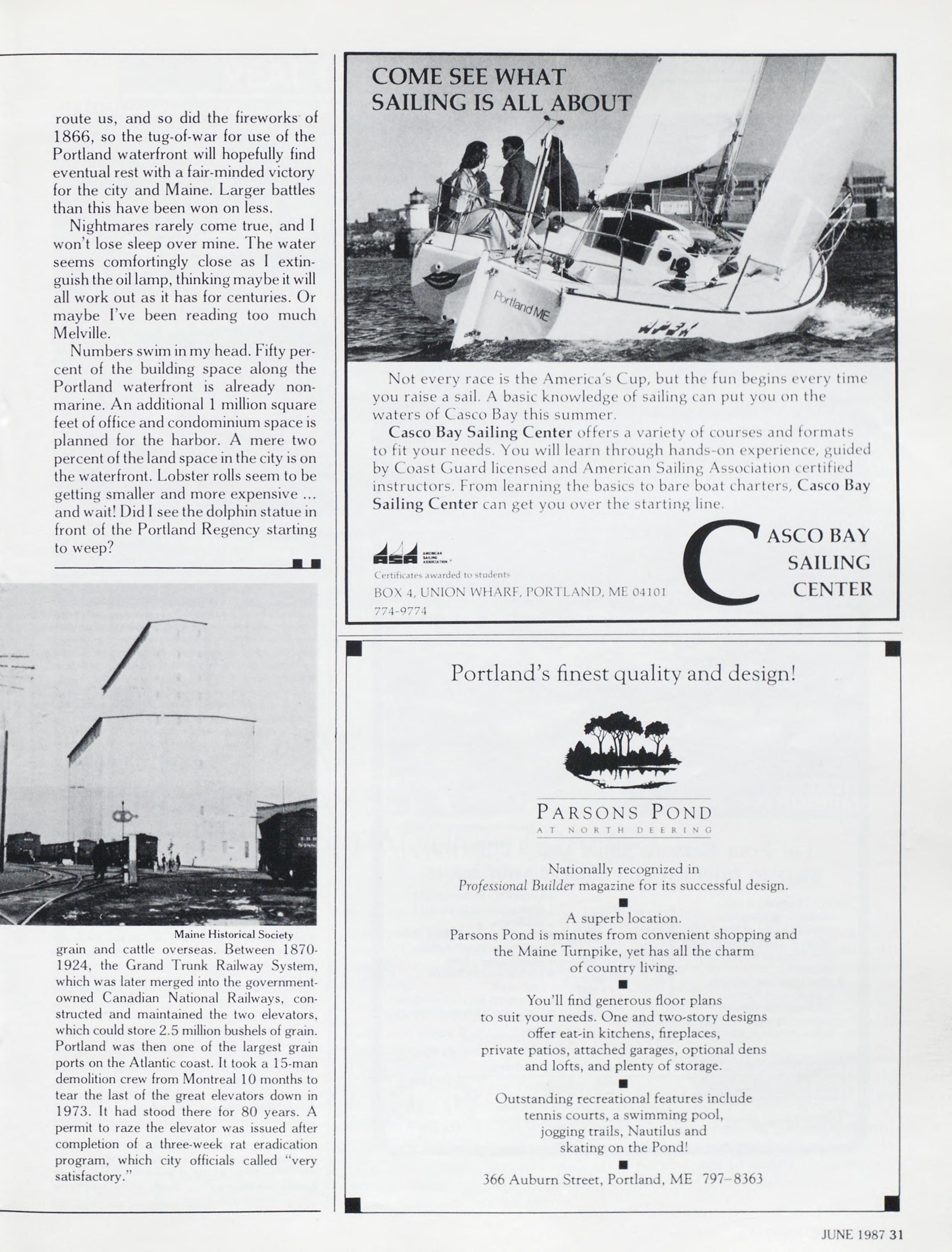 June1987,Vol.2,No.5,copyright1987byPort¬ landMonthly,Inc.Allrightsreserved.Application tomailatsecond-classratespendingatPortland, ME 04101. (ISSN: 0887-5340). Opinions ex¬ pressedinarticlesarethoseofauthorsanddonot representeditorialpositionsofPortlandMonthly. Letterstotheeditorarewelcomeandwillbetreated asunconditionallyassignedforpublicationand copyrightpurposesandassubjecttoPortland Monthly'sunrestrictedrighttoeditandcomment editorially.Nothinginthisissuemaybereprintedin wholeorinpartwithoutwrittenpermissionfromthe publishers.Postmaster:Sendaddresschangesto: 154MiddleStrcet,Portland,Maine04101.Return postagemustaccompanyallmanuscriptsandpho¬ tographssubmittediftheyaretobereturned,andno responsibilitycanbeassumedforunsolicited materials.