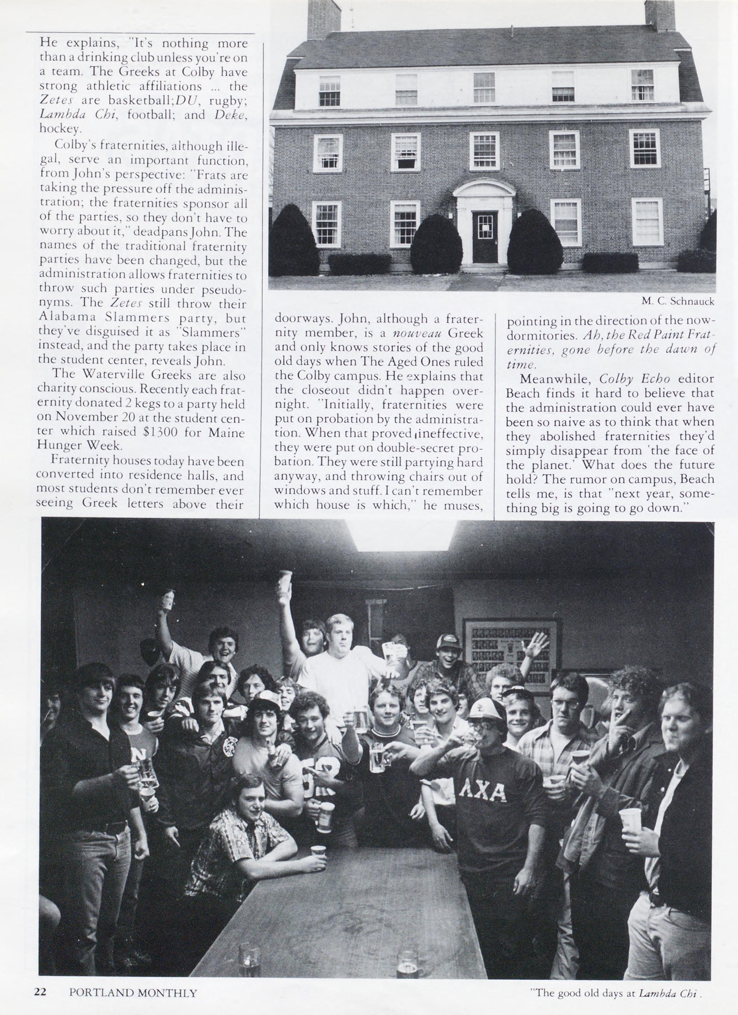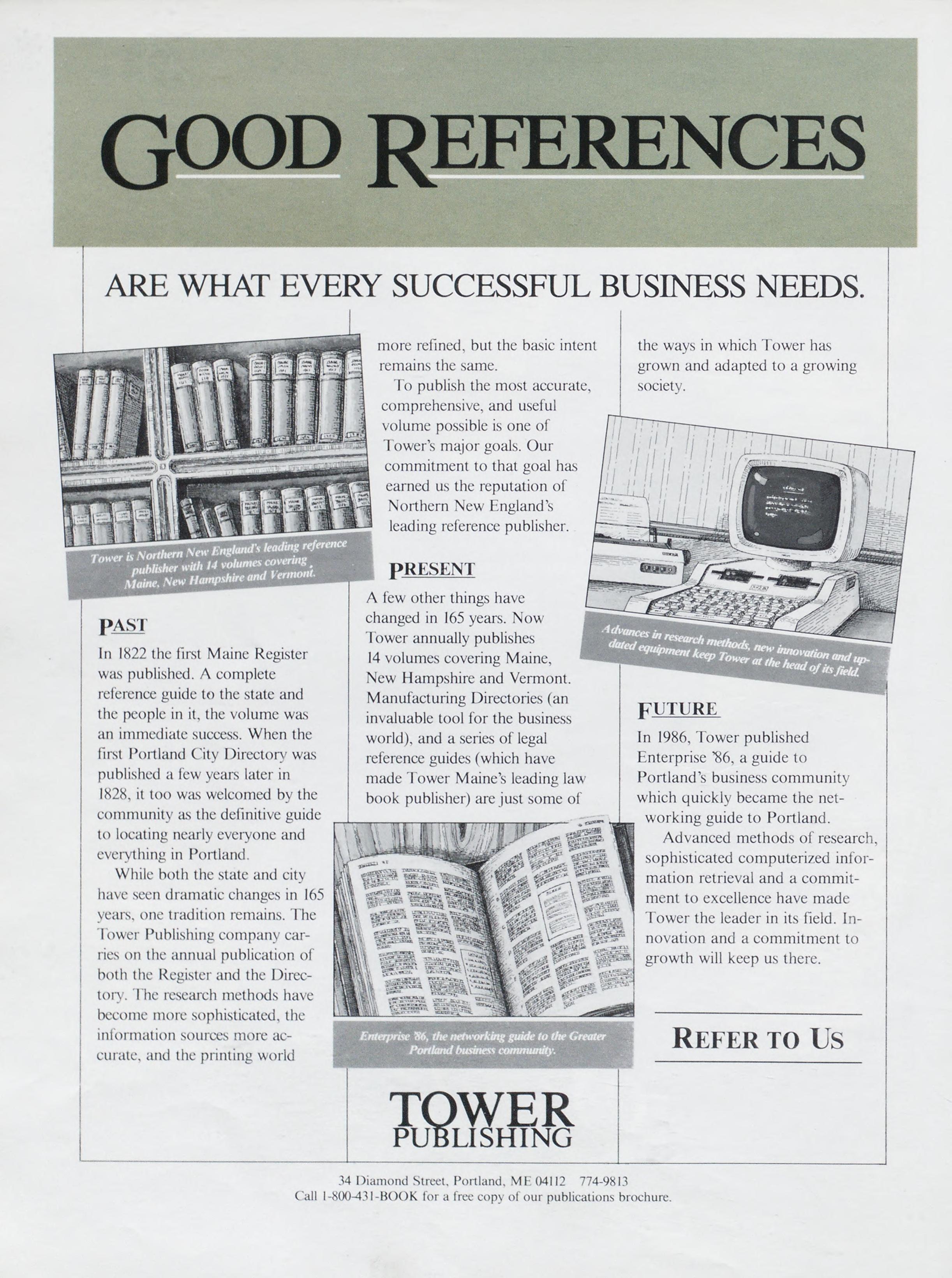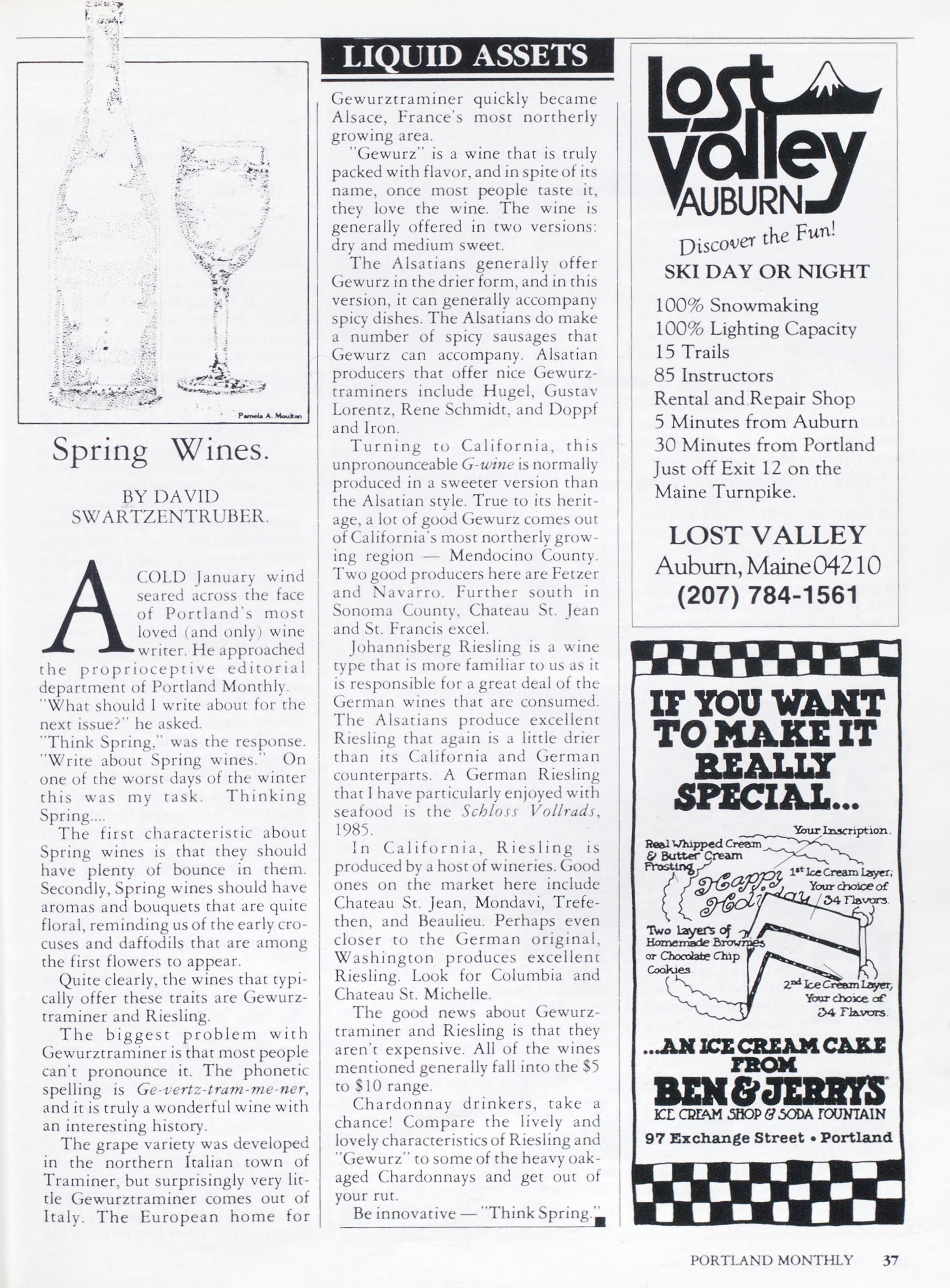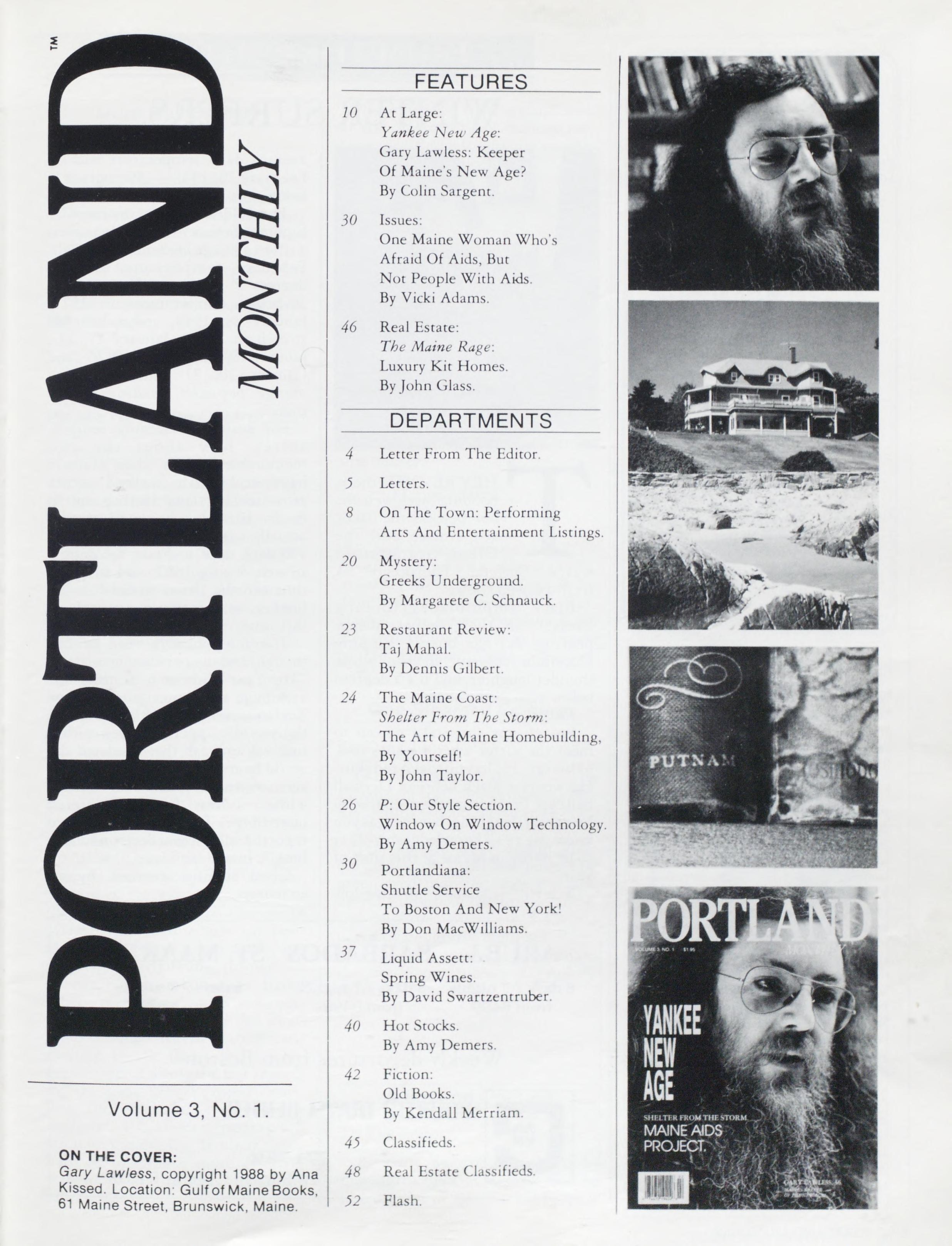 Feb.1988.Vol.3,No.1,copyright1988by PortlandMonthly,Inc.Allrightsreserved.Port¬ landMonthlyismailedatthird-classmailratesin Portland,ME04101.(ISSN:0887-5340).Opin¬ ions expressed in articles are those of authorsanddonotrepresenteditorialpositionsof PortlandMonthly.Letterstotheeditorarcwel¬ comeandwillbetreatedasunconditionally assignedforpublicationandcopyrightpurposes andassubjecttoPortlandMonthly’sunrestricted righttoeditandcommenteditorially.Nothingin thisissuemaybereprintedinwholeorinpart withoutwrittenpermissionfromthepublishers. Postmaster:Sendaddresschangesto:578Con¬ gressStreet,Portland,Maine04101.Returnpos¬ tagemustaccompanyallmanuscriptsandphoto¬ graphssubmittediftheyaretobereturned,and no responsibility can be assumed for unsolicitedmaterials
