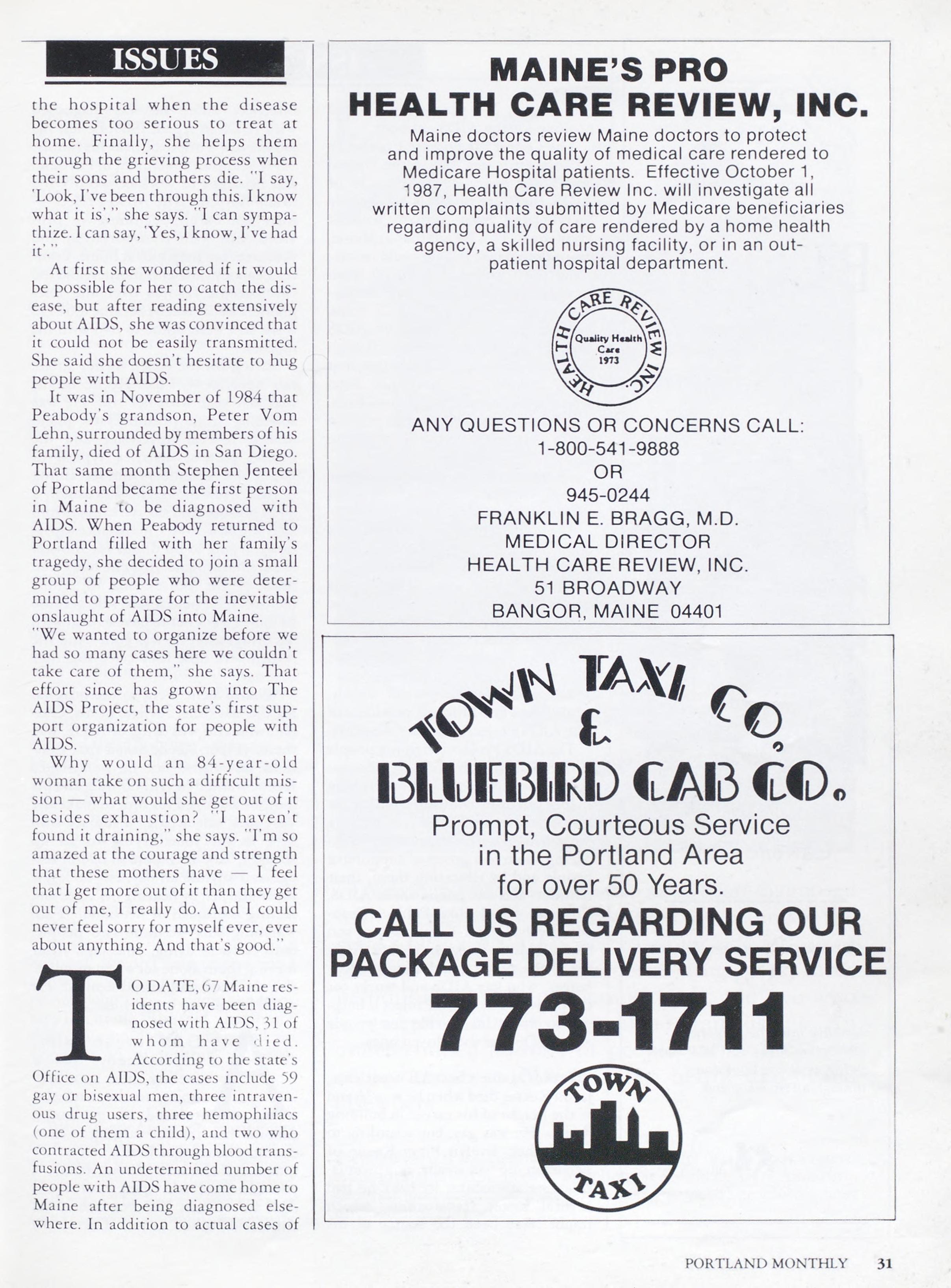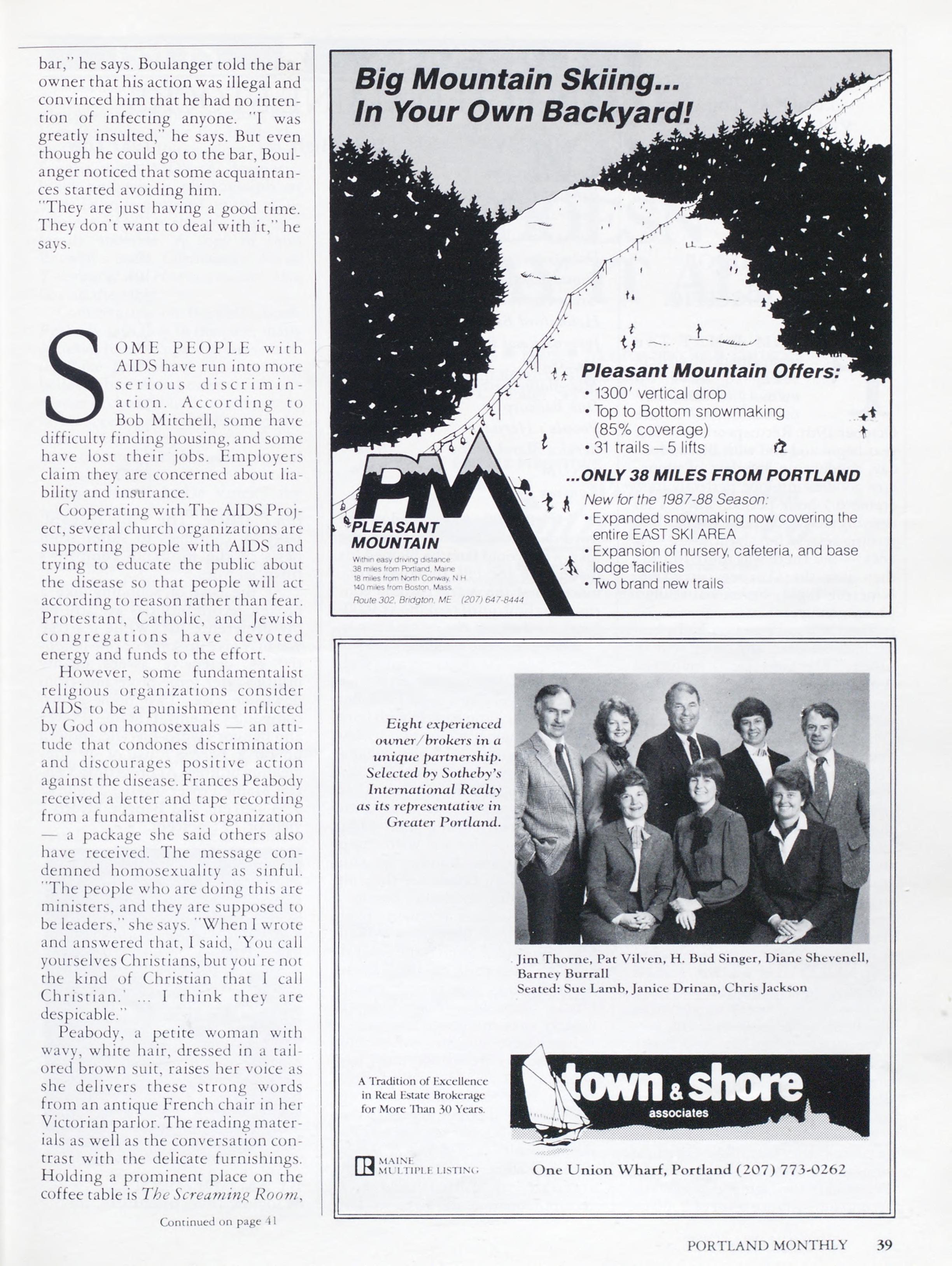 Itwasprobablyjustbychancethat the gay community in the United Statesbecameatestinggroundfor AIDS.Thediseaseisrampantinthe heterosexualpopulationsofAfrica andHaiti.Andinthiscountryithas enteredintothepopulationatlarge. "Thisvirusdoesnotdiscriminate,” saysDr.Bach,speakingataconfer¬ enceonAIDS.Aboutsixpercentof currentAIDSpatientsintheUnited Statesarewomen,andinMaine,at least one woman and child are infectedwiththevirus. Mitchellpredictsthatteenagers andyoungadultswillbethenext grouptobeattacked."It’sgoingto be explosive, I think," he says. "AIDSisthekindoftragedythat will over the next five years be touchingeveryone.Eithersomeone youknow,someoneinyourfamily, orsomeoneyouworkwithwillhave AIDS...Howwouldyourespondif thesethingshappenedtoyou?”