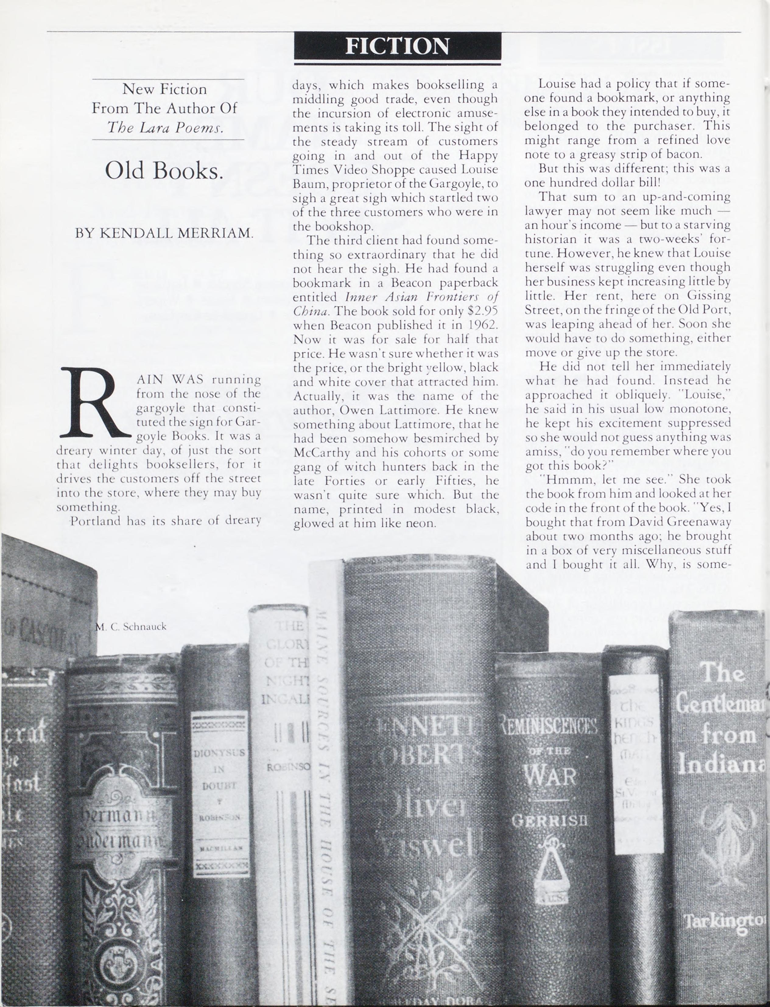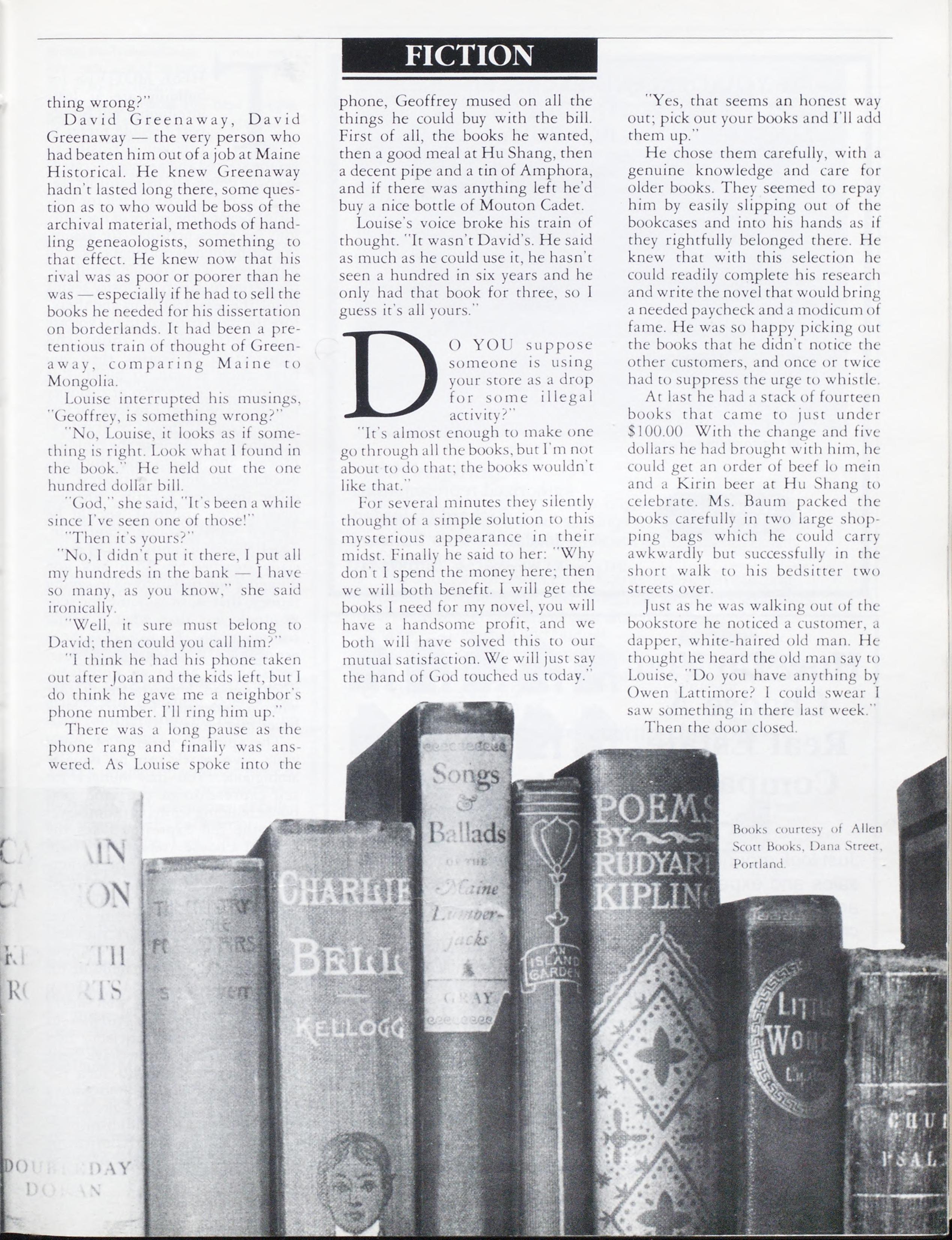 David Greenaway, David Greenaway — the very person who hadbeatenhimoutofajobatMaine Historical. He knew' Greenaway hadn’tlastedlongthere,someques¬ tionastowhowouldbebossofthe archivalmaterial,methodsofhand¬ ling geneaologists, something to thateffect.Heknewnowthathis rivalwasaspoororpoorerthanhe was—especiallyifhehadtosellthe booksheneededforhisdissertation onborderlands.Ithadbeenapre¬ tentioustrainofthoughtofGreenaway,coinparingMaineto Mongolia.
