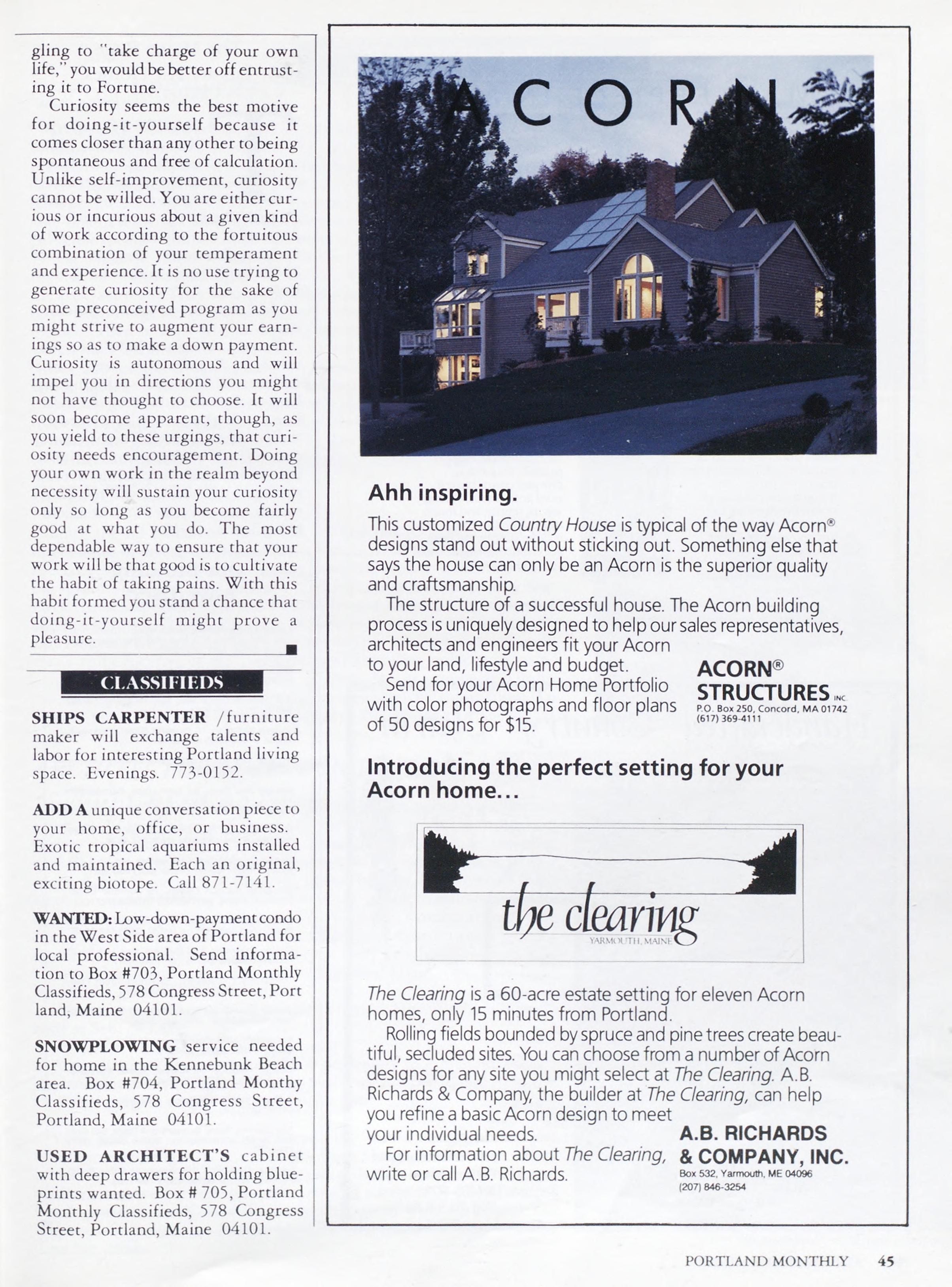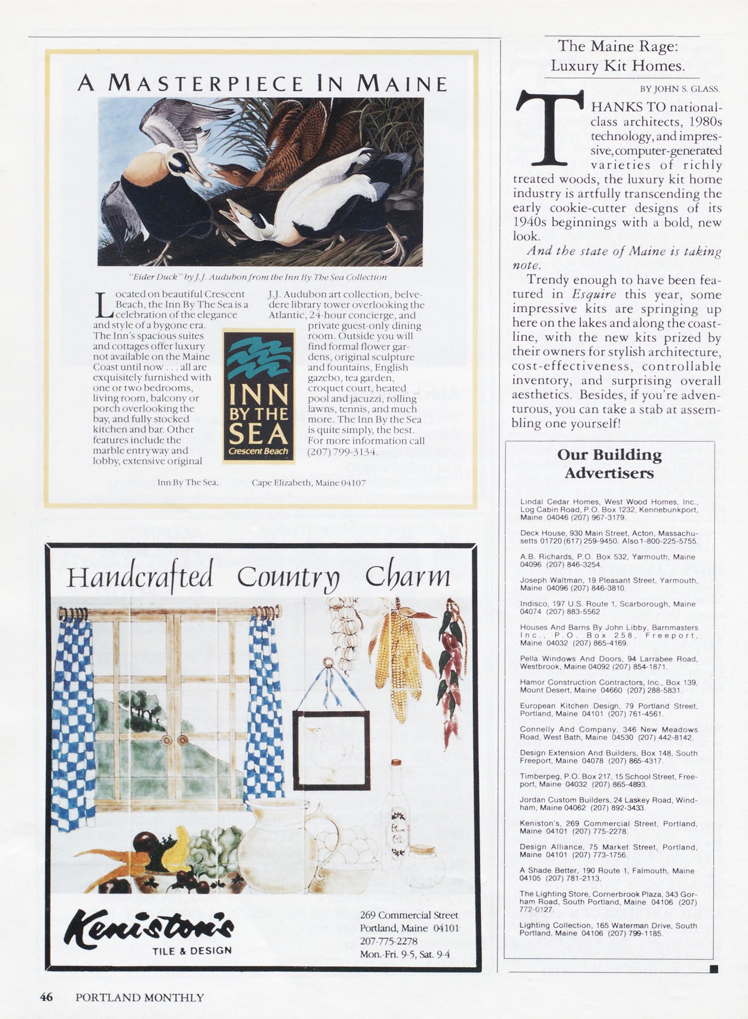 Today’skithomesareofpost-and-beamconstruction,leavingthe interiorwallsnon-structuralandthusmovable.Evenifyouordera pre-plannedhome,thereisalotoflatitudeforcustomization.Lindal CedarHomes,basedinSeattle,Washington,withanofficeinKenne¬ bunkport,boastsofitsComputerAssistedDesignSystem,whichcan takeoneofamyriadexistingfloorplansandquicklymodifyittoyour personalspecifications.Lindalhasbeeninthebusinesssincethelate 1940s,whentheindustrybegan.(TheKennebunkportLindalofficeis thenumbertwodealershipinthenation,with42cedarhomessoldin thearealastyear.)They’vesuccessfullyturnedawayfromtheindustry’s boxy beginnings and now offer very contemporary designs, which includeurbanmodelsdesignednarrowertofitintosmallerlots,and whichhaveamore"cooleddown”andlesswoodsyfeelingthantheir chalet-likecousins.Picturedhereisa"ModifiedCascade”LindalCedar Home under construction in New Harbor, Maine. The owner is a merchant-marineofficerwho’scurrentlyatsea.Withthisboldocean¬ frontsettingatopauniquerockyformation,hehasalottolookforward to when he gets home. Kit cost is less than $60,000, with total construction(includingkit)approximately$164,000—justaddwater!