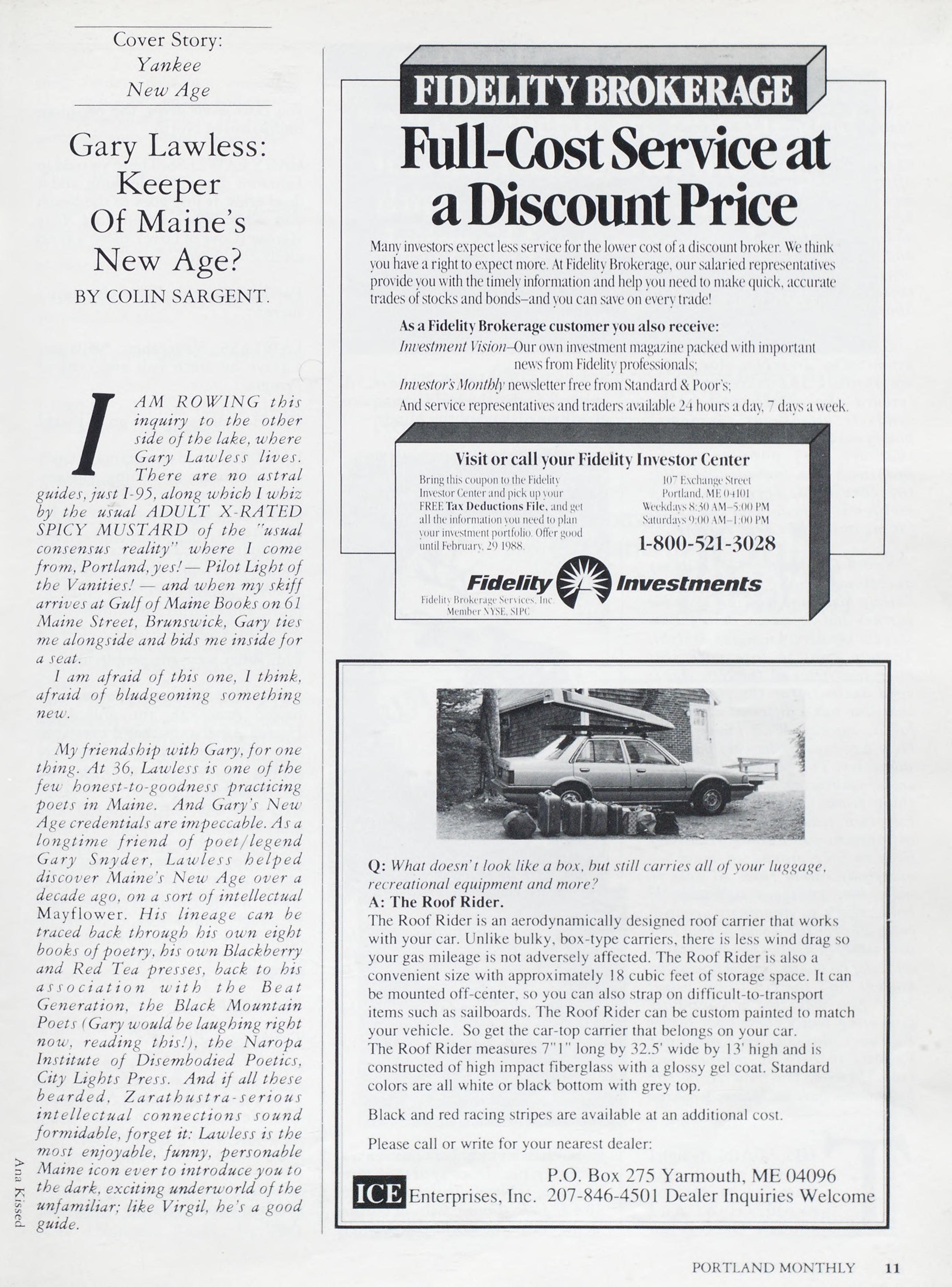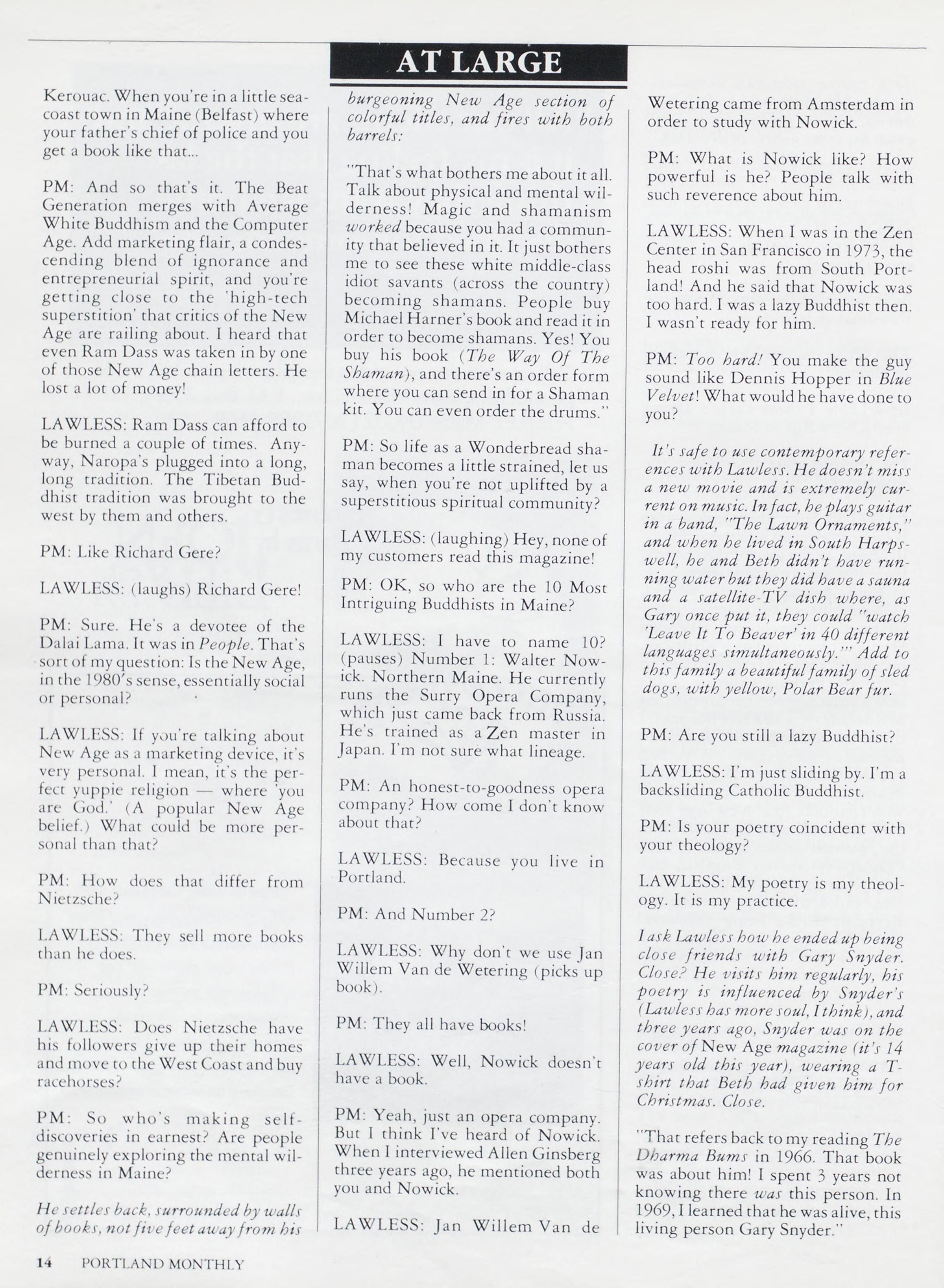 MyfriendshipwithGary,forone thing.At36.Lawlessisoneofthe feuhonest-to-goodnesspracticing poets in Maine. And Gary's New Agecredentialsareimpeccable.Asa longtime friend of poet/legend Gary Snyder, Lawless helped discover Maine's New Age over a decadeago.onasortofintellectual Mayflower. His lineage can be tracedbackthroughhisowneight booksofpoetry,hisownBlackberry and Red Tea presses, back to his association with the Beat Generation, the Black Mountain Poets(Garywouldbelaughingright now, reading this!), the Naropa InstituteofDisembodiedPoetics. CityLightsPress.Andifallthese bearded.Zarathustra-serious intellectual connections sound formidable,forgetit:Lawlessisthe mostenjoyable,funny,personable Maineiconevertointroduceyouto thedark,excitingunderworldofthe unfamiliar:likeVirgil,he’sagood guide.