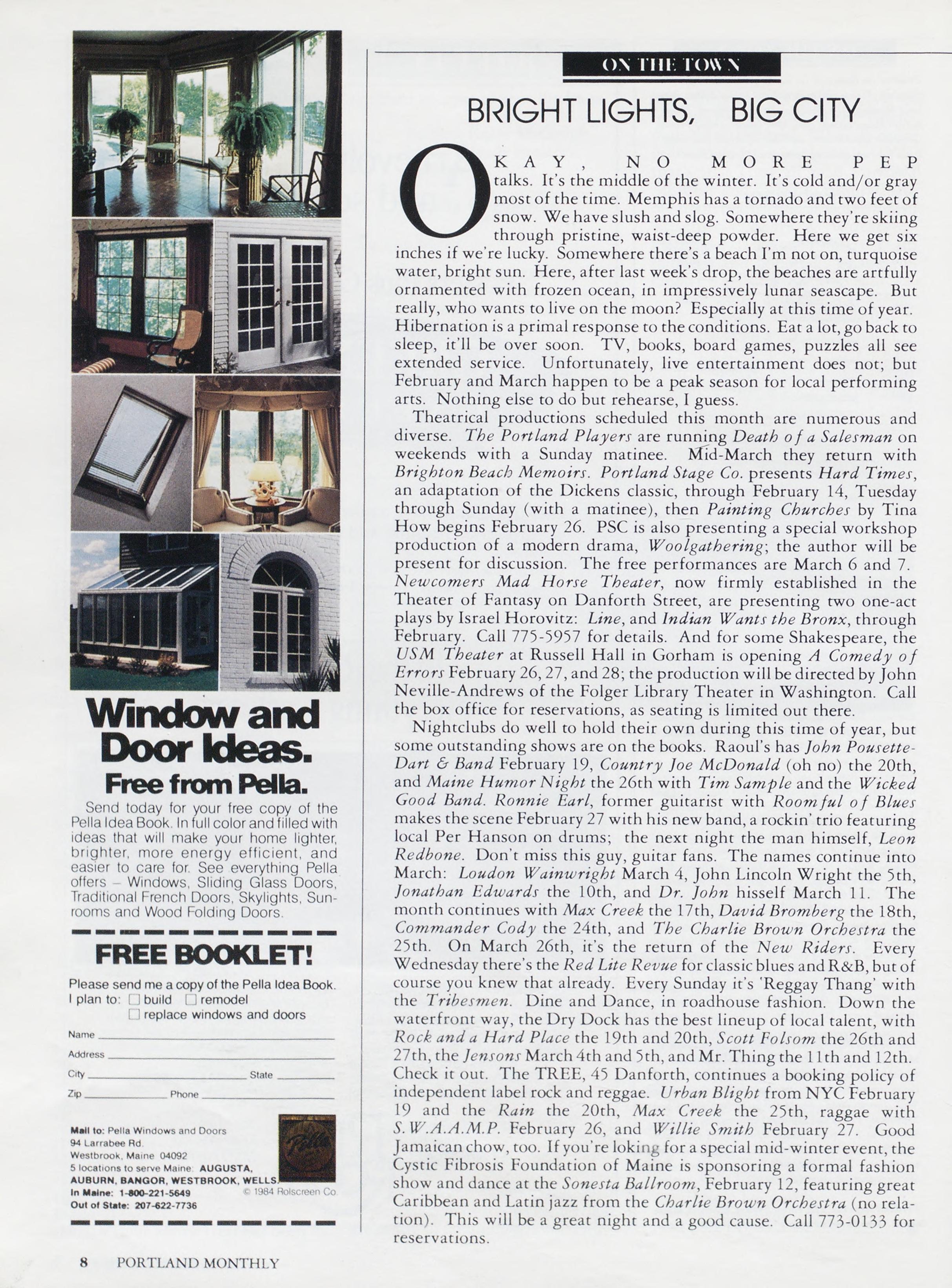 Theatrical productions scheduled this month are numerous and diverse. The Portland Players arerunningDeath of a Salesman on weekends with a Sunday matinee. Mid-March they return with Brighton Beach Memoirs. Portland Stage Co.presentsHard Times, anadaptationoftheDickensclassic,throughFebruary14,Tuesday through Sunday (with a matinee), then Painting Churches by Tina HowbeginsFebruary26.PSCisalsopresentingaspecialworkshop production of a modern drama, Woolgathering-, theauthorwillbe presentfordiscussion.ThefreeperformancesareMarch6and7. Newcomers Mad Horse Theater, now firmly established in the TheaterofFantasyonDanforthStreet,arepresentingtwoone-act playsbyIsraelHorovitz: Line, andIndianWantstheBronx, through February.Call775-5957fordetails.AndforsomeShakespeare,the USM Theater atRussellHallinGorhamisopeningA Comedy of ErrorsFebruary26,27,and28;theproductionwillbedirectedbyJohn Neville-AndrewsoftheFolgerLibraryTheaterinWashington.Call theboxofficeforreservations,asseatingislimitedoutthere. Nightclubsdowelltoholdtheirownduringthistimeofyear,but someoutstandingshowsareonthebooks.Raoul’shasJohnPousetteDart & BandFebruary19, Country Joe McDonald(ohno)the20th, andMaine Humor Nightthe26thwith Tim Sampleandthe Wicked Good Band. Ronnie Earl,formerguitaristwith Roomful of Blues makesthesceneFebruary27withhisnewband,arockin’triofeaturing local Per Hanson on drums; the next night the man himself, Leon Redbone.Don’tmissthisguy,guitarfans.Thenamescontinueinto March: Loudon Wainwright March4,JohnLincolnWrightthe5th, Jonathan Edwards the10th,and Dr. John hisself March 11. The monthcontinueswithMax Creekthe17th,David Brombergthe18th, Commander Codythe24th,and The Charlie Brown Orchestrathe 25th. On March 26th, it’s the return of the New Riders. Every Wednesdaythere’stheRedLiteRevueforclassicbluesandR&B,butof courseyouknewthatalready.EverySundayit’s'ReggayThang’with the Tribesmen. Dine and Dance, in roadhouse fashion. Down the waterfrontway,theDryDockhasthebestlineupoflocaltalent,with Rock and a Hard Placethe19thand20th,ScottFolsomthe26thand 27th,theJensonsMarch4thand5th,andMr.Thingthe11thand12th. Checkitout.TheTREE,45Danforth,continuesabookingpolicyof independentlabelrockandreggae. UrbanBlight from NYC February 19 and the Rain the 20th, Max Creek the 25th, raggae with S.W.A.A.M.P. February 26, and Willie Smith February 27. Good Jamaicanchow,too.Ifyou’relokingforaspecialmid-winterevent,the CysticFibrosisFoundationofMaineissponsoringaformalfashion showanddanceattheSonestaBallroom,February12,featuringgreat CaribbeanandLatinjazzfromtheCharlie Brown Orchestra(norela¬ tion).Thiswillbeagreatnightandagoodcause.Call773-0133for reservations.