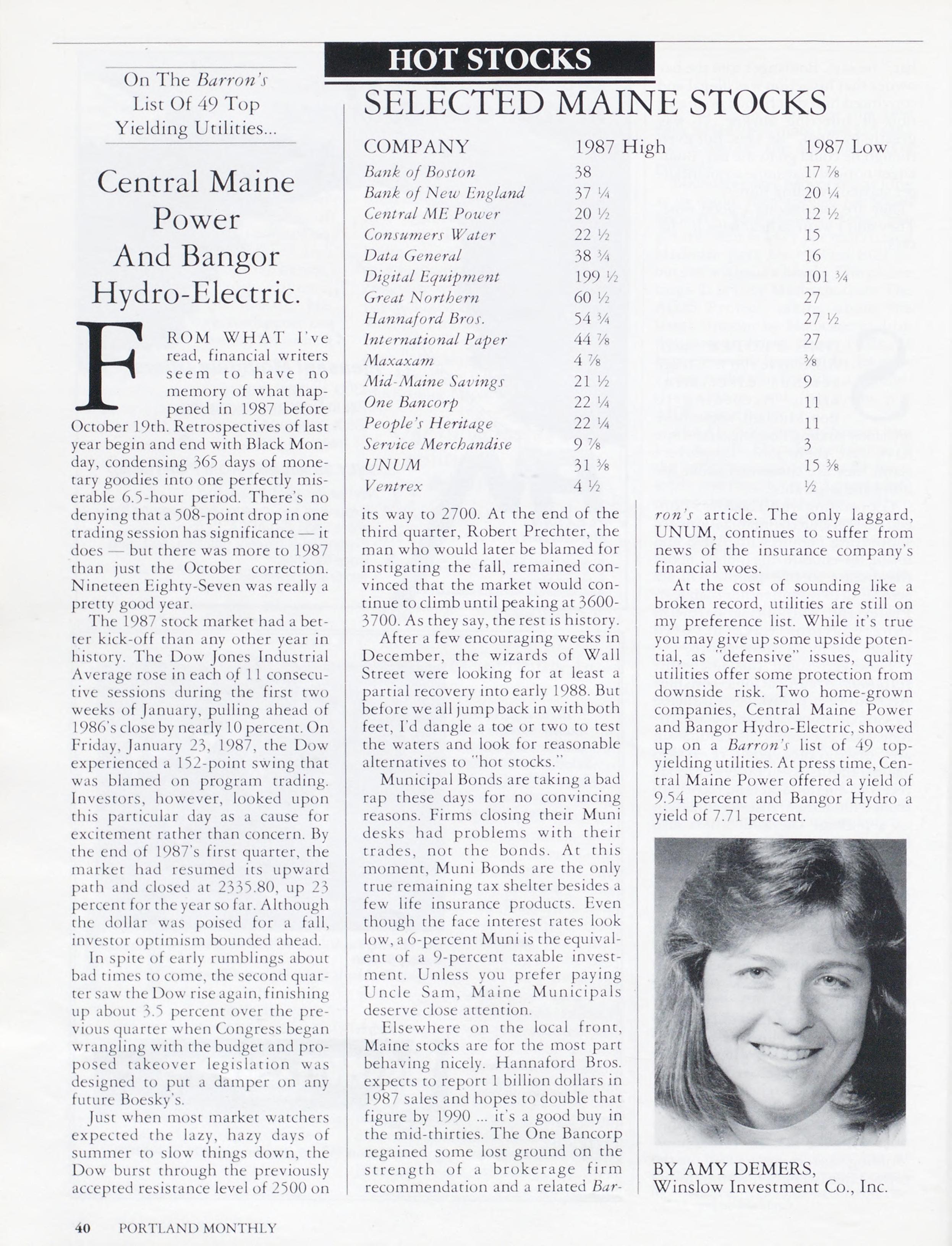 At the cost of sounding like a brokenrecord,utilitiesarestillon mypreferencelist.Whileit’strue youmaygiveupsomeupsidepoten¬ tial,as"defensive”issues,quality utilitiesoffersomeprotectionfrom downside risk. Two home-grown companies, Central Maine Power andBangorHydro-Electric,showed up on a Barron's listof49top¬ yieldingutilities.Atpresstime,Cen¬ tralMainePowerofferedayieldof 9.54 percent and Bangor Hydro a yieldof7.71percent.