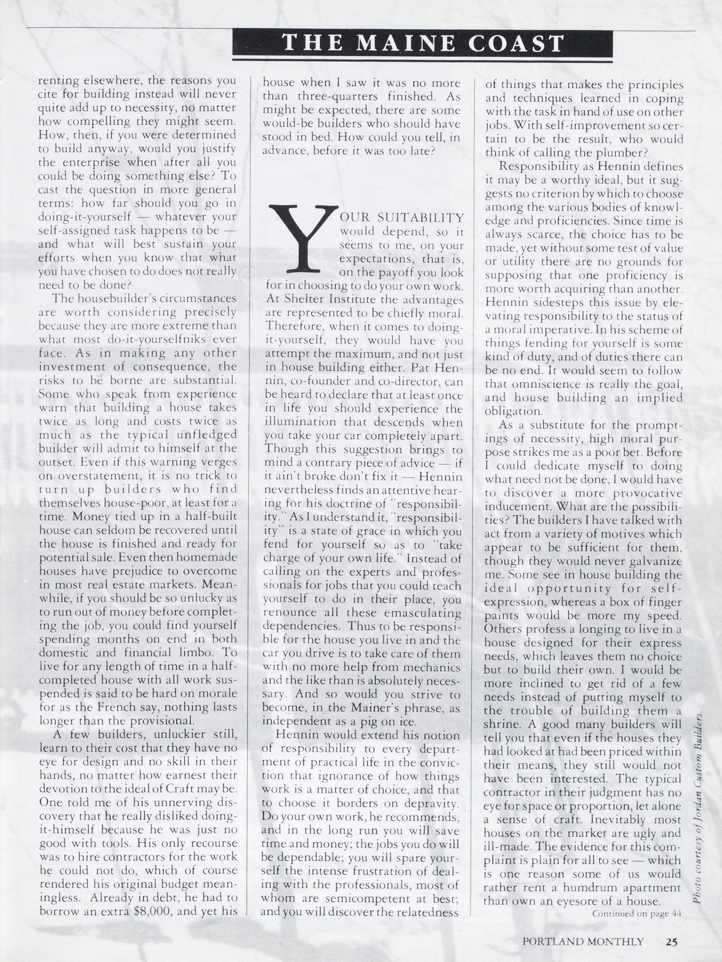 Jordan Custom Builders, 24 Laskey Road, Wind¬ ham. Mame 04062 (207) 892-3433.