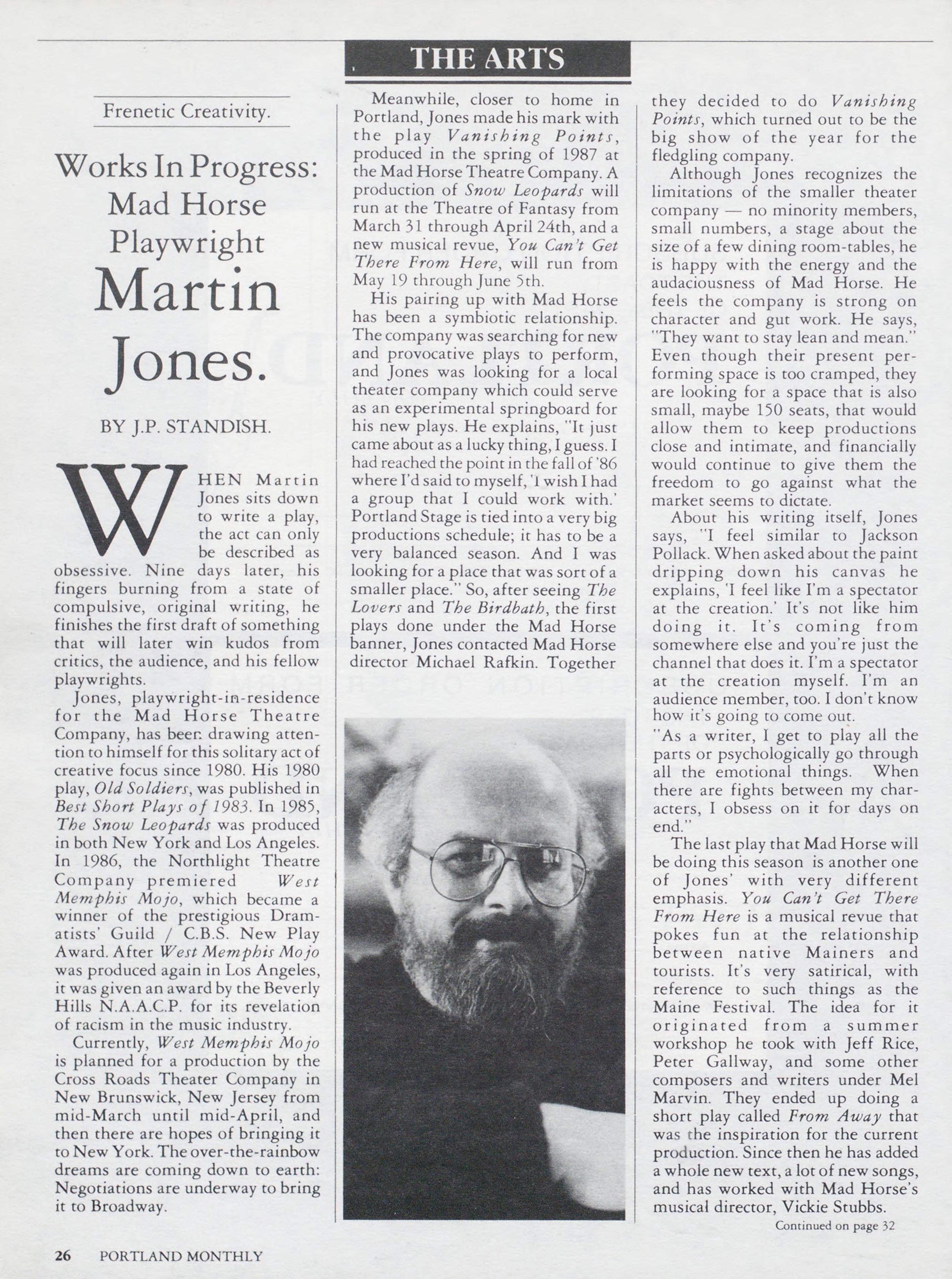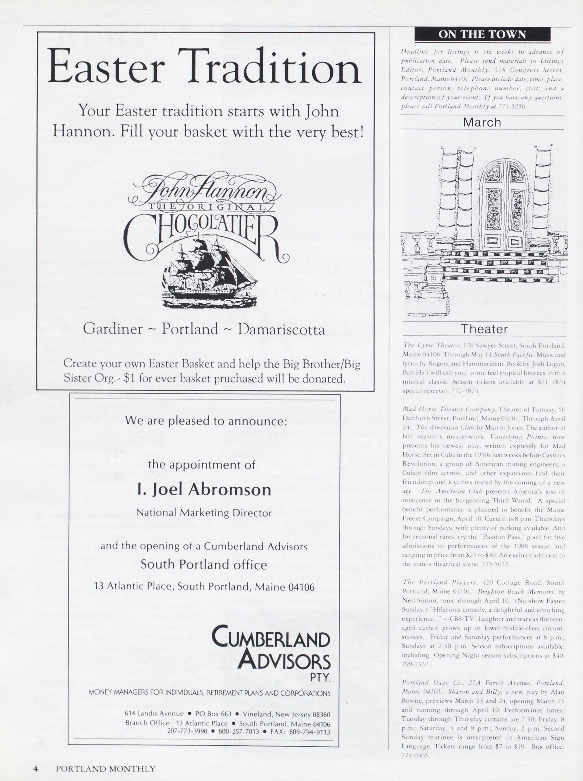 Afa*/ Horse I heater t.ompany,Iheateroflantasy,50 Danforth Street. Portland. Mame 01101 Th rough April 21 /heAmerican(.luh, byMartin|ones.Theauthorof last seasons masterwork. Vanishing Points, now presents his newest plav. written expressly for Mad HorseSetinCubamthe1050sjustweeksbeforeCastro's Revolution, a group of American mining engineers, a Cuban film actress, and other expatriates find their friendshipandloyaltiestestedbythecomingofanew age I hs American Club presents America’s loss of innocence in the burgeoning Third World A special benefit performance is planned to benefit the Mame breeze Campaign. April 10. Curtain is S pm. Thursdays throughSundays,withplentyofparkingavailable.And lorseasonalrates,trythePassionPass.'goodtorfive admissions to performances of the I98S season and rangingmpricefrom$25toS10Anexclientadditionto thestate'stheatricalscene775-5657.