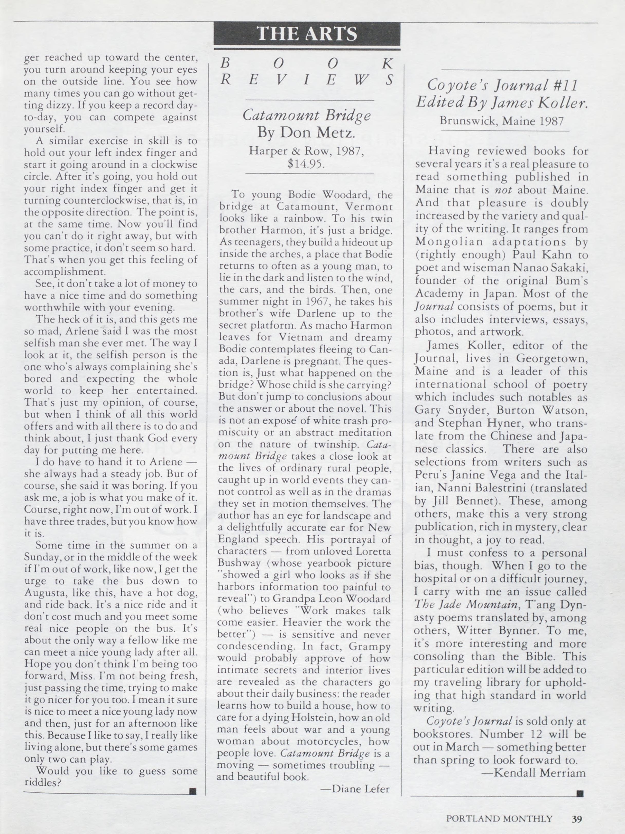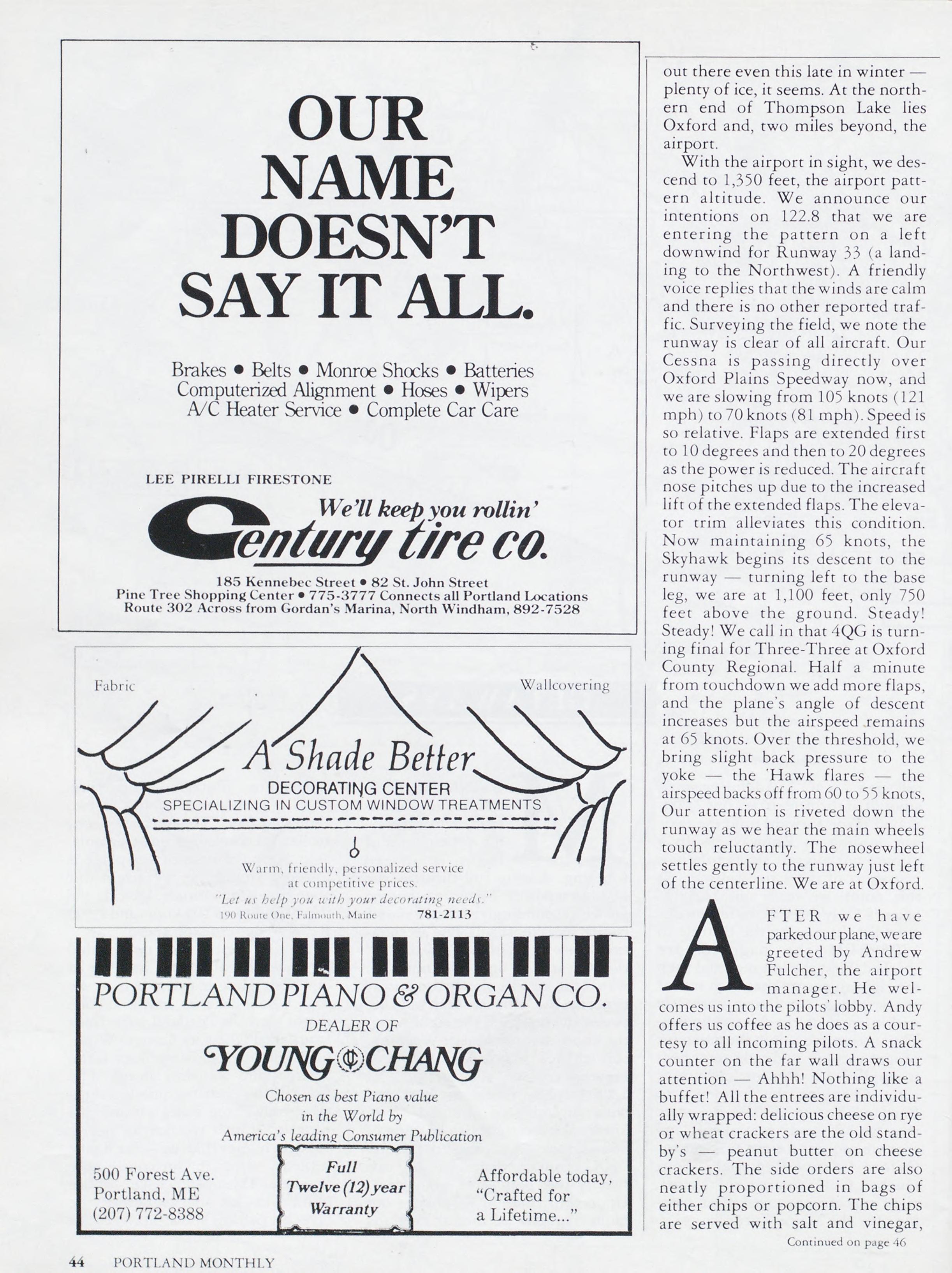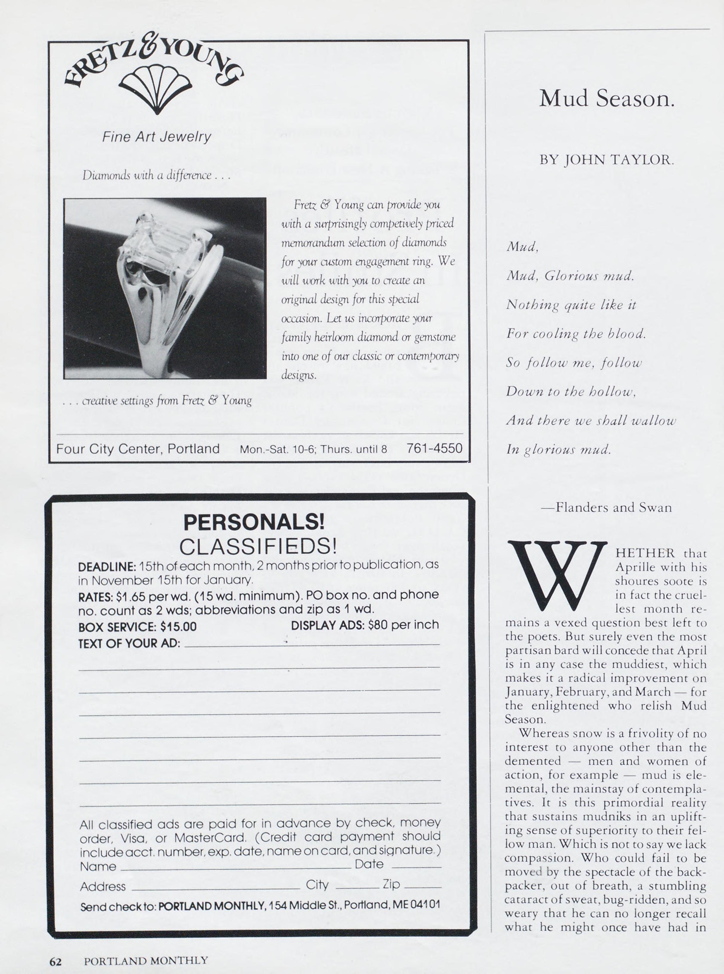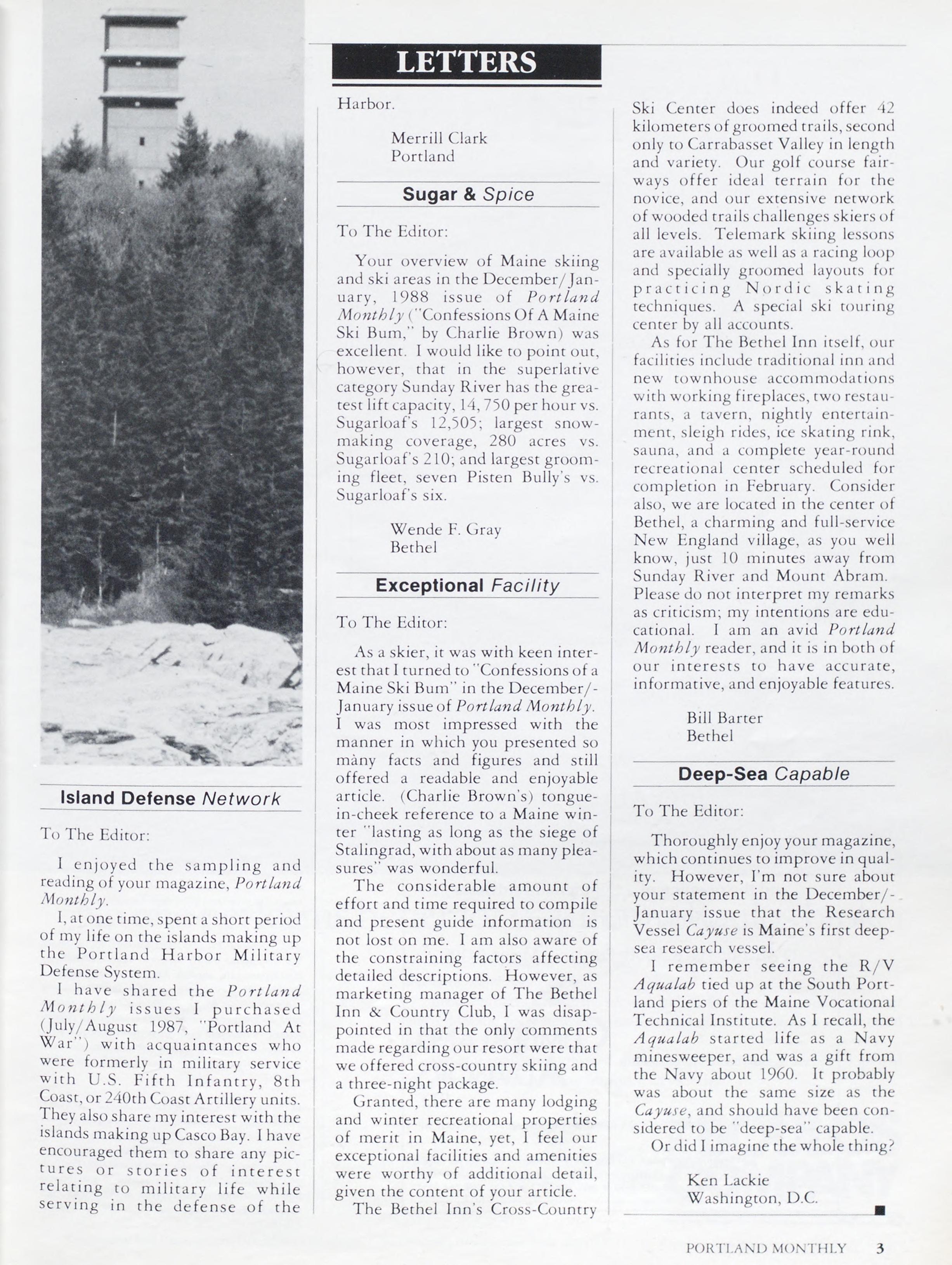 Asaskier,itwaswithkeeninter¬ estthatIturnedto"Confessionsofa Maine Ski Bum” in the December/JanuaryissueofPortland Monthly. I was most impressed with the j manner in which you presented so many facts and figures and still offered a readable and enjoyable article.(CharlieBrown’s)tonguein-cheekreferencetoaMainewin¬ ter"lastingaslongasthesiegeof Stalingrad,withaboutasmanyplea¬ sures”waswonderful.
