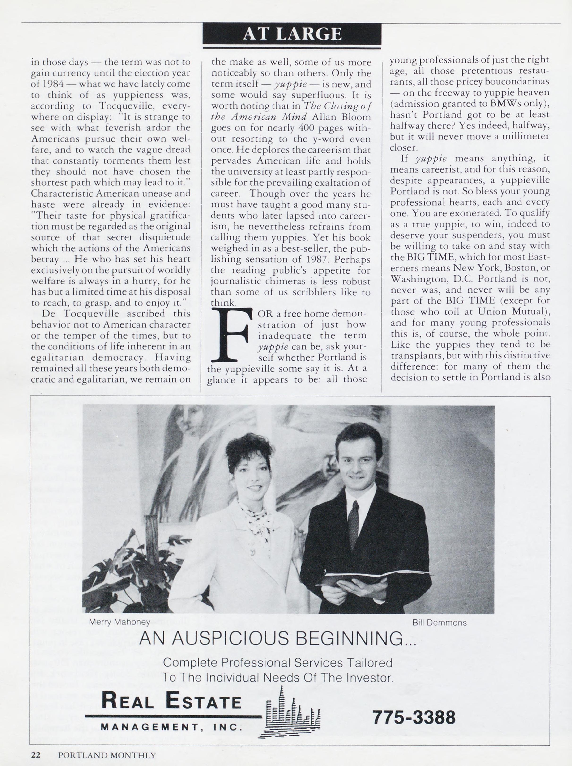 March I OSS. Vol. 5. No 2. copyright I OSS bv Portland Monthly. Inc All rights reserved. PortlandMonthlyismailedatthird-classmail rates m Portland. MI OllOl. t ISSN 088 7-5Gib. Opinions expressed in articles are those ol authorsanddonotrepresenteditorialpositionsol Portland Monthly. Letters to the editor are welcomeandwillbe-treatedasunconditionally assignedtorpublicationandcopyrightpurposes andassubjecttoPortlandMonthly’sunrestricted righttoeditandcommenteditoriallyNothingin thisissuemaybe-reprintedinwholeorinpart withoutwrittenpermissionfromthepublishers.