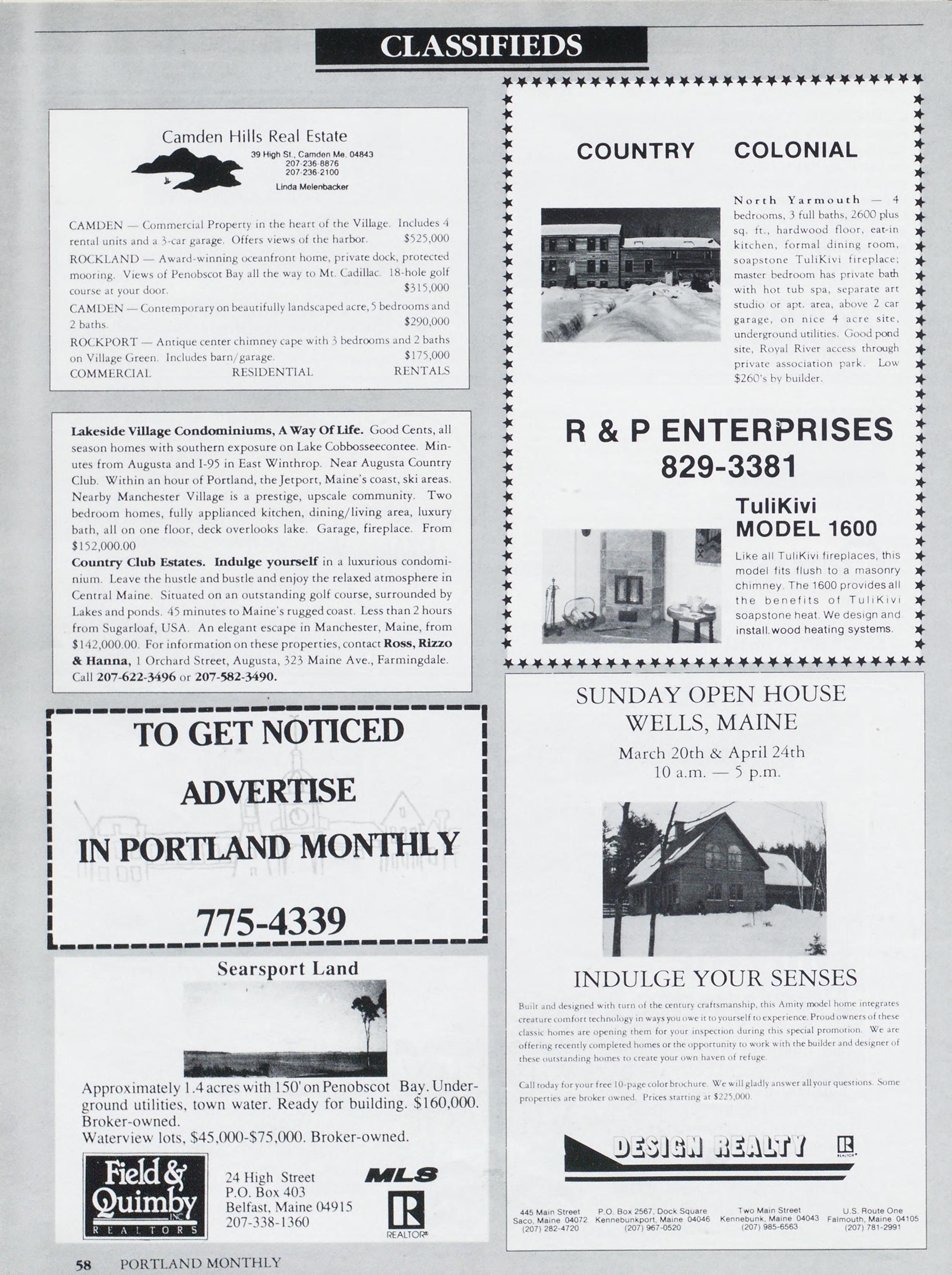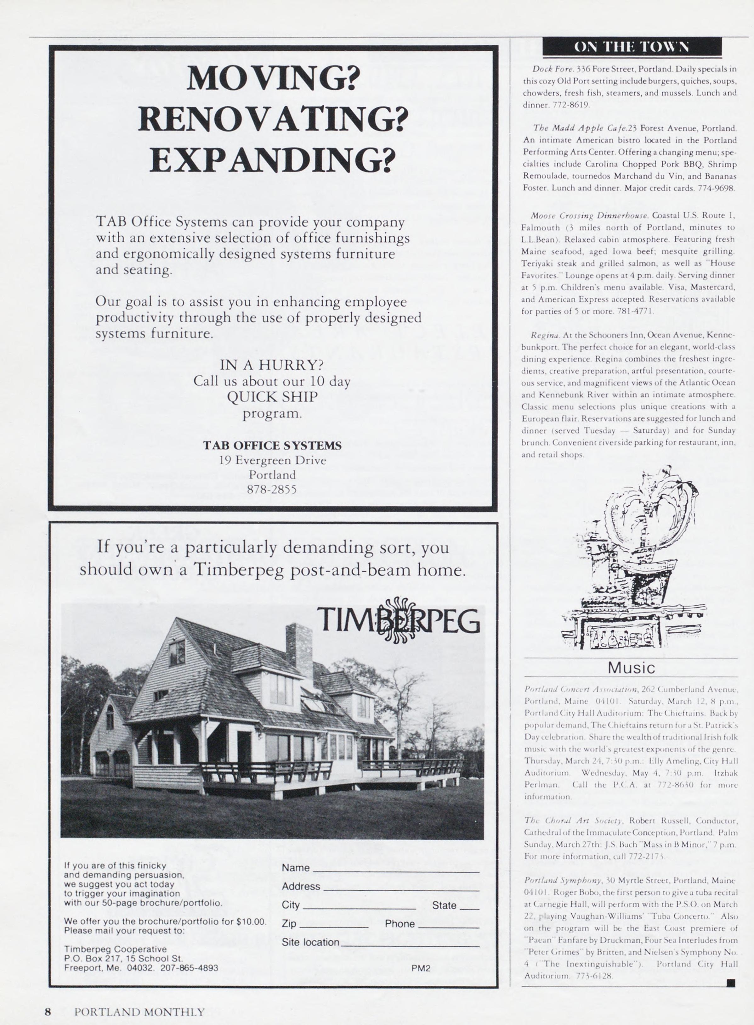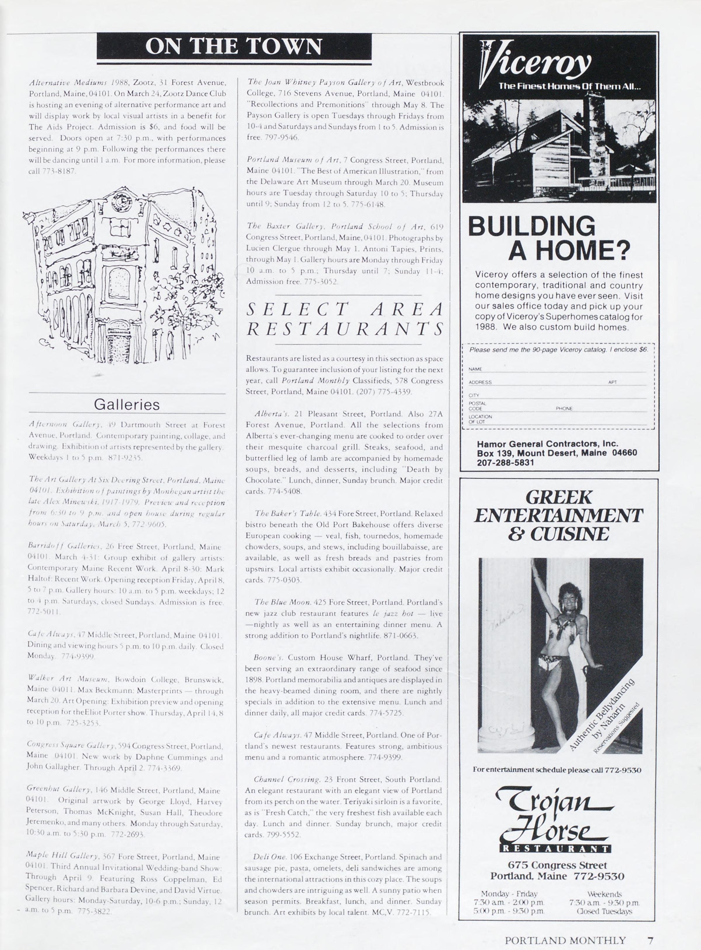 Deadline for lutings is fix weds m advance of publication dale. Please send materials to Listings Editor. Portland Monthly. 578 Congress Street. Portland.Mame04101.Pleaseincludedate.lime,place, contact person, t e lephone number, cost, and a dessripstono/youretent.I/youhatean)questions, pleats, call Portland Monthly at 77y 5250