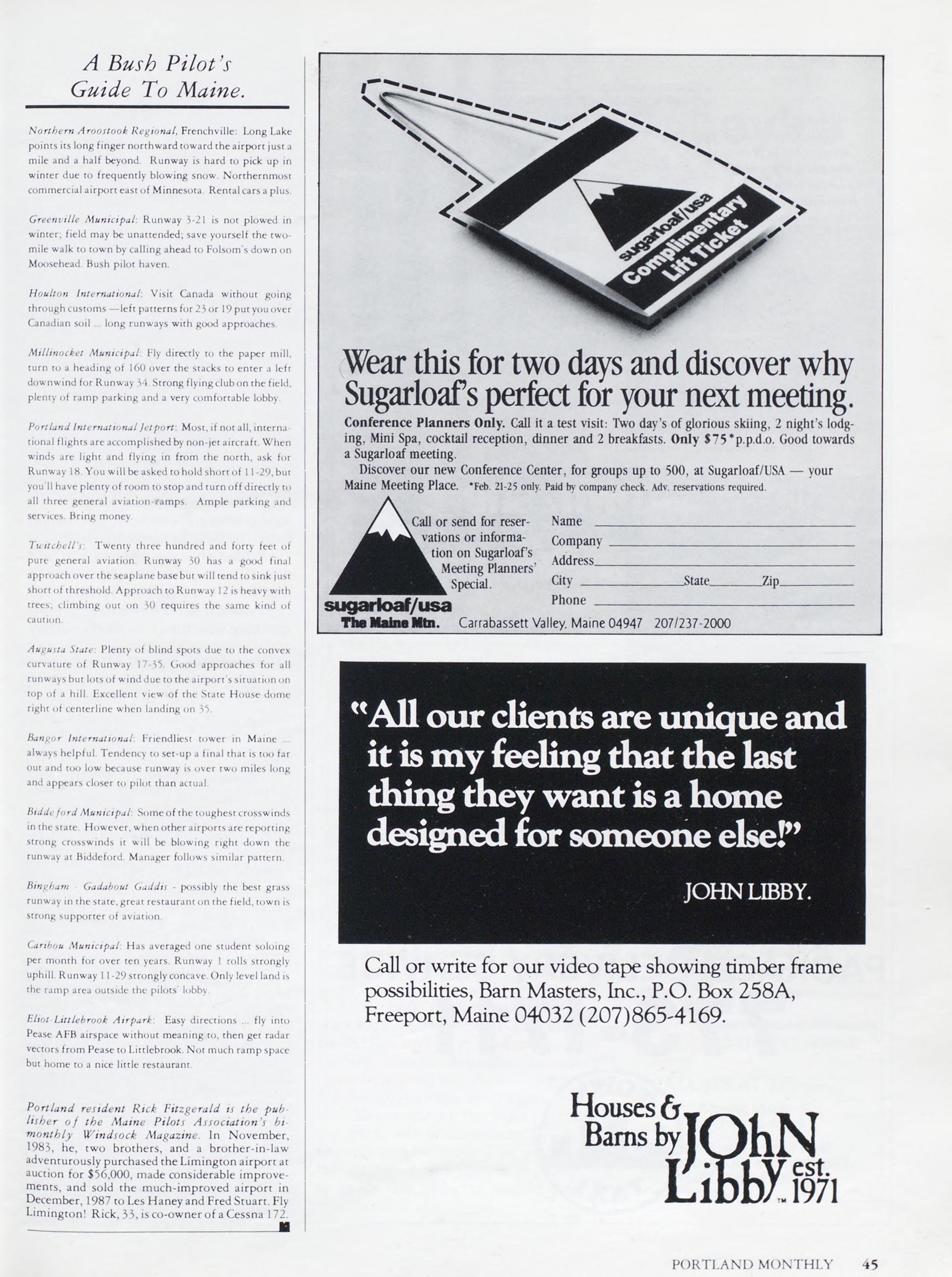 AsforTheBethelInnitself,our facilitiesincludetraditionalinnand new townhouse accommodations withworkingfireplaces,tworestau¬ rants,atavern,nightlyentertain¬ ment,sleighrides,iceskatingrink, sauna, and a complete year-round recreationalcenterscheduledfor completion in February. Consider also,wearelocatedinthecenterof Bethel,acharmingandfull-service New England village, as you well know, just 10 minutes away from Sunday River and Mount Abram. Pleasedonotinterpretmyremarks ascriticism;myintentionsareedu¬ cational. I am an avid Portland Monthlyreader,anditisinbothof our interests to have accurate, informative,andenjoyablefeatures.