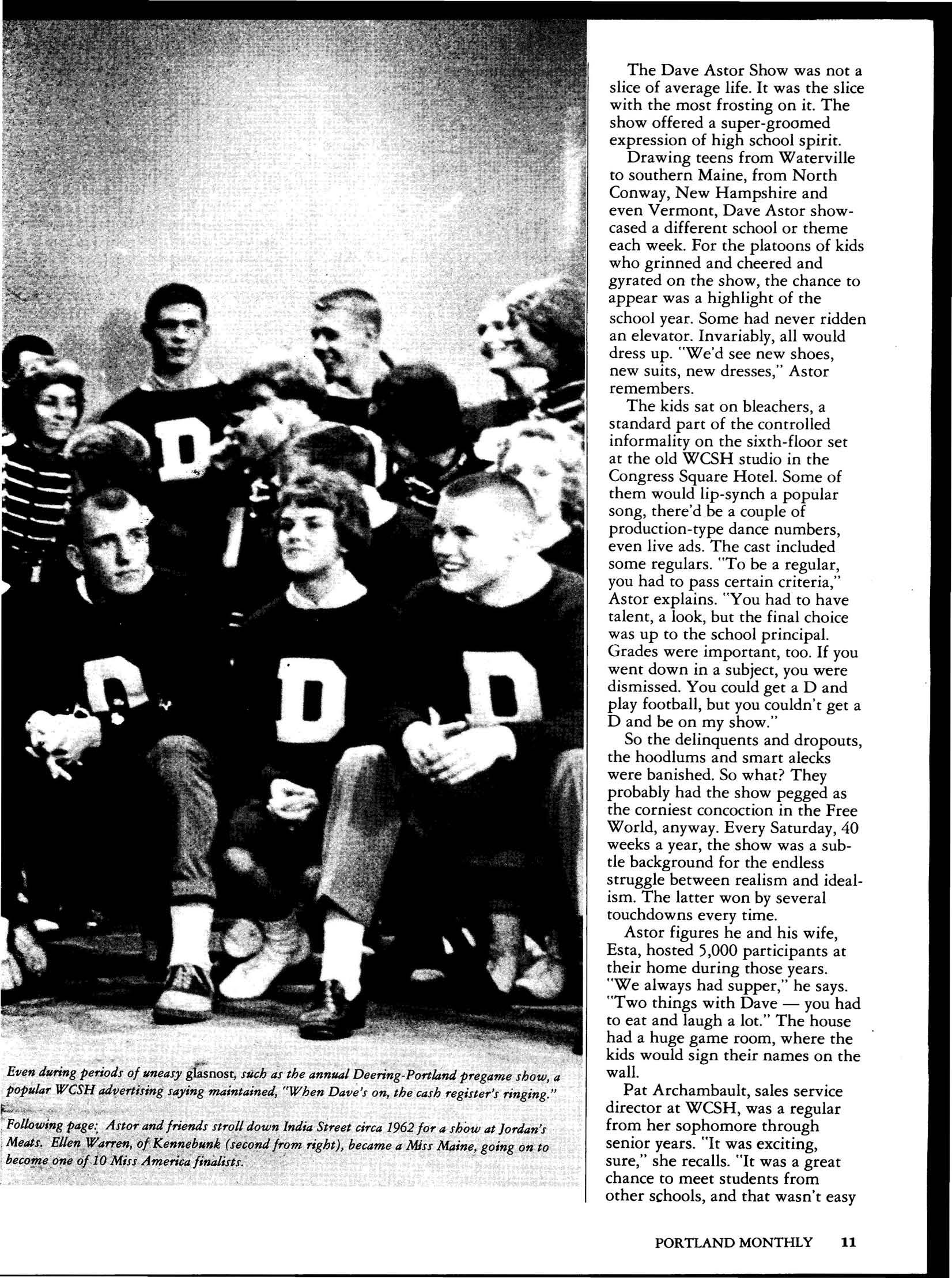 It ended its spirited run on Maine television almost 20 years ago, but residents still have vivid reruns playing in their memories. "Ooooh!" a former Portland High cheerleader squeals at the mention of Dave Astor. "I re member THE that show! It was real exciting!" She recalls the host as a large man wid a bald head. HOh, golly, he was very friendly, and he really liked doing thing with the kids," she says. Fred Nutter, a WCSH newscaster working in radic then, remember the show vividly "It was tee vee a its live, loca best," he says "Three-quarter: of the people In Portlanc now be· tween3( and 4( eithel watchec: it or wen partICI' pants." Mainers remember the show as clearly as the Prom anc the Homecoming Game. If tnere is anyone who doesn', grin at the memory, he hasn't surfaced. Jack Dexter (Cape Elizabeth High, '61) earned $1.25 ar hour as floor manager for Channel 6 back then. He watchec the show even before that. "That's where you sawall the: good-looking girls," he recalls. Dexter is now president oj the Maine Chamber of Commerce and Industry. From our vantage point in these high-tech times, the: notion of a homegrown television show in the late 1950s sounm quaint. The Dave Astor Show exceeded expectations. "It was a lot of things to a lot of people, a lot of razzledazzle." The show' raised thousands of dollars for charities such as cerebral palsy centers and high school bands. Five Miss Maines in a ro\V were regulars. The show and its host received a multitude of awards from churches, high schools, even the American Legion, the Maine State Highwa~ Safety Commission, and the state legislature. Governor John Reed credited his 1960 appearance on the show, dancing and mingling with the TV teenagers, with winning him reelection.