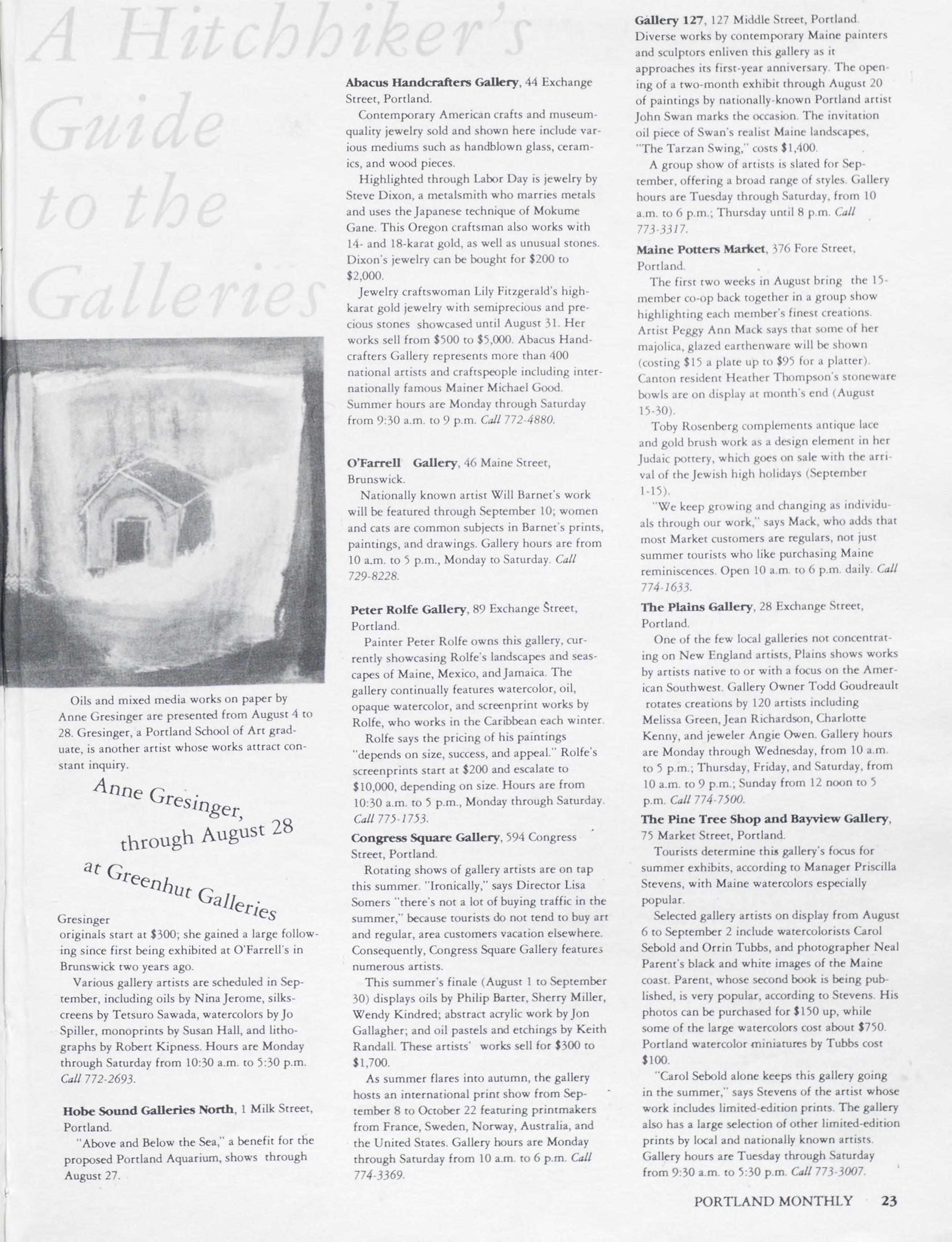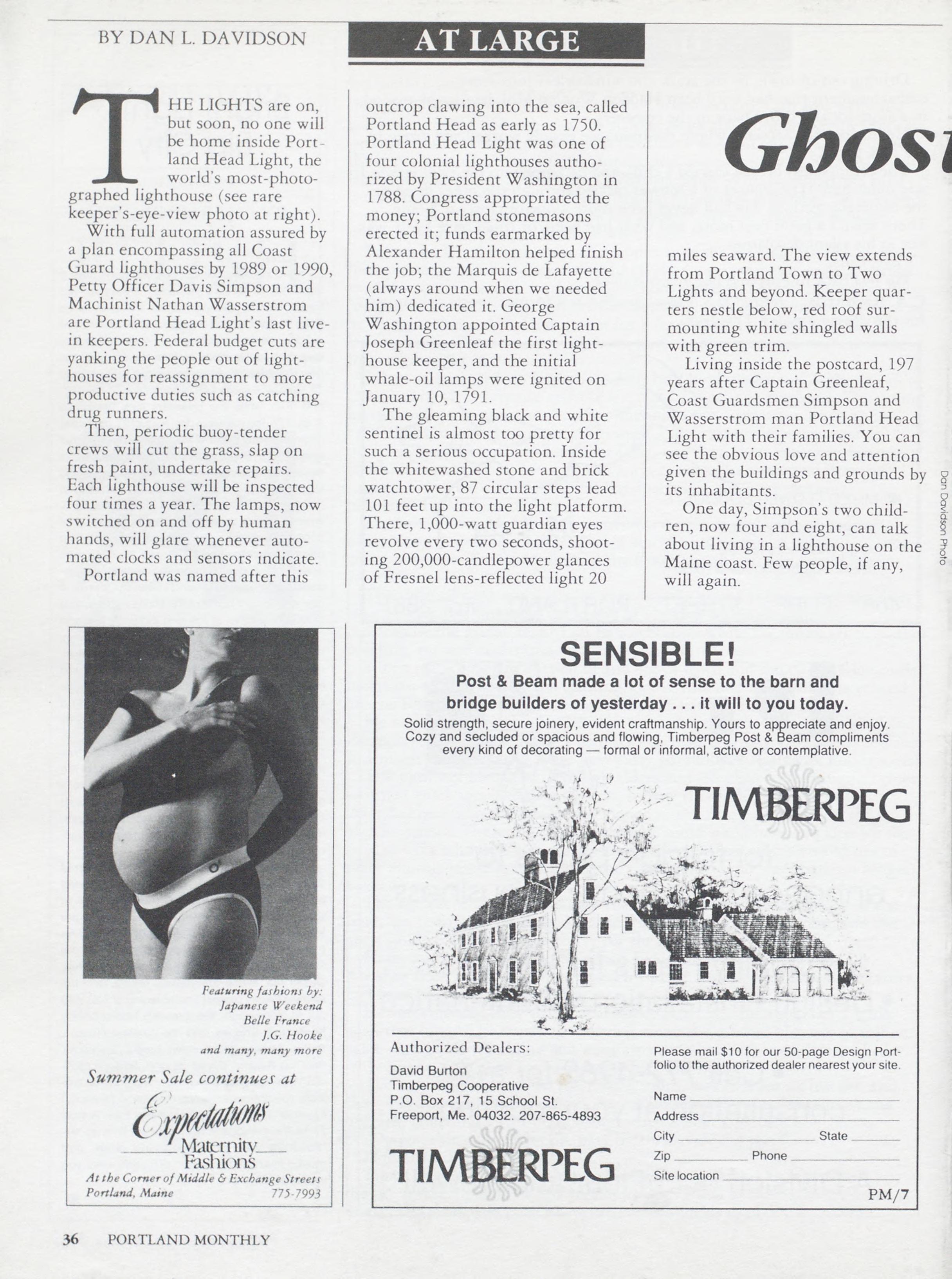 July/August1988,Vol.3,No.6,copyright1988 byPortlandMonthly,Inc.Allrightsreserved. PortlandMonthlyismailedatsecond-class pendingmailratesinPortland,ME04101.(ISSN: 0887-5340).Opinionsexpressedinarticlesare thoseofauthorsanddonotrepresenteditorial positionsofPortlandMonthly.Letterstothe editorarewelcomeandwillbetreatedasuncon¬ ditionallyassignedforpublicationandcopyright purposesandassubjecttoPortlandMonthly’s unrestrictedrighttoeditandcommenteditorially. Nothinginthisissuemaybereprintedinwholeor inpartwithoutwrittenpermissionfromthe publishers.Postmaster:Sendaddresschangesto: 578CongressStreet,Portland,Maine04101. Returnpostagemustaccompanyallmanuscripts andphotographssubmittediftheyaretobe returned,andnoresponsibilitycanbeassumedfor unsolicitedmaterials.