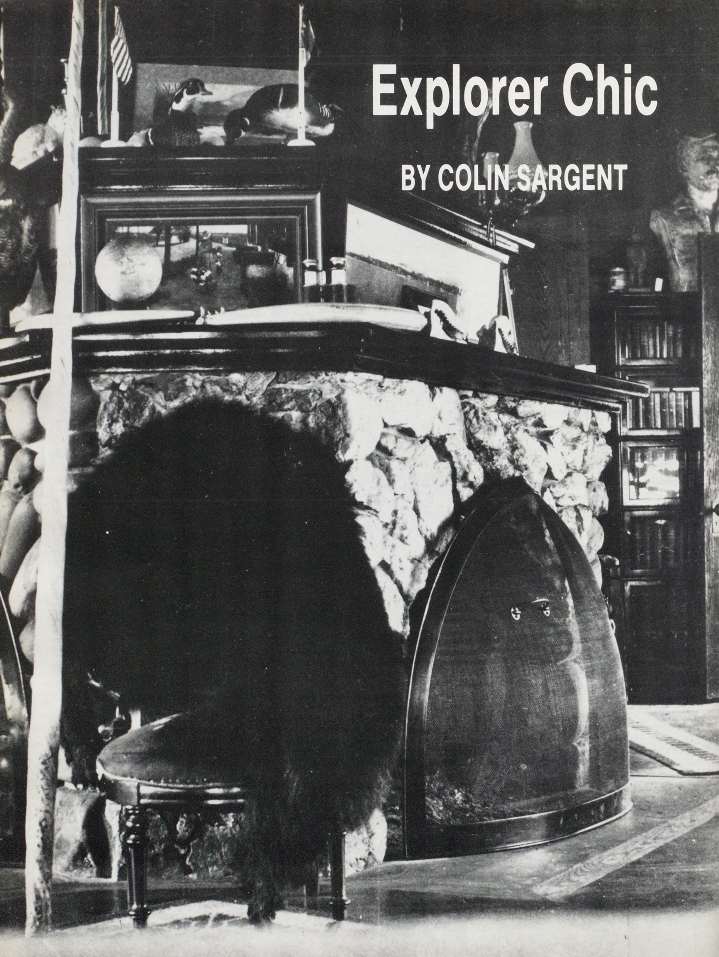Theazimuthswingswhileyourmindslews,a gyrostabilizingonaestheticcertainty.Youlook downatthelittleblueneedleandit'spointingNorth, everNorth,andwhenyoubumpintoearly1920’s photosofMaine’sAdmiralPearysettledintohis arcticjunkandgimrack,yourealizeit’sbeenherein Maineallalong,theEagleIslandmotif,wherea carefullyplacedpolarbearskin,stencilledMacMil¬ lanExpeditioncoffeetable,expeditionpennant,or silverservicefromPeary’sship,theS.S.Roosevelt, canbetheaxisaroundwhichallyournewsurfaces spin.