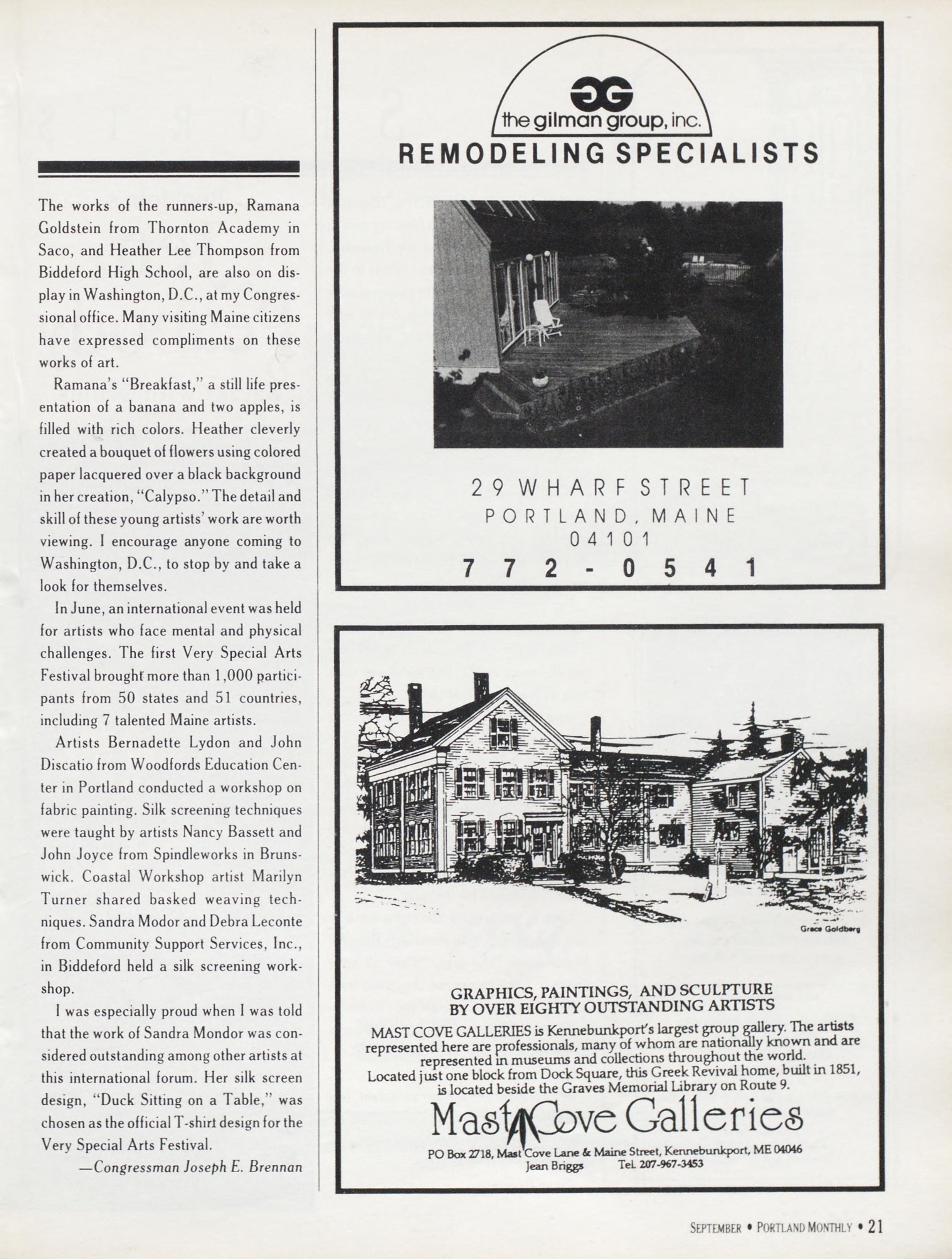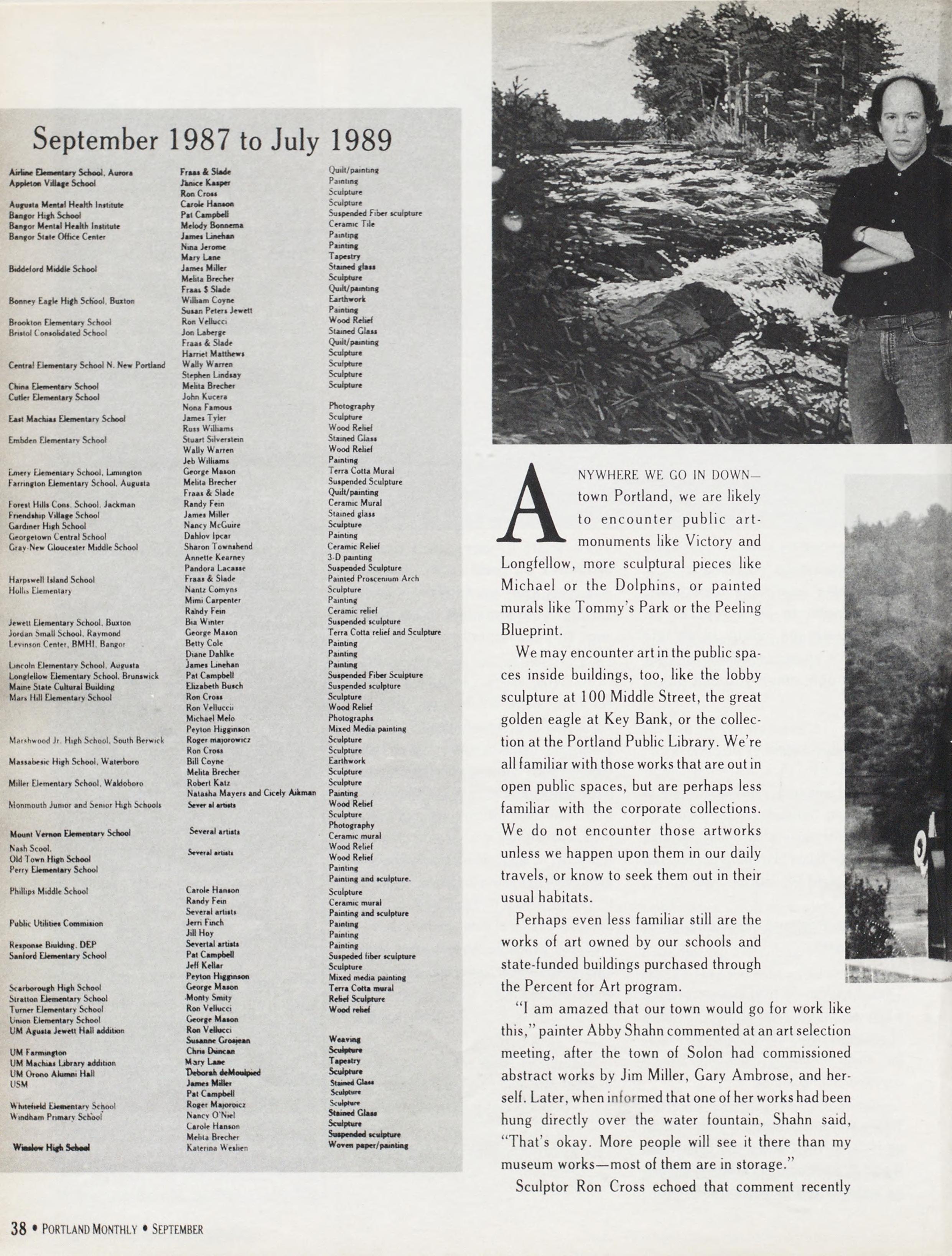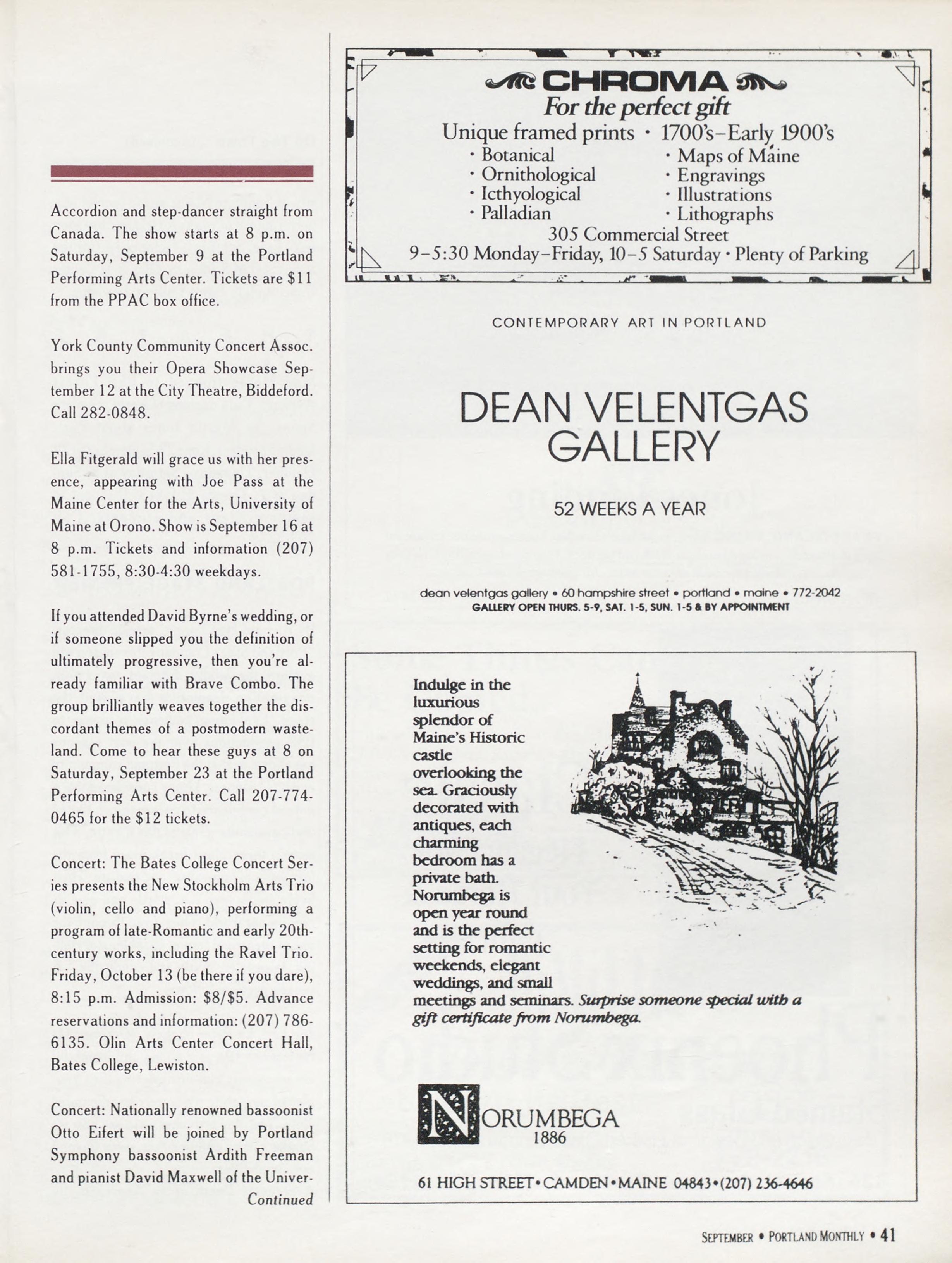 Newsstandcoverdate:September,publ.August1989. Vol.4.No.6,copyright1989byColinandNancySargent Allrightsreserved.PortlandMonthlyismailedatthirdclassmailratesinPortland,ME04101.(ISSN:08875340).Opinionsexpressedinarticlesarethoseofauthors anddonotrepresenteditorialpositionsofPortland Monthly.Nothinginthisissuemaybereprintedinwhole ormpartwithoutwrittenpermissionfromthepublishers. Letterstotheeditorarewelcome.