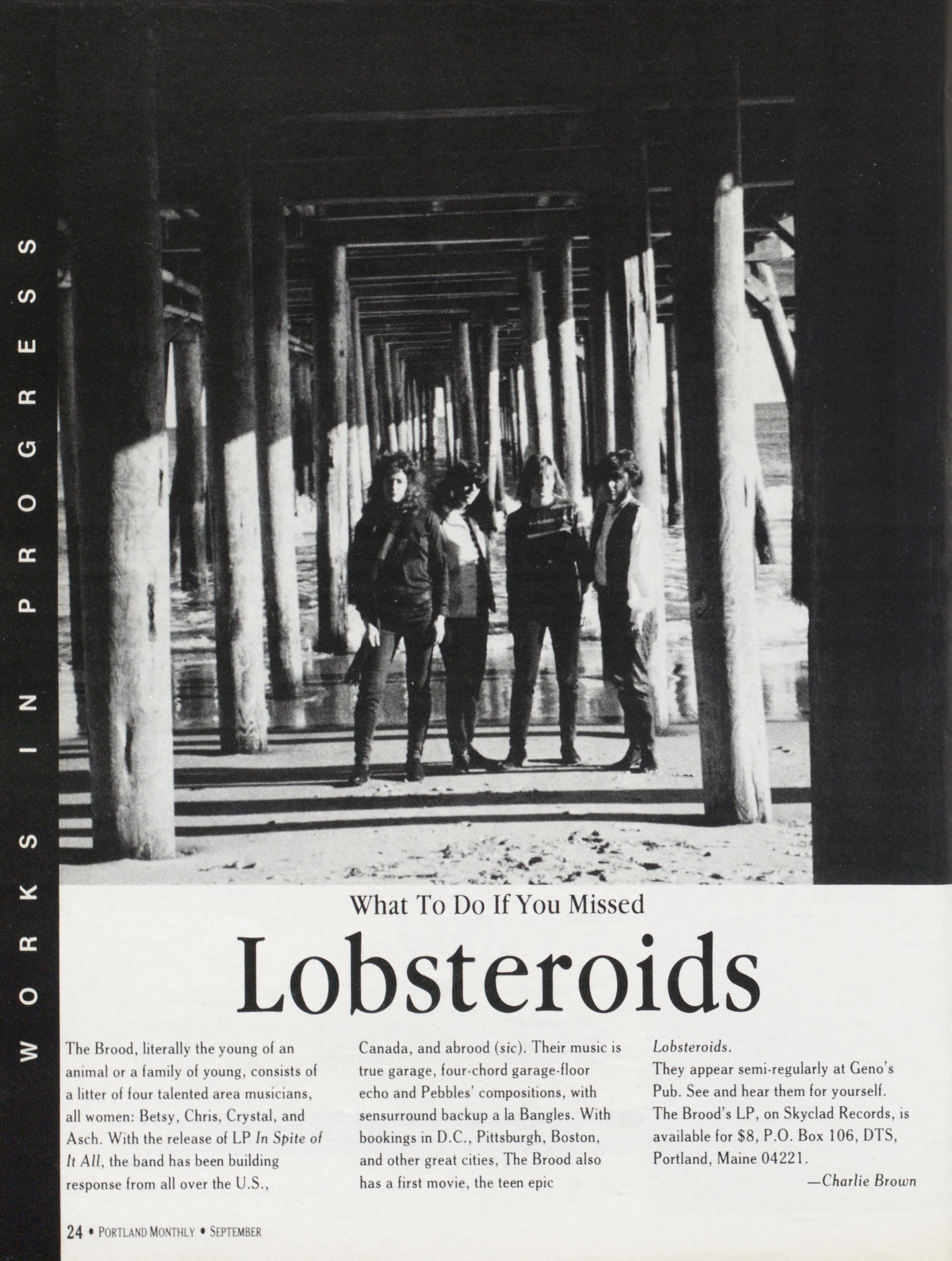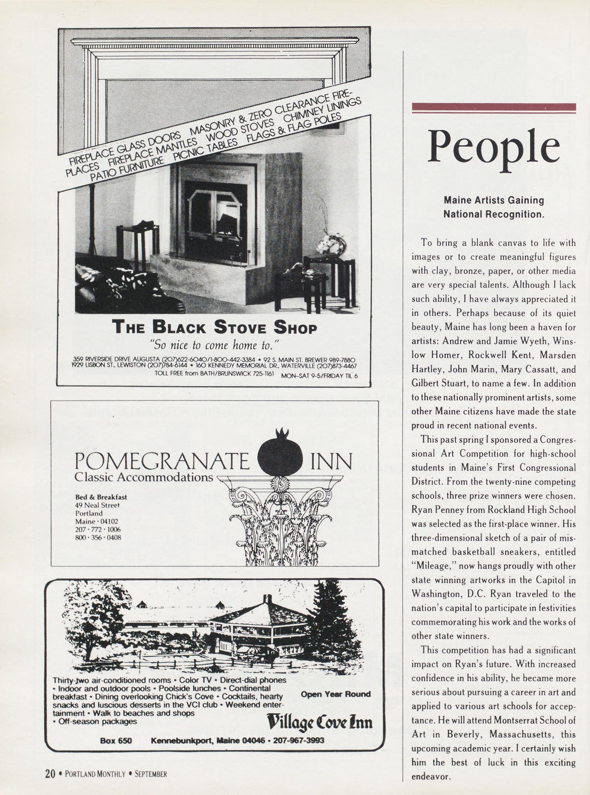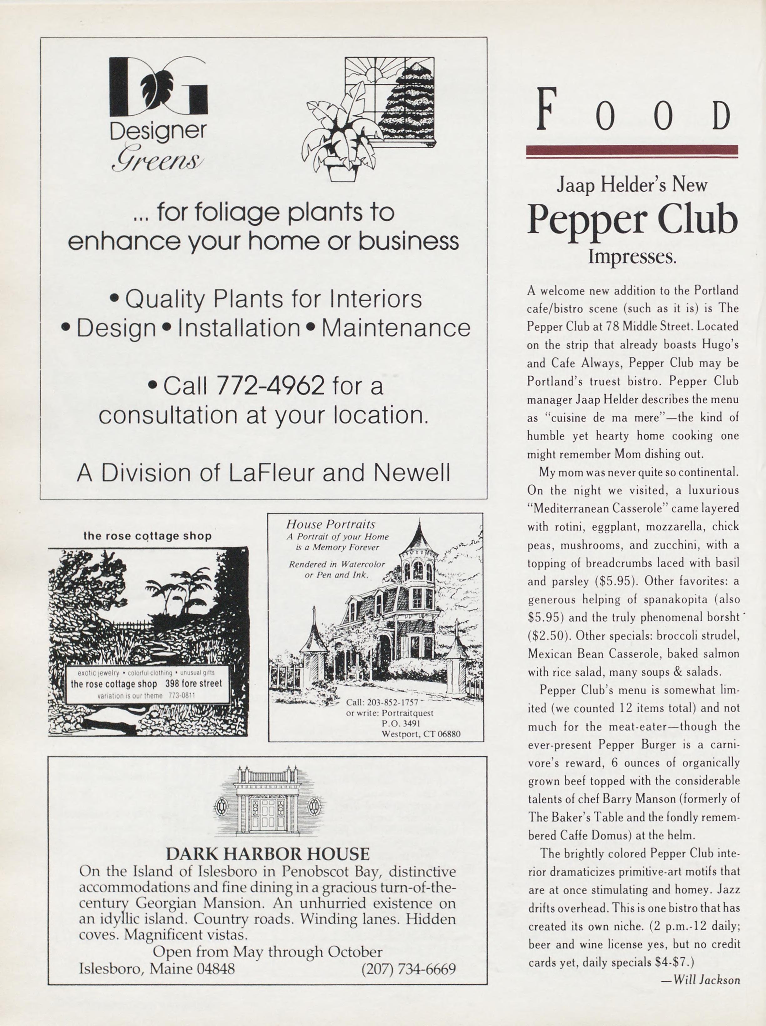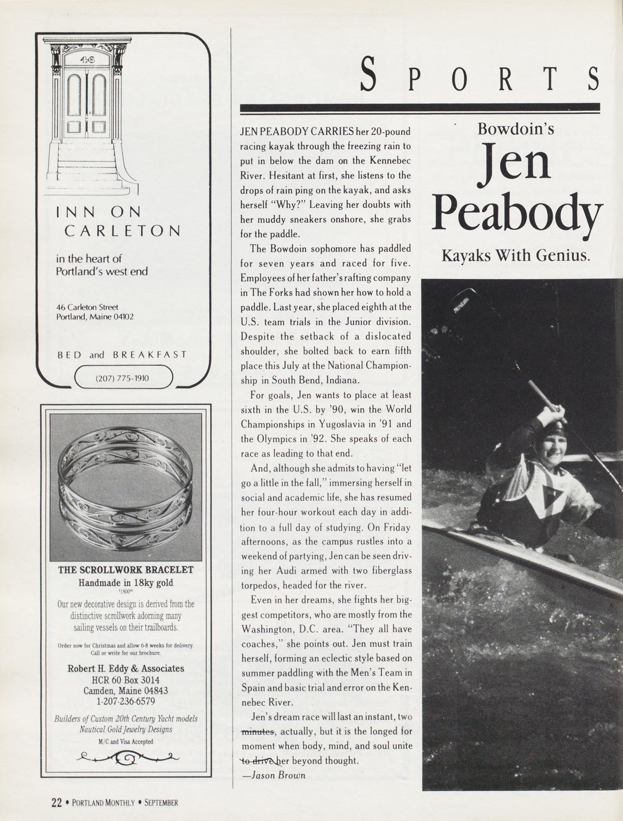 Newsstandcoverdate:September,publ.August1989. Vol.4.No.6,copyright1989byColinandNancySargent Allrightsreserved.PortlandMonthlyismailedatthirdclassmailratesinPortland,ME04101.(ISSN:08875340).Opinionsexpressedinarticlesarethoseofauthors anddonotrepresenteditorialpositionsofPortland Monthly.Nothinginthisissuemaybereprintedinwhole ormpartwithoutwrittenpermissionfromthepublishers. Letterstotheeditorarewelcome.