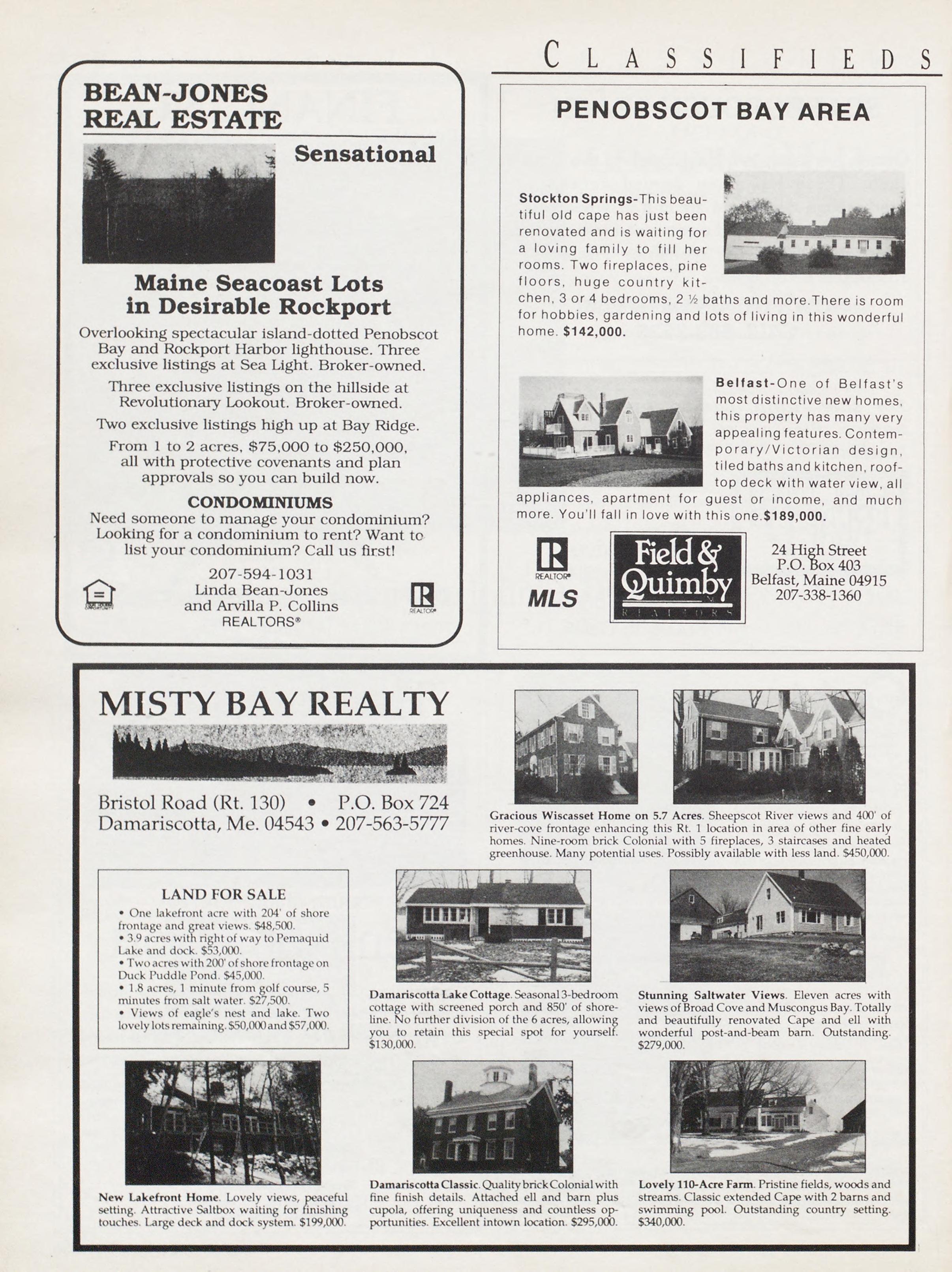 DamariscottaLakeCottage.Seasonal3-bedroom cottagewithscreenedporchand850’ofshore¬ line.Nofurtherdivisionofthe6acres,allowing youtoretainthisspecialspotforyourself. $130,000. DamariscottaClassic.QualitybrickColonialwith finefinishdetails.Attachedellandbarnplus cupola,offeringuniquenessandcountlessop¬ portunities.Excellentintownlocation.$295,0C0.