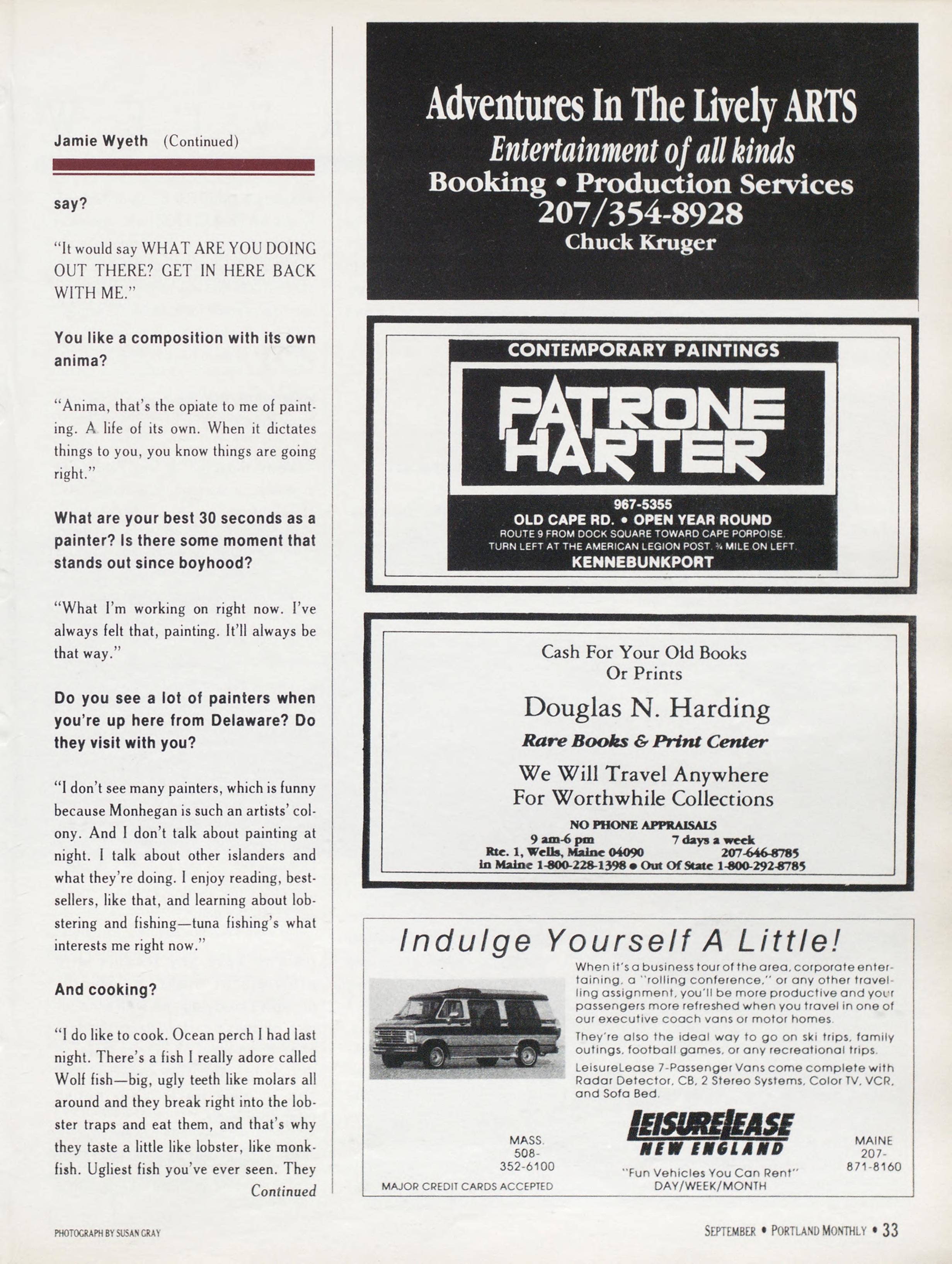 “Jamie Wyeth's bare feet bounce down the hallway of the shingle cottage he's owned since campaigning for Robert F. Kennedy in 1968.Itseemstohangintotheair,overtheocean,facingsoutheast over Lobster Cove, this house.." Cover photograoh ©1989 by Susan Gray Photo this page oy Richard Farrell.