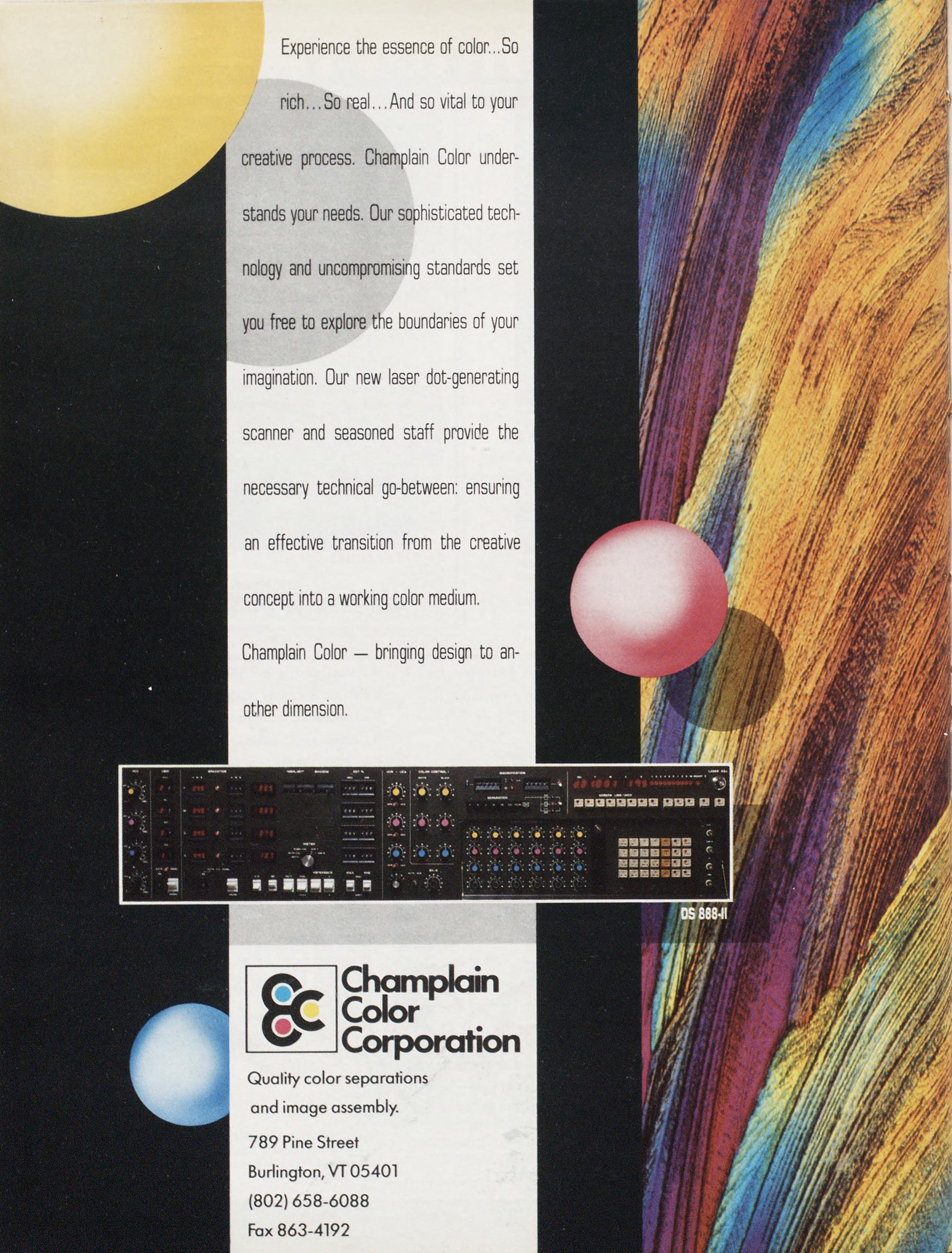 Experiencetheessenceofcolor...So rich...Soreal...Andsovitaltoyour creativeprocess.ChamplainColorunder¬ standsyourneeds.Oursophisticatedtech¬ nologyanduncompromisingstandardsset youfreetoexploretheboundariesofyour imagination.Ournewlaserdot-generating scannerandseasonedstaffprovidethe necessarytechnicalgo-between:ensuring aneffectivetransitionfromthecreative conceptintoaworkingcolormedium. ChamplainColor-bringingdesigntoan¬ otherdimension.