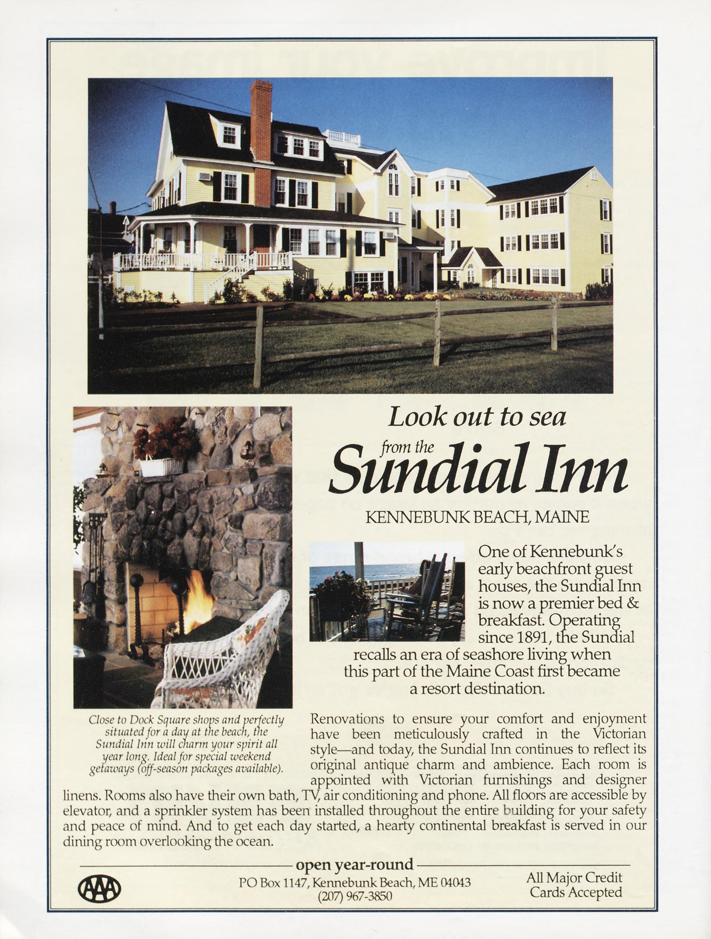 ExperiencetheMaineofyesterdayatthefamous NonantumResortinpicturesqueKennebunkport. Establishedin1883,thischarmingresortoffers fineaccommodations,restaurant,pool, recreationalactivities,andtheambianceofa bygoneera.Walktobeaches,shopsandgalleries, anddiscoverthebestofMaine. Callorwriteforreservationsormoreinformation.