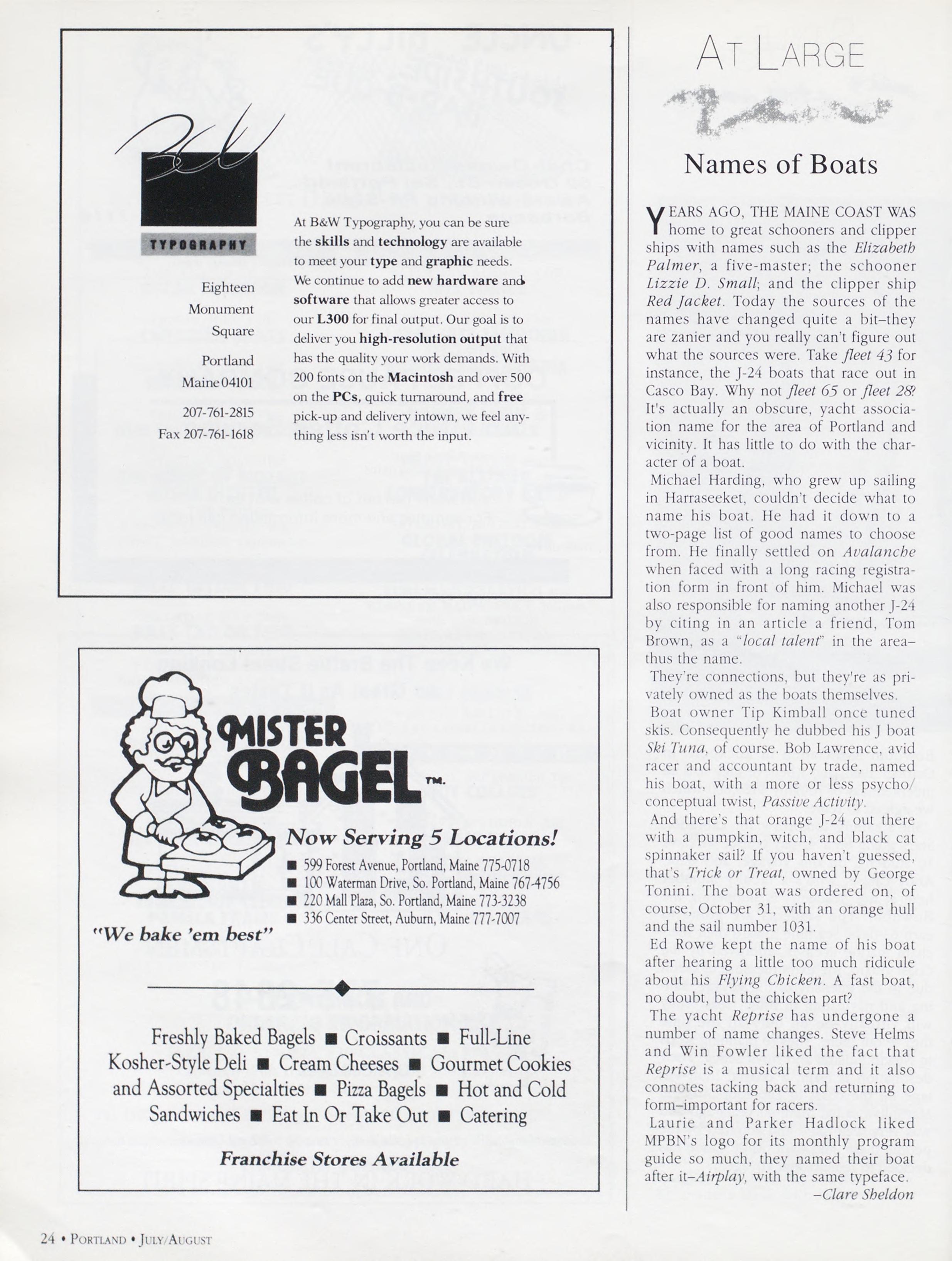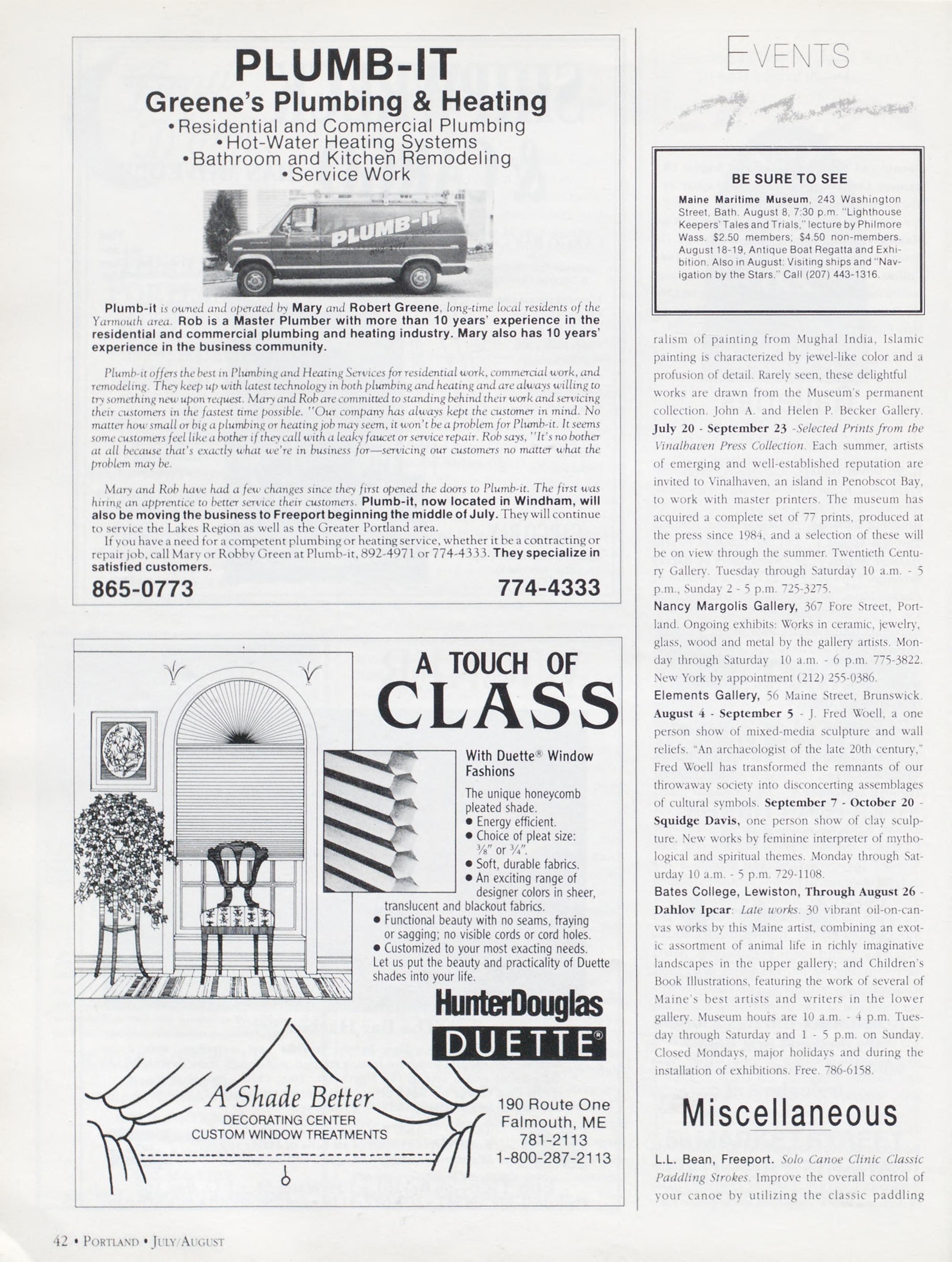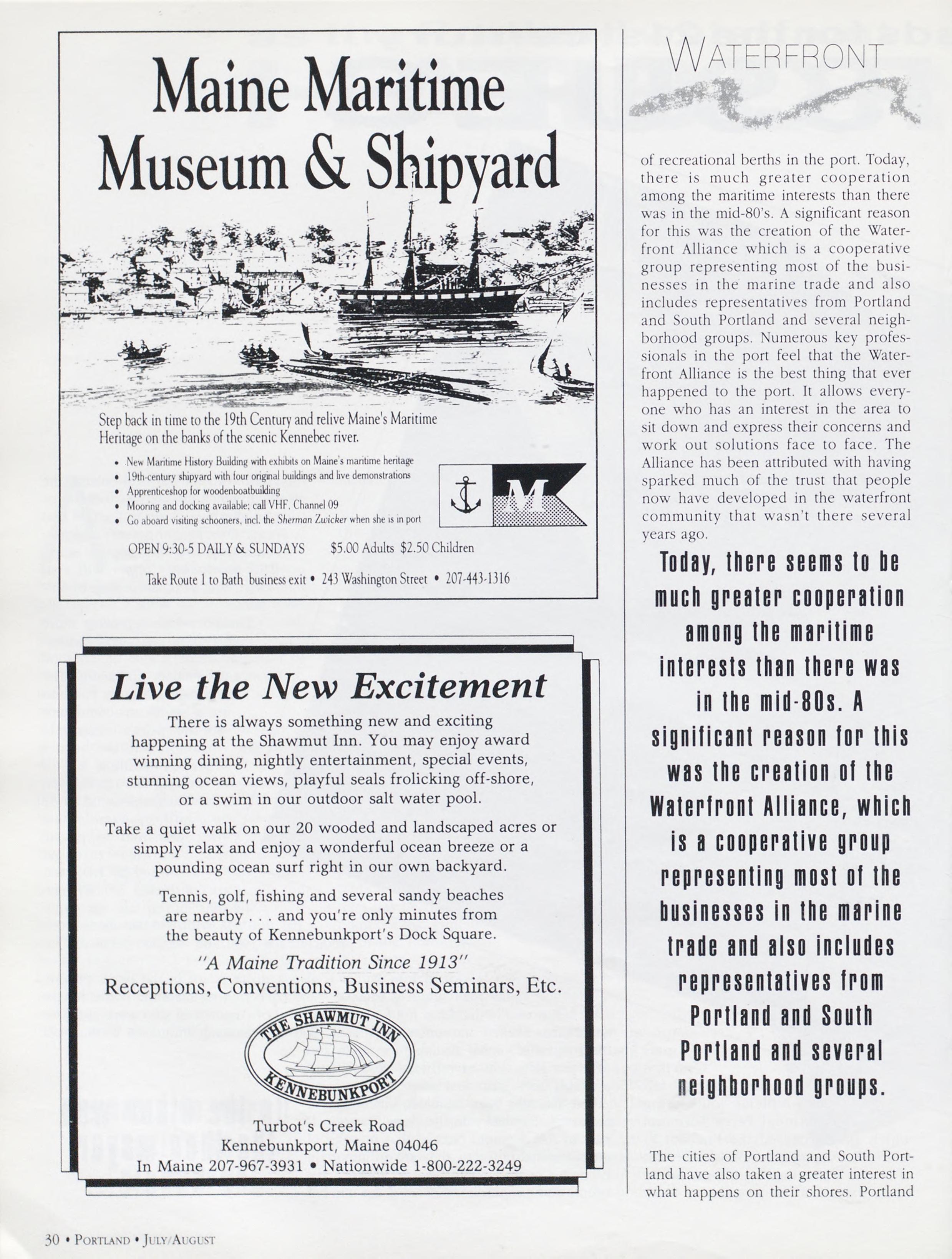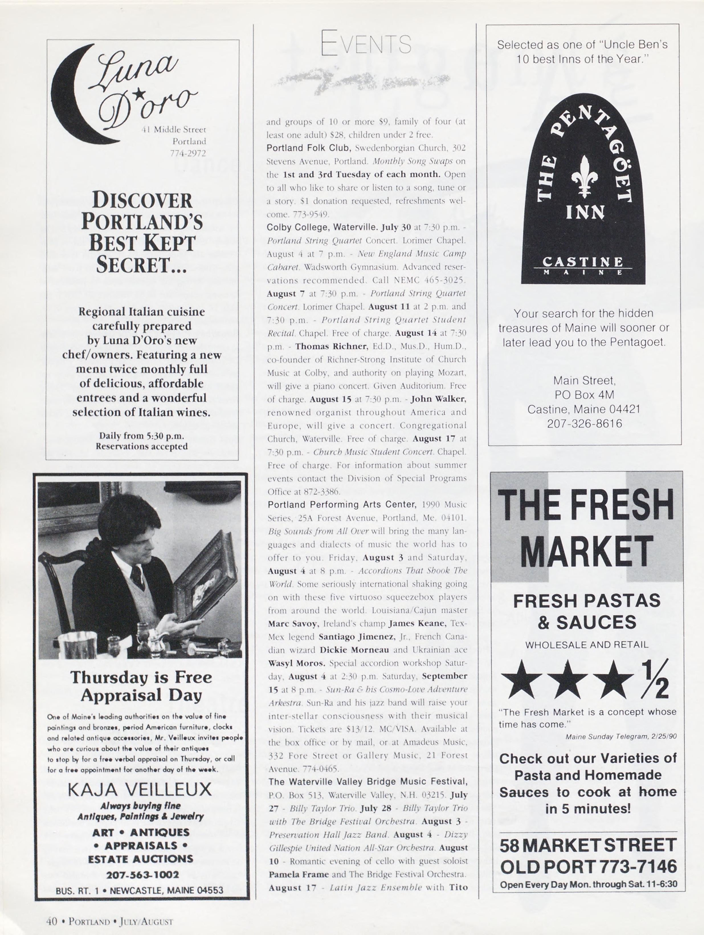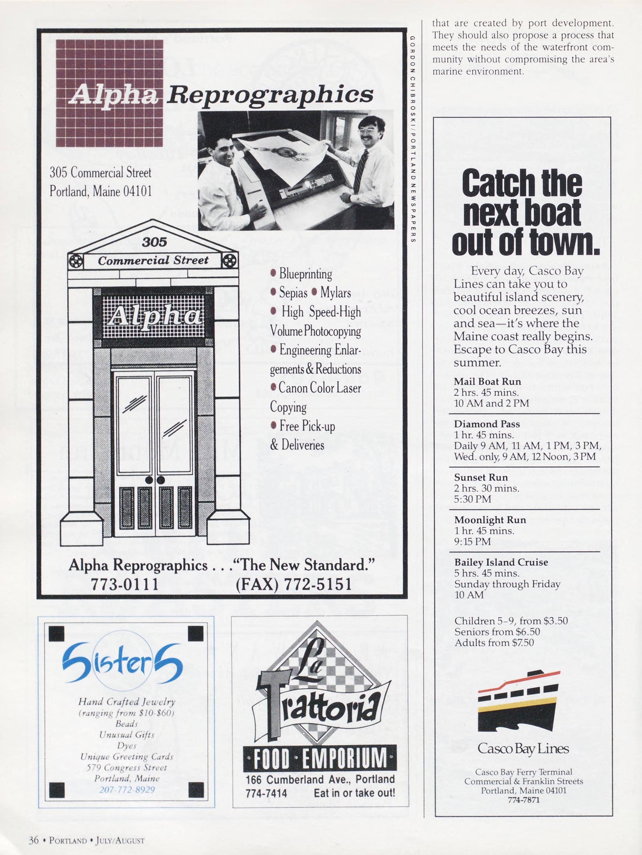 NewsstandcoverdateJulvAugust,Vol5.No.5.©1990 PORT¬ LAND Magazine ismailedatthird-classmailratesinPortland,ME 0-1101(ISSN(>88’-53-10).Theopinionsexpressedinarticlesare thoseofauthorsanddonotrepresenteditorial{xxsitionsof PORT¬ LAND Magazine Nothinginthisissuemaylx-reprintedinwholeor inpartwithoutwrittenpermissionof(hepublishersSubmissions welcome,butnoresponsibilityistakenforunsolicitedmaterials