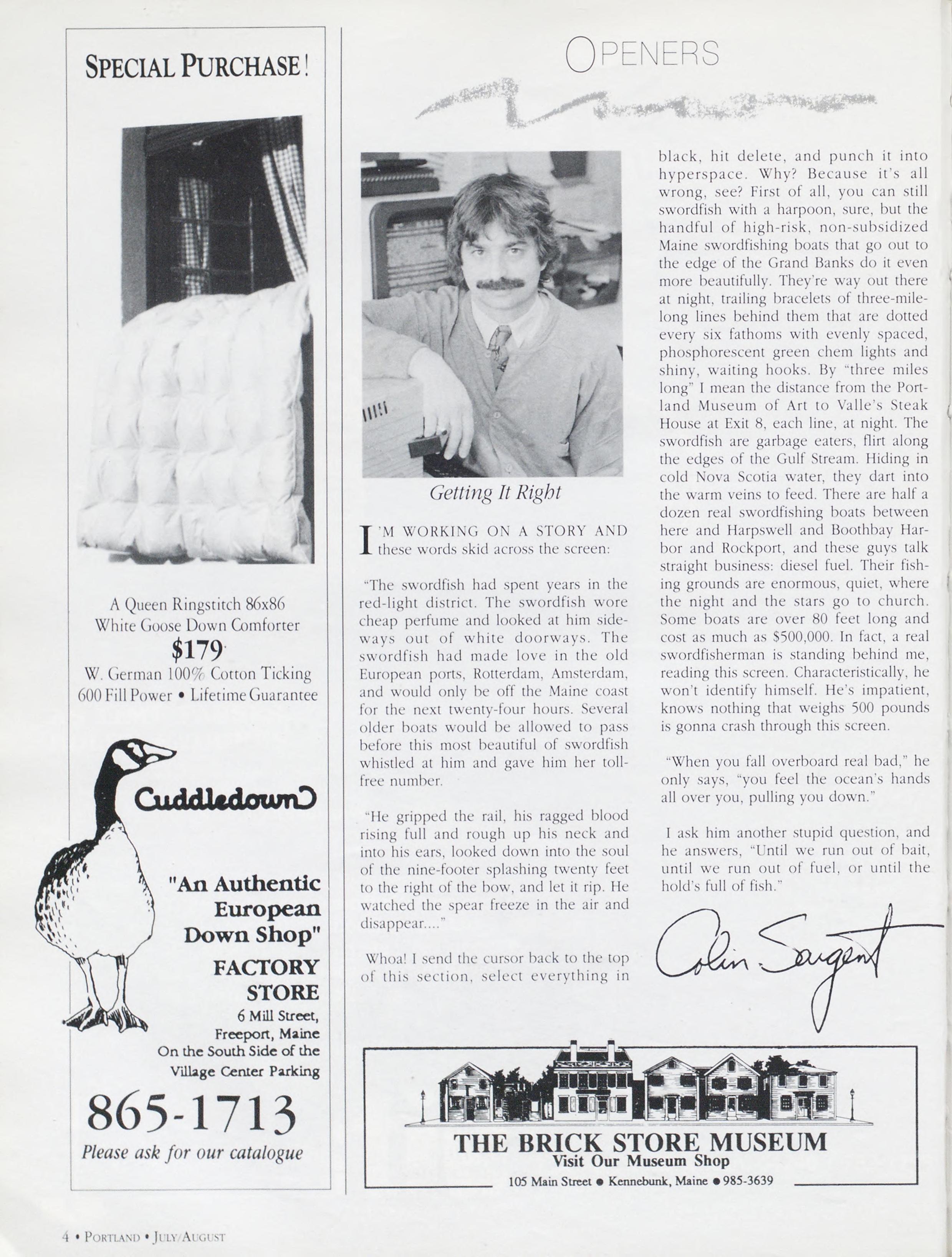 black,hitdelete,andpunchitinto hyperspace. Why? Because it’s all wrong,see?Firstofall.youcanstill swordfishwithaharpoon,sure,butthe handfulofhigh-risk,non-subsidized Maine.swordfishingboatsthatgooutto theedgeoftheGrandBanksdoiteven morebeautifully.They'rewayoutthere atnight,trailingbraceletsofthree-milelonglinesbehindthemthataredotted everysixfathomswithevenlyspaced, phosphorescentgreenchemlightsand shiny,waitinghooks.By"threemiles long"ImeanthedistancefromthePort¬ landMuseumofArttoValle’sSteak HouseatExit8,eachline,atnight.The swordfisharegarbageeaters,flirtalong theedgesoftheGulfStream.Hidingin coldNovaScotiawater,theydartinto thewarmveinstofeed.Therearehalfa dozenrealswordfishingboatsbetween hereandHarpswellandBoothbayHar¬ borandRockport,andtheseguystalk straightbusiness:dieselfuel.Theirfish¬ inggroundsareenormous,quiet,where thenightandthestarsgotochurch. Someboatsareover80feetlongand costasmuchas$500,000.Infact,areal swordfishermanisstandingbehindme, readingthisscreen.Characteristically,he won'tidentifyhimself.He’simpatient, knowsnothingthatweighs500pounds isgonnacrashthroughthisscreen.