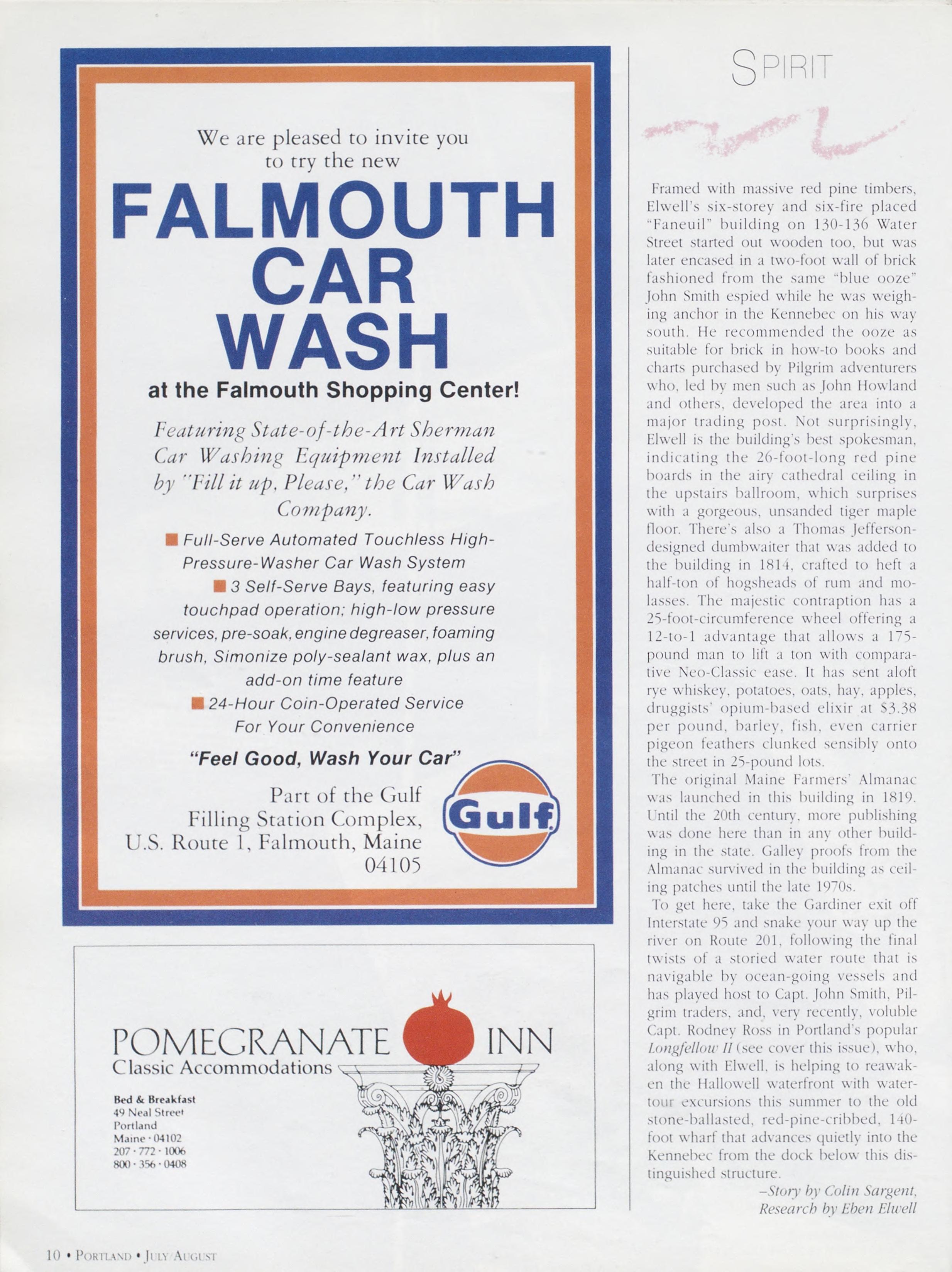 framedwithmassiveredpinetimbers, Elwell’ssix-storeyandsix-fireplaced "Eaneuil"buildingon130-136Waler Streetstartedoutwoodentoo,butwas laterencasedinatwo-footwallofbrick fashionedfromthesame"blueooze” JohnSmithespiedwhilehewasweigh¬ inganchorintheKennebeconhisway south. He recommended the ooze as suitableforbrickinhow-tobooksand chartspurchasedbyPilgrimadventurers who.ledbymensuchasJohnHowland andothers,developedtheareaintoa majortradingpost.Xotsurprisingly, [dwellisthebuilding'sbestspokesman, indicatingthe26-foot-longredpine boardsintheairycathedralceilingin theupstairsballroom,whichsurprises withagorgeous,unsandedtigermaple floor.There'salsoaThomasJeffersondesigneddumbwaiterthatwasaddedto thebuildingin1811.craftedtohefta half-tonofhogsheadsofrumandmo¬ lasses.Themajesticcontraptionhasa 25-foot-circumferencewheelofferinga 12-to-1advantagethatallowsa175poundmantoliftatonwithcompara¬ tiveNeo-Classicease.Ithassentaloft ryewhiskey,potatoes,oats,hay.apples, druggists'opium-basedelixirat$3-38 perpound,barley,fish,evencarrier pigeonfeathersclunkedsensiblyonto thestreetin25-poundlots.